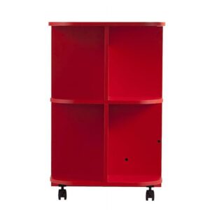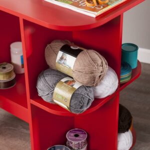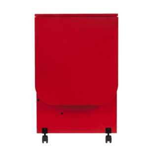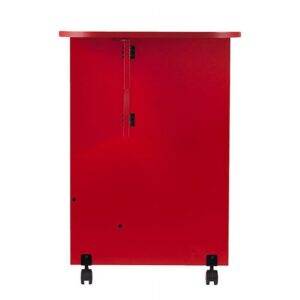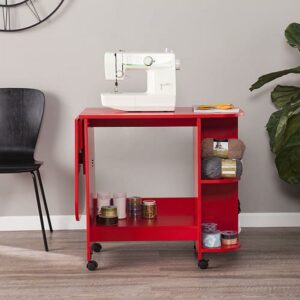 Don’t sacrifice function for style, have it all with this statement making craft station. Bold red hue makes a grand creative statement. Small space savvy, this sewing table folds down to fit into tight spaces, and expands to accommodate large fabric pieces. Side shelves tidy your craft room supplies; locking casters move your workspace where you need it, and lock it down when you’re ready to work. Craft with flair; roll this bright sewing desk into the home office, craft room, or open concept space. Sewing machine not included.