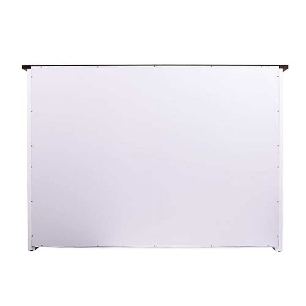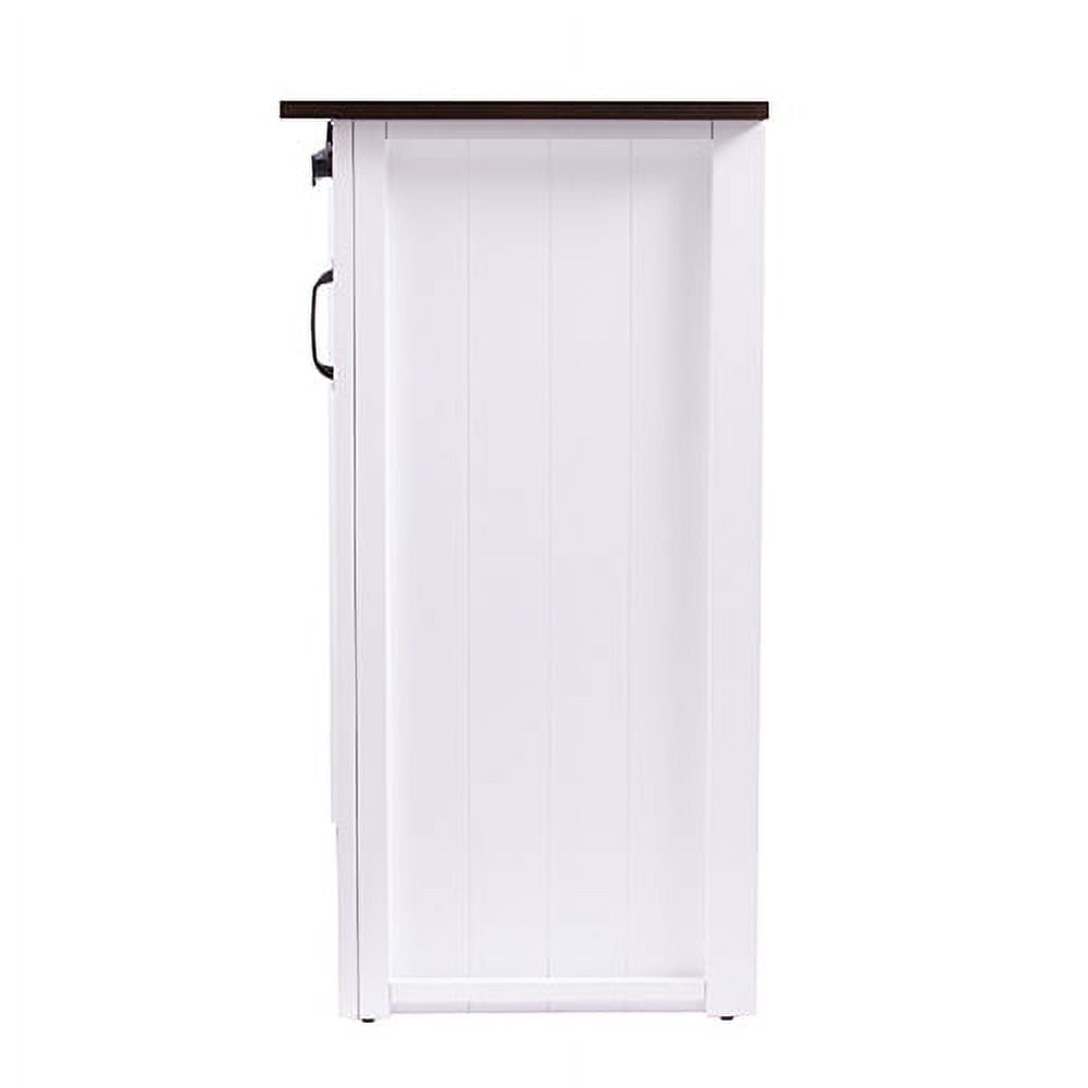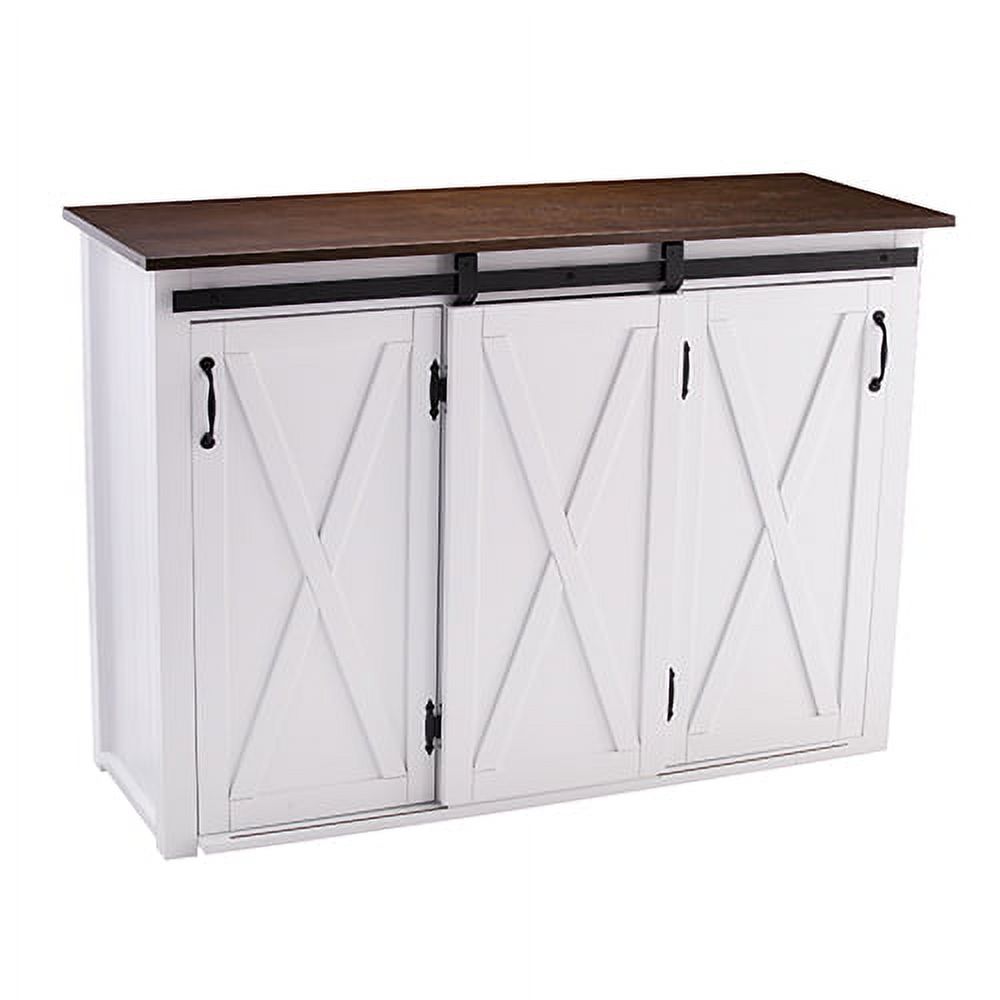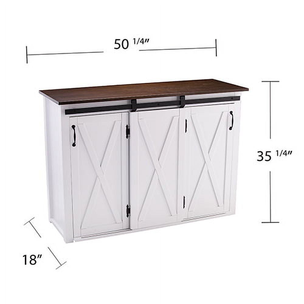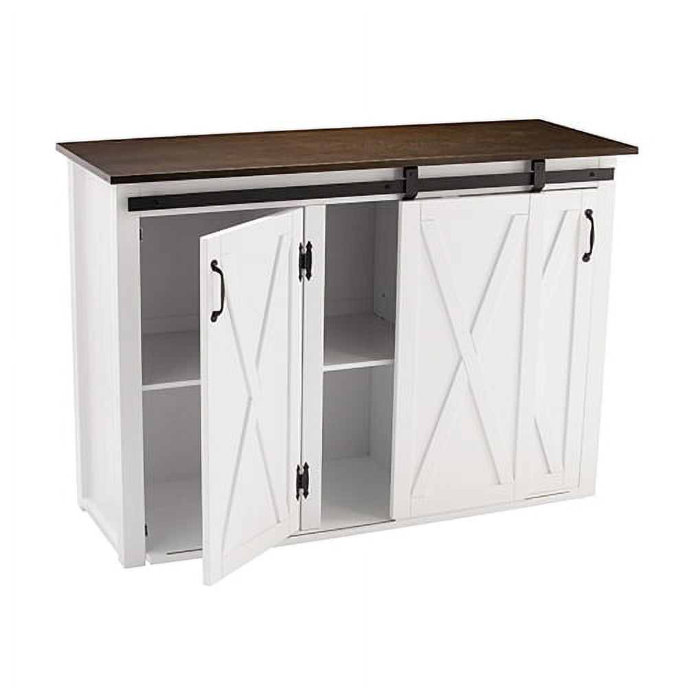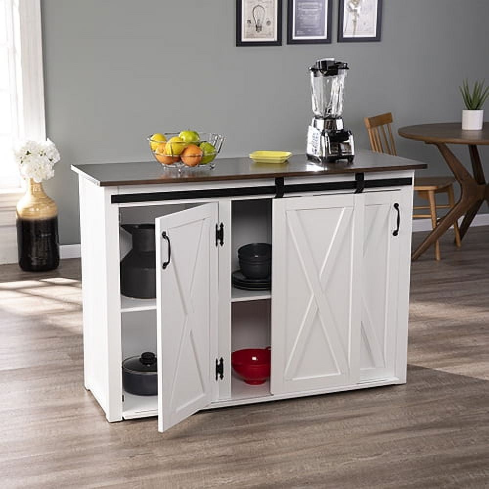 Large stationary kitchen island w/ storage Features a spacious countertop and 3 cabinets w/ 1 adjustable and 1 fixed shelf each 2 traditional cabinet doors and a sliding barn door on a functional track High contrast, two-tone finish Wood grain and finish will vary; countertop is not butcher block certified Kitchen, dining room, laundry room, or mudroom Modern farmhouse style Dark brown and white finish Black hardware finish Overall: 50.25″ W x 18″ D x 35.25″ H