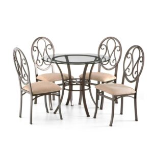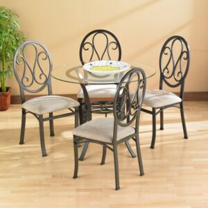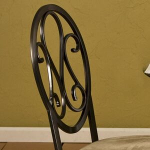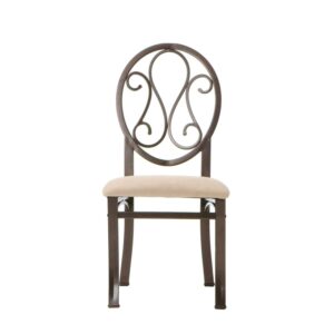 Classically styled with a modern flair, the Southern Enterprises Lucianna Dining Chairs will be an asset to just about any dining space. They feature a classic scrolled iron look on the oval backrest, like that often found in ice cream parlors or cafes. A dark chocolate powder-coated finish adds durability and a traditional look. It is also beautifully accented by the beige upholstered seat cushion. Four chairs are included in this set. Dimensions: 18.5W x 20.5D x 39H inches.