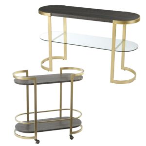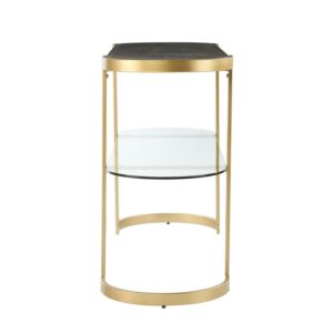 Strike gold with this contemporary console table. The spacious tabletop provides ample space for family photos and a table lamp, while the clear glass shelf holds potted plants and decor. A gold metal frame curves around the ebony tabletop, crafting a sleek look. Add a focal point to your decor with this elegant console in your entryway or open concept living space.