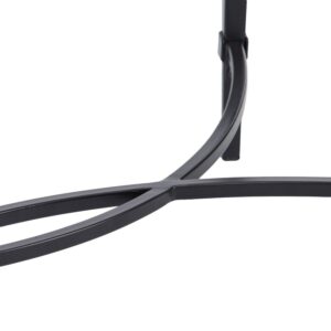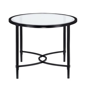 Love your curves with this elegant elliptical coffee table. The sleek black metal frame cradles wide-beveled glass tabletop while creating smooth, flowing lines. Graceful scrollwork adorns simplistic silhouette for a sophisticated take on minimalism. Visit the high-end side of metal and glass with this contemporary coffee table in your formal living room, parlour or entertainment space.