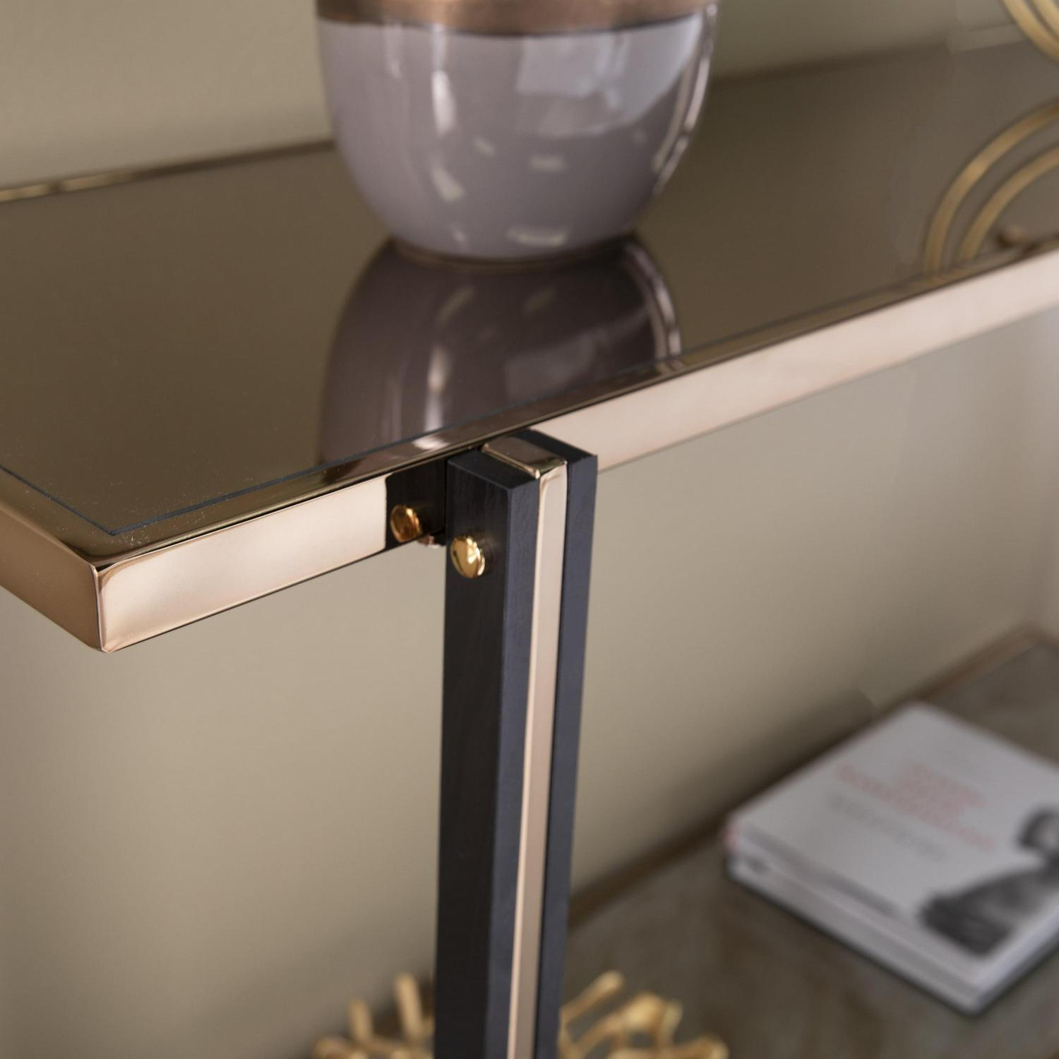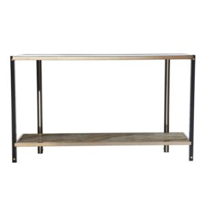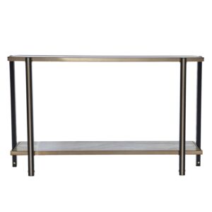 Reflect on your good taste with this mirrored console table. The spacious tabletop holds a lamp and framed photos, while the lower shelf displays decor. A champagne-hued frame wraps around the smoky mirrored tabletop, crafting an elegant design behind your living room sofa or greeting guests in your entryway. Add extra storage without sacrificing your style when you bring home this mirror-topped and faux marble console table.