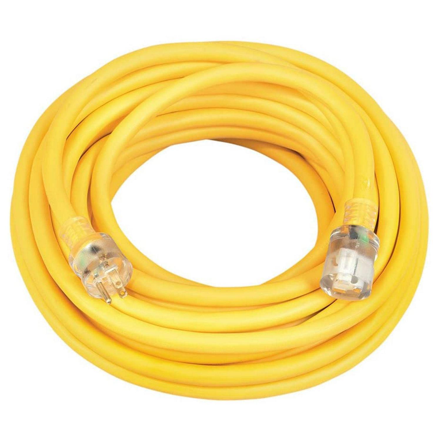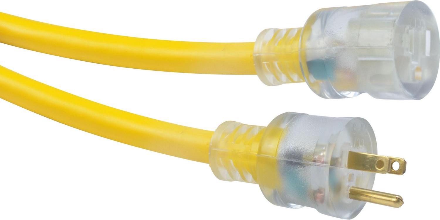 Southwire 02688 is a 50-Feet 10/3 yellow vinyl extension cord with lighted ends. 10 gauge cord gives you the ability to draw more amperage and make longer runs than with lighter duty cords. This cord features lighted ends, so you can tell if the cord has power to it before plugging into it. The lighted end lets you determine with a glance if your tool failed or the power was disconnected.