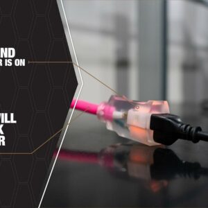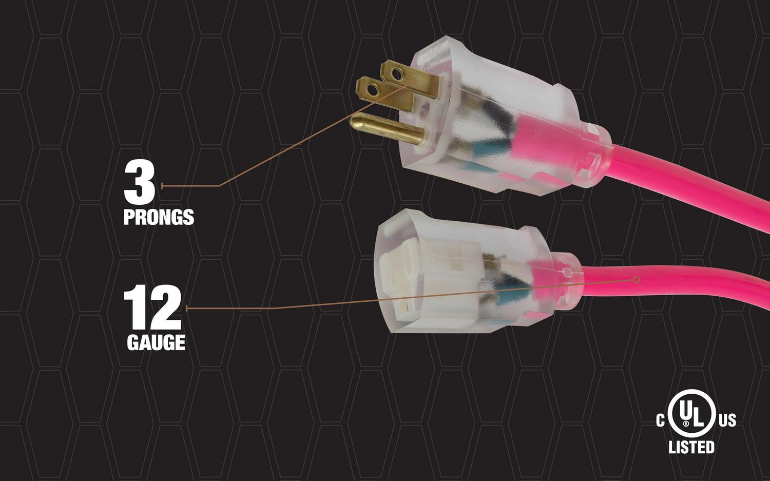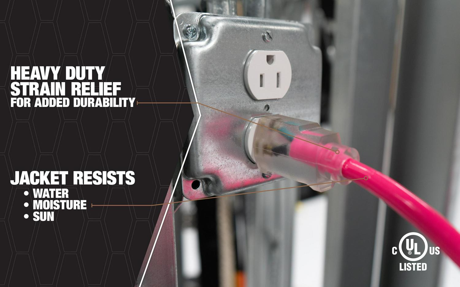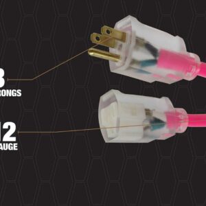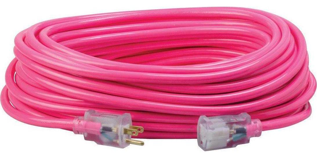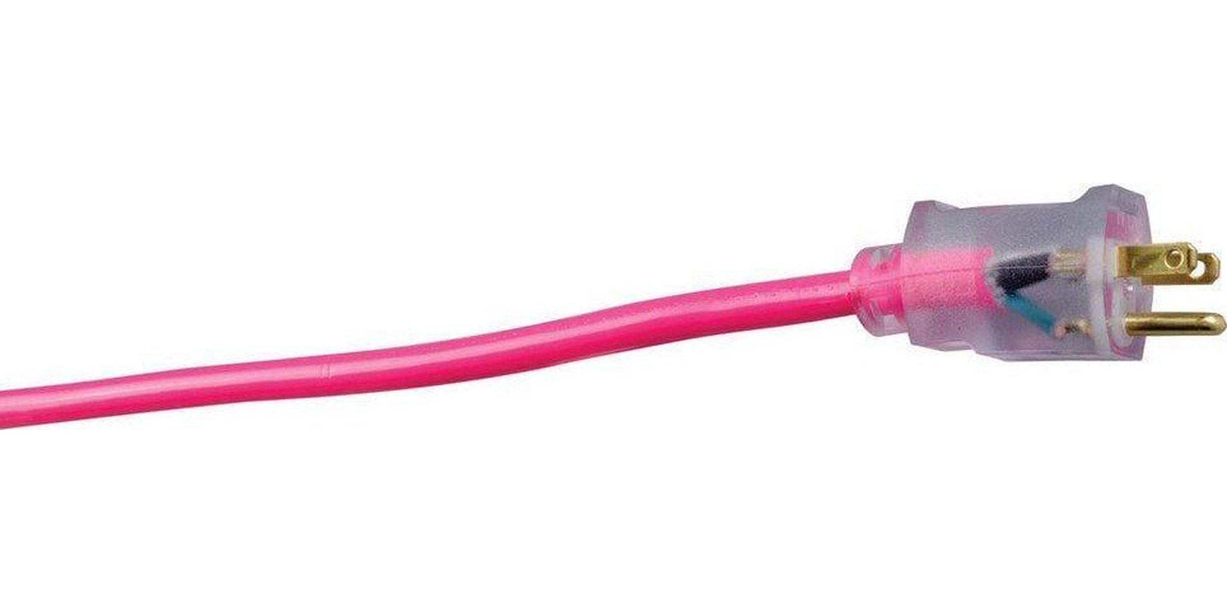 Southwire 2579SW000A 12/3 100-foot bright pink color outdoor extension cord is SJTW rated. This 100-foot extension cord has a hard service with a thermoplastic constructed jacket which makes it weather resistant for outdoor use. This contractor grade SJTW cord features a neon jacket in a variety of colors, nine different color combinations, this one in a gloss pink, adds to the safety and the feet deterrence on the job site. This outdoor extension cord features a clear molded plug with a power indicator light in the female receptacle to show that the power is on. An added feature includes a heavy duty strain relief and a reinforced blade and ground pin.