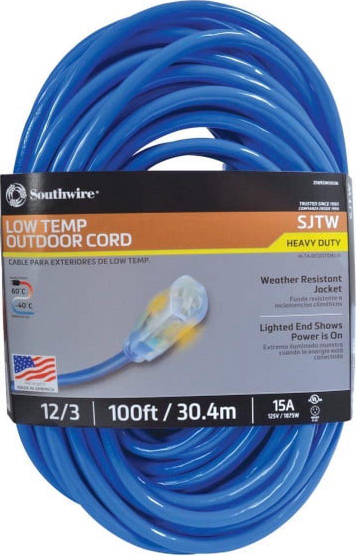 Southwire’s Coldflex heavy-duty extension cord is built to withstand -58F to 140F (-50C to 60C) harsh weather. This 100-Foot all copper wire extension cord is recommended for use with heavy-duty equipment and tools. The bright blue jacket is highly visible, which provides extra safety and prevents loss on the job site or even in the snow.