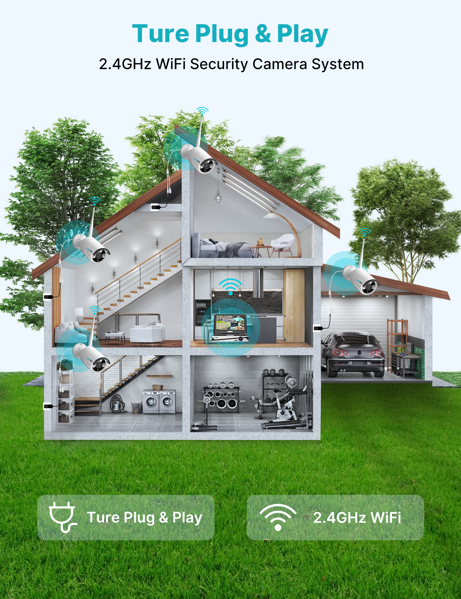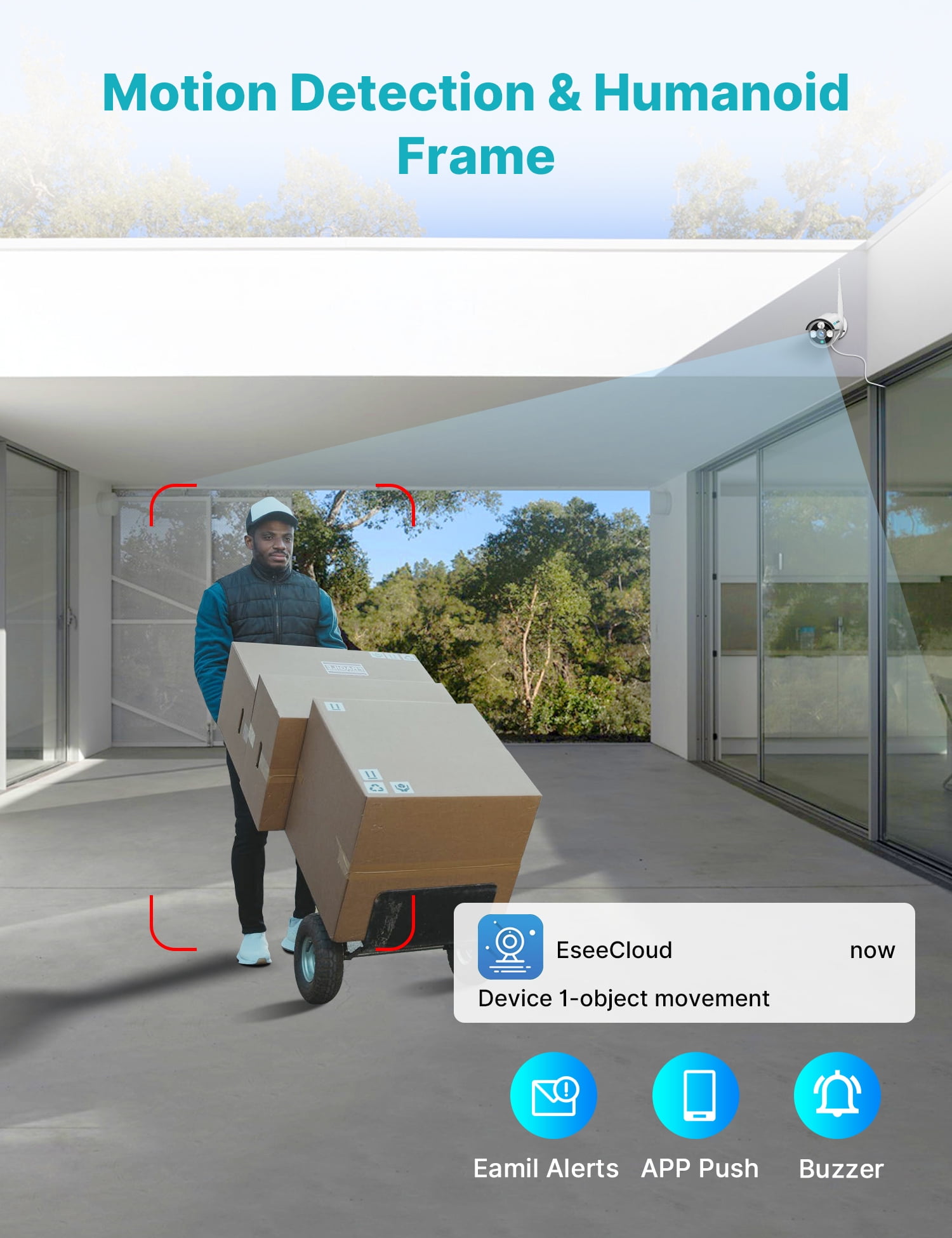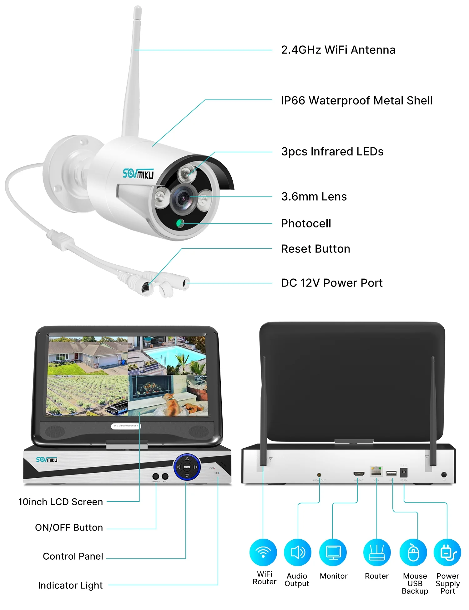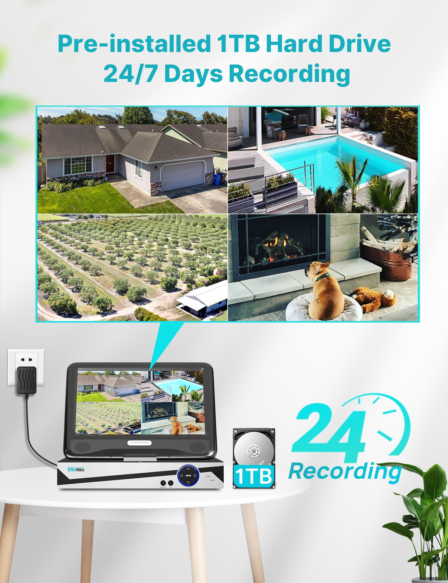 Note 1: this security camera system need to be plugged in the power supply/outlet for 24/7 recording. Wireless Wi-Fi only means no video cable required between the cameras and recorder. Work with 2.4GHz, doesn’t work with 5G WIFI network. This security camera system with 10.1 inches monitor and 1TB hard drive disk, just plug the cameras and NVR into the power supply, it will auto-paired, truly plug and play, easy for you to configure your system. 10.1″ monitor allow you to view 1, or 4, or 6, or 8, or 10 split image screen at the same time. And a preinstalled 1TB hard drive disk allow you to record 30 days of 24/7 videos, and it will overwrite automatically when the hard drive it full. So you don’t have to buy a additional hard drive to get the record video and playback remotely. No subscription fee will occurred. This home security camera system will keep you safe and well protected, by featuring 3MP high definition lens, crisp IR night vision up to 64fts, supporting human detection and alert on your phone APP and registered email address. And dual wireless WiFi functionality ensures that signals passing between the camera and NVR remain clear up to 164fts away. Waterproof& HD Video: Records in 1296P Full HD to capture sharp and crisp images, provide crystal-clear HD live video, in order to crisp smooth footage day and night the bullet cameras build in 3 array IR cut filter with auto switch. Up to 15m Night Vision, The IP 66 weatherproof aluminum housing material to keep Indoors & Outdoors recording. 1TB & Cloud Storage: Outdoor security camera system is preinstalled 1TB Hard Drive, will store 24/7 days time continuous loop recording, which will loop about 30 days. 7-days free cloud storage for one channel camera, each channel need buy cloud storage one by one One-way Audio & Work with Alexa: Outdoor security camera system also allows you to see and listen to people on your property remotely. Alexa function allow you to check on the Echo show by vioce control Remotely Anytime and Anywhere: Wireless surveillance camera system allows you to view the live video remotely anytime and anywhere by Phone and Pad (available for Android & IOS system). Download free APP “EseeCloud” from Android Google Play or Apple APP Store. Register a New Account, then add by device ID. You can view the Video by WiFi or 4G/5G Network. Supporting Windows and MAC OS system computer download Eseecloud software to remotely check . Camera Specifications: Lens: f= 3.6mm Viewing Angle: 75° Frame Rate: up to 15fps Image Sensor: 1/2.7″ CMOS Sensor Video Quality: 3.0Megapixel (2304*1296) Microphone: Yes (Audio Range up to 6-9ft) Weatherproof: Yes. Power Supply Output: DC12V-1A NVR Specifications: 10.1″ LCD Monitor with 1TB Hard Drive(Support SATA 2.5” or 3.5” ,up to 6TB HDD) Working Temperature: -25°C +50°C (13°-122°F) USB Port: 1 x USB 2.0 Synchronous Playback: 4 Channels at the Same Time Remote Access: iPhone/Android Phone App, Windows/Mac PC, IE PC Client/APP: Eseecloud Support Audio Recording Video Outputs: Monitor or HDTV via VGA, HDMI Support Video Preview/Recording/Playback/USB Backup Power Supply Output: DC12V-2A Package List: 1 x Monitor NVR(1TB hard drive preinstalled) 1 x 3.3 Feet Power Supply (12V-2000mA) for NVR 4 x 10 Feet Power Supply (12V-1000mA) Power adapter for Cameras 4 x Cameras 1 x 3M 9DB Extension Antenna 1 x Mouse / User Manual / HDMI cable / 3.2 Feet Network Cable 2 x Warning stickers