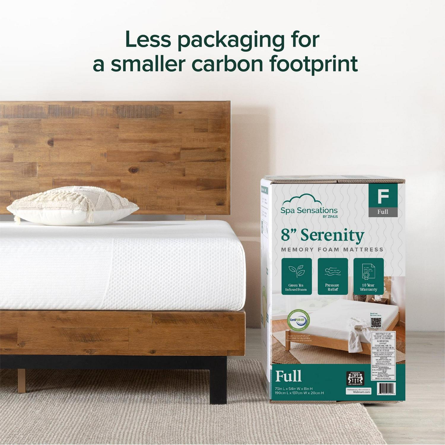 Pamper yourself with a refreshing night of sleep with the Spa Sensations Serenity By Zinus 8″ Memory Foam Mattress. It features premium memory foam that contours to your body shape and provides soothing relief to pressure points. Infused with green tea, the memory foam is sure to leave your mattress feeling fresh while you relax and unwind. It rests atop durable high-density base foam that will ensure many restful nights to come. For added ease, it comes folded and compressed in an exclusive Zinus WonderBox . It ships right to your door in a package so compact it fits on your doormat! Not only is delivery and setup a total breeze, WonderBox packaging is 23% smaller than other mattresses in a box, so you ll also enjoy the satisfaction of reducing your carbon footprint. What s more, the foam in this adult mattress is CertiPUR-US certified, so you can enjoy both healthy air quality and peace of mind from your sustainably-sourced mattress. It is also backed by our 10-year worry-free warranty.