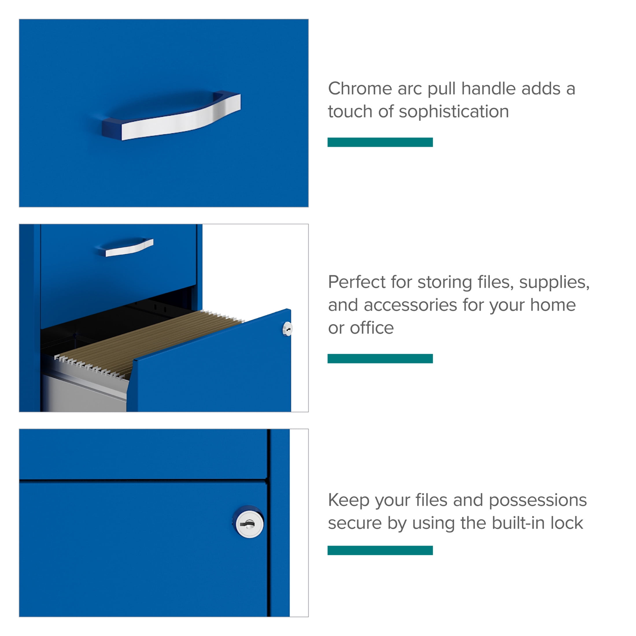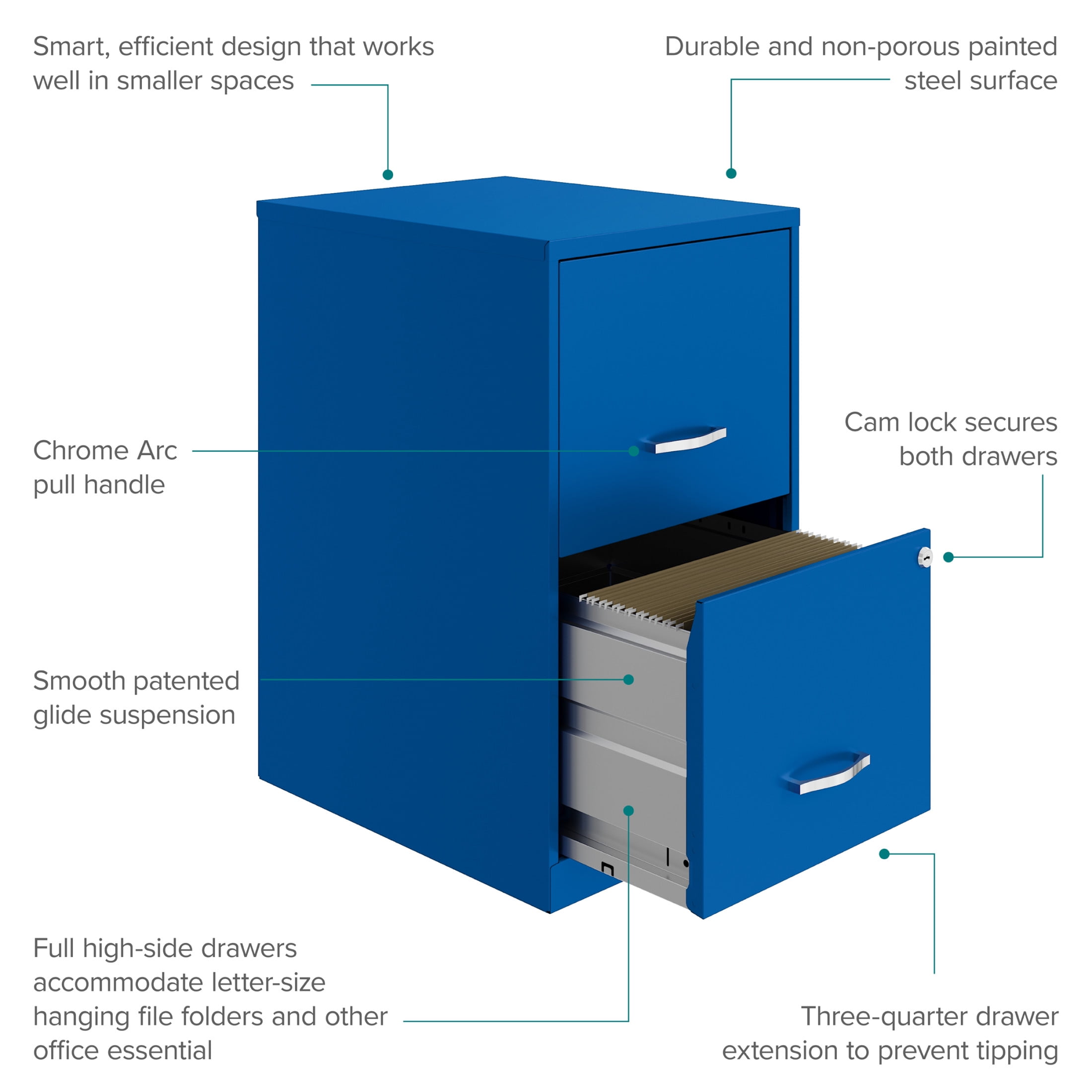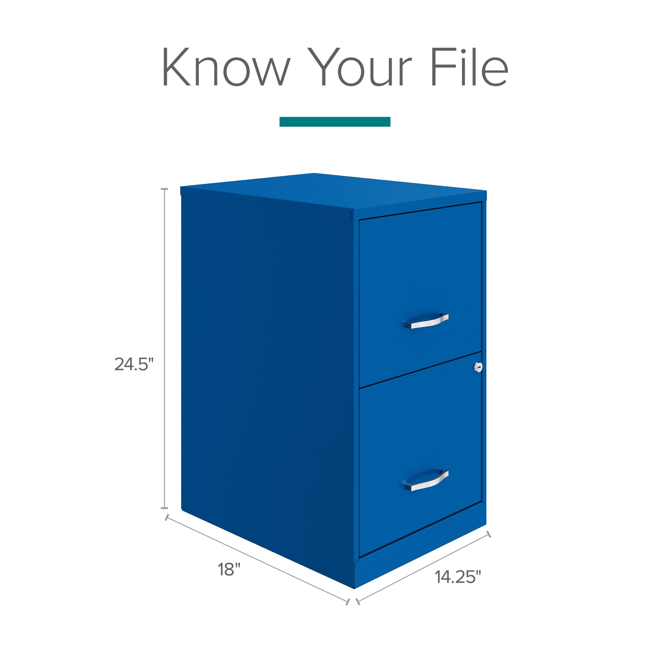 Vertical file drawers accommodate letter-size hanging file folders Full high-side drawers provide storage solutions for other office essentials Smooth patented glide suspension drawer slides Cam lock secures both drawers Three-quarter drawer extension Tucks under most work surfaces and office desks. Painted steel surface is non-porous and easy to clean Fully assembled welded cabinet. Assembly of the handles required Space Solutions 18″ Deep 2 Drawer Letter Width Vertical File Cabinet, Classic Blue