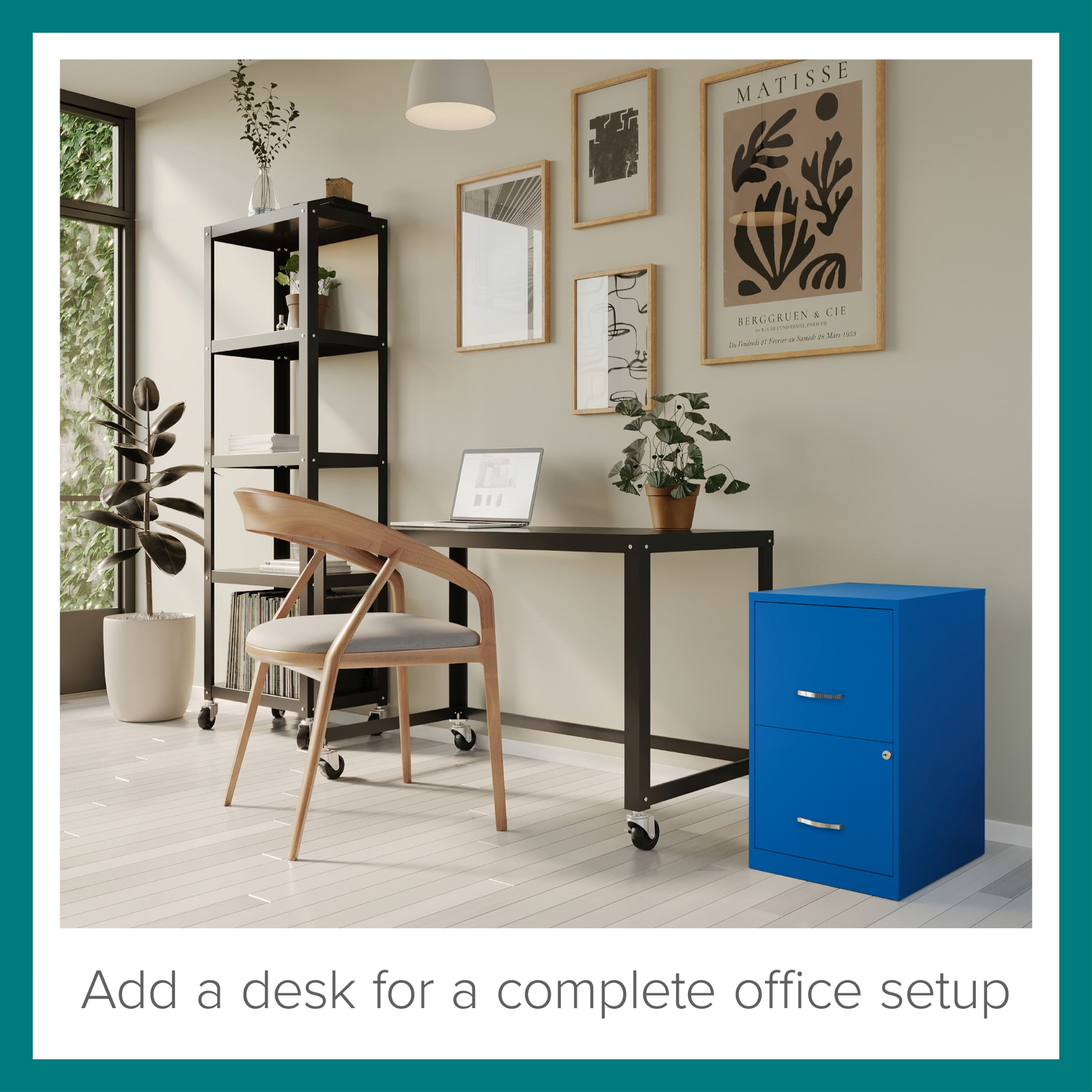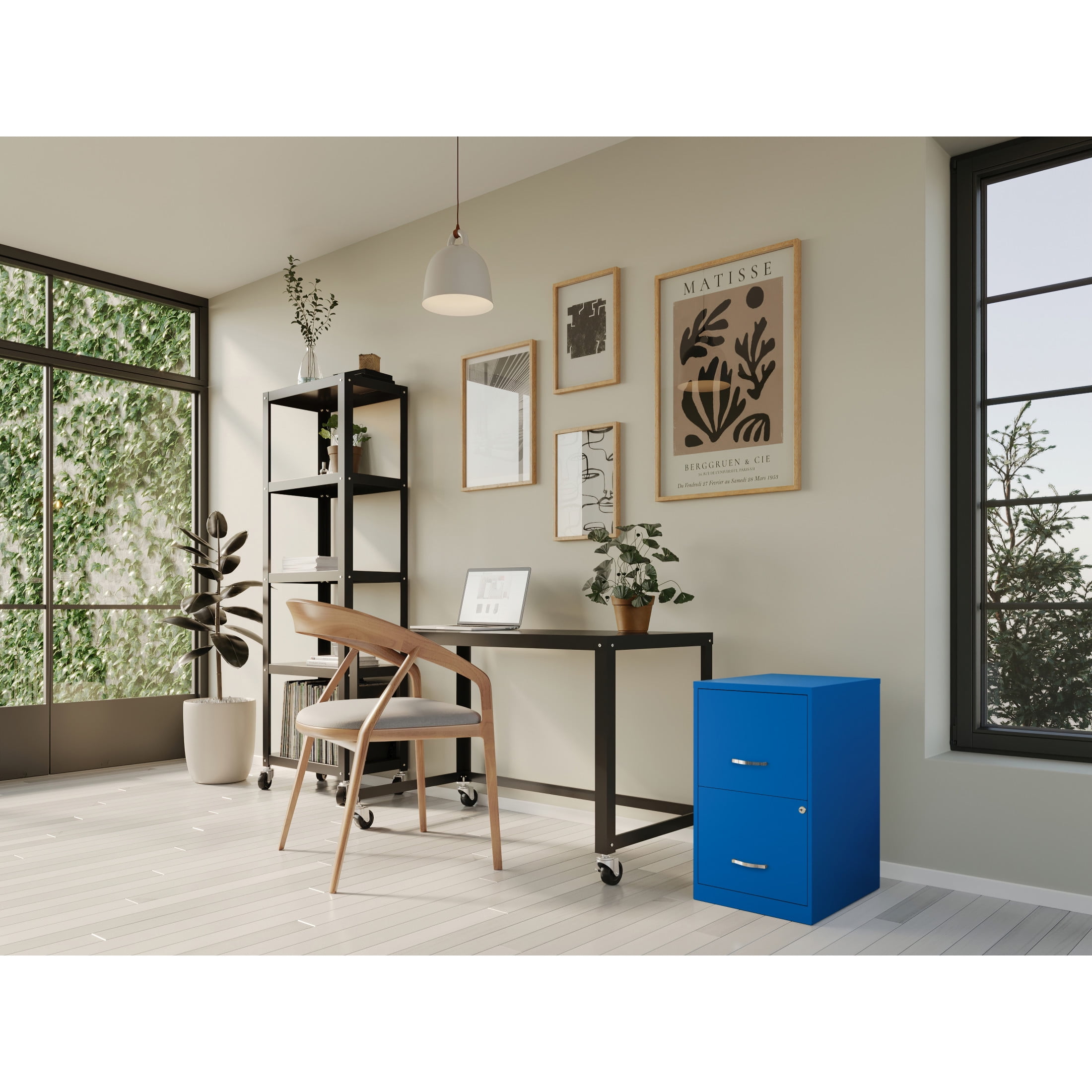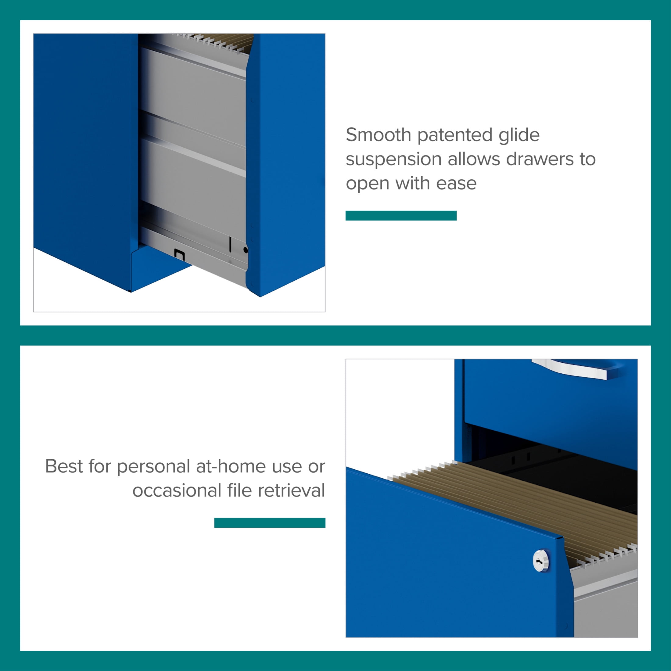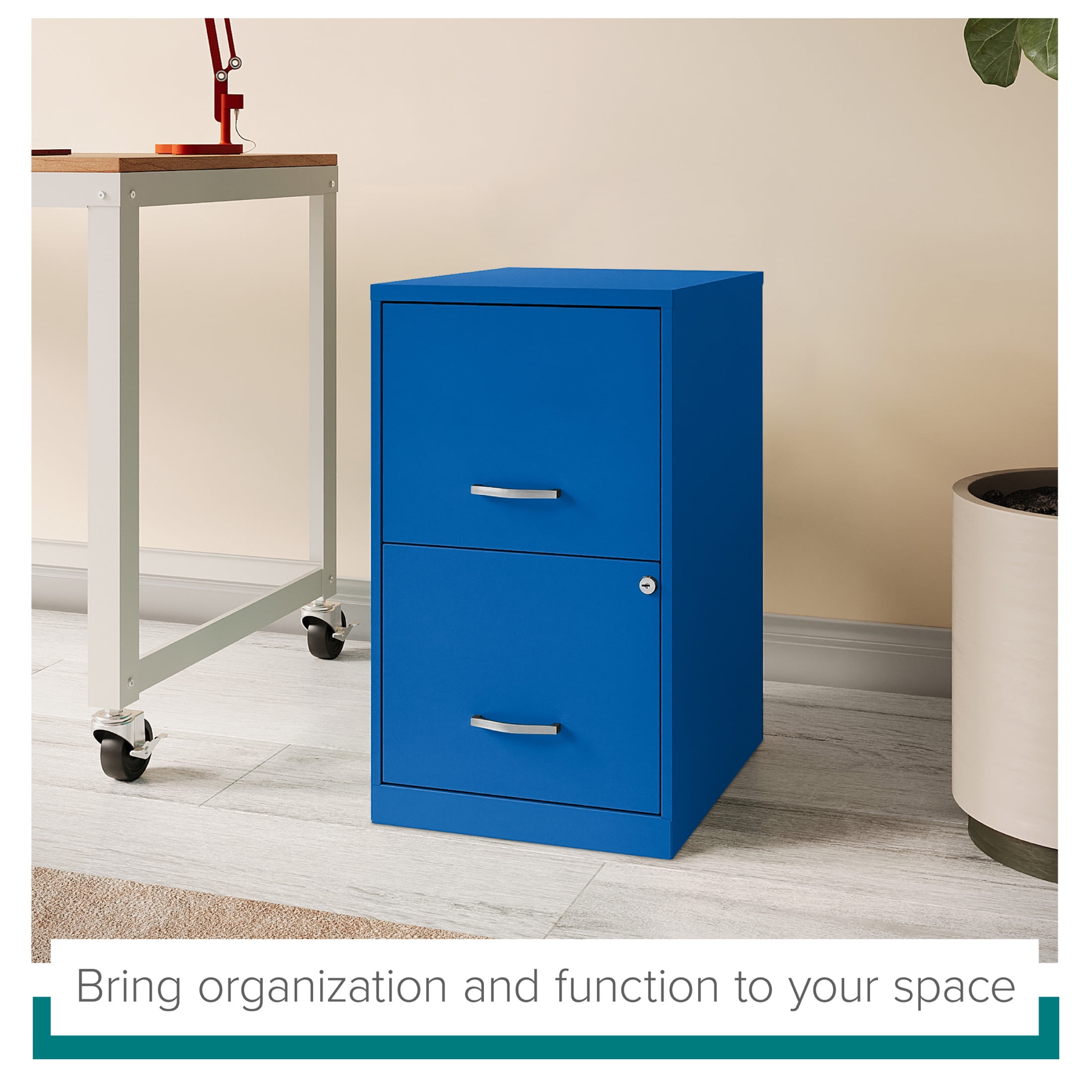 The Two Drawer Metal Vertical File Cabinet is designed for smaller professional offices or home office use. The cabinet features durable steel construction and a smart, efficient design that works well in small spaces, fitting easily under most work surfaces or office desks. Each drawer features high-sides to accommodate letter-sized hanging files. The drawers are also a perfect storage solution for other office essentials. Using a patented glide suspension, the drawer slides open and close smoothly with a three-quarter drawer extension to prevent tipping. In addition, you can keep your files and possessions secure with its locking drawers. The painted steel surface is non-porous and easy to clean. Bring storage and organization to your home or office with this stylish two-drawer file cabinet. Your office supplies and files will always be organized and within reach. Color: Classic Blue