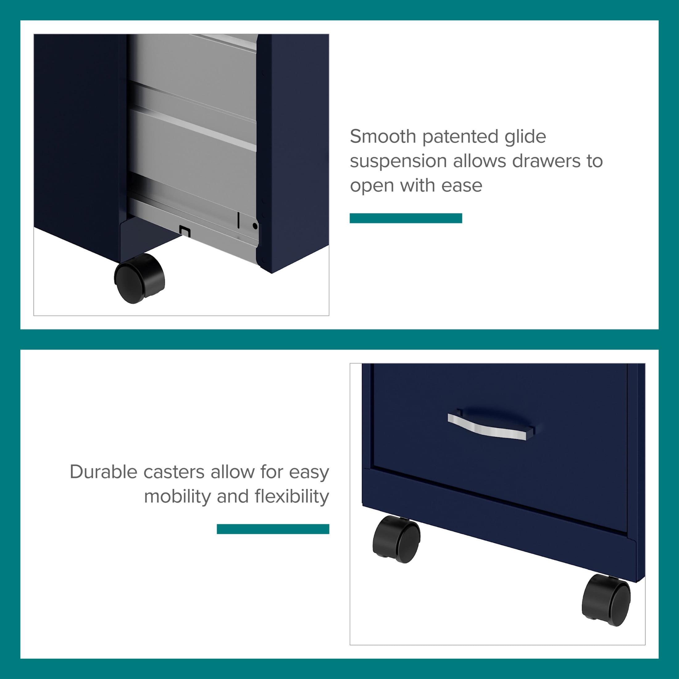 The Mobile Two Drawer Metal Vertical File Cabinet is designed for smaller professional offices or home office use. The cabinet features durable steel construction and a smart, efficient design that works well in small spaces, fitting easily under most work surfaces or office desks. Each drawer features high-sides to accommodate letter-sized hanging files. The drawers are also a perfect storage solution for other office essentials. Using a patented glide suspension, the drawer slides open and close smoothly with a three-quarter drawer extension to prevent tipping. In addition, you can keep your files and possessions secure with its locking drawers. The additional wheels that come with this file cabinet are both stylish and functional, which makes it easy to move around your home or office. The painted steel surface is non-porous and easy to clean. Bring storage and organization to your home or office with this stylish mobile two-drawer file cabinet. Your office supplies and files will always be organized and within reach. Color: Navy