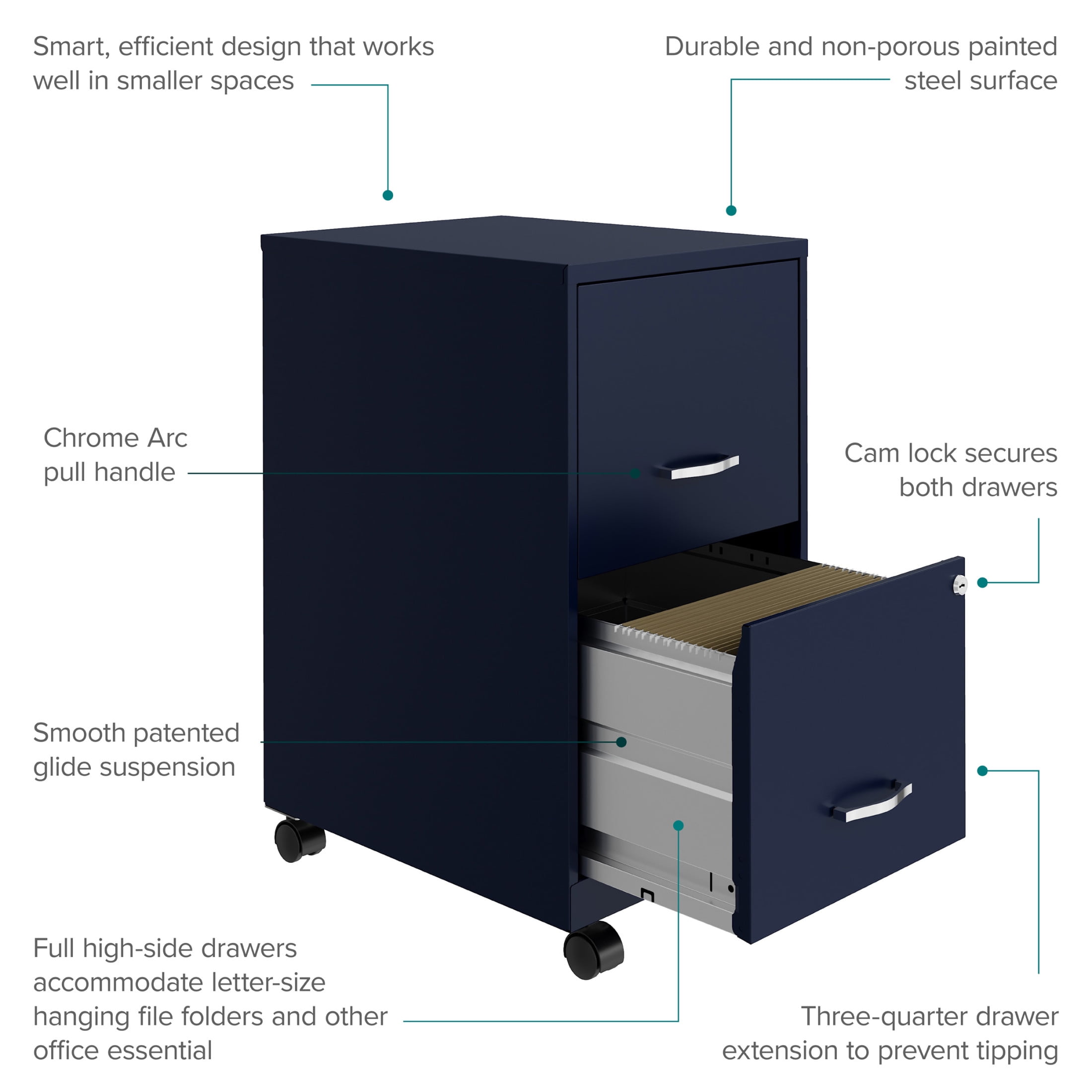 Vertical file drawers accommodate letter-size hanging file folders Full high-side drawers provide storage solutions for other office essentials Smooth patented glide suspension drawer slides Cam lock secures both drawers Three-quarter drawer extension Tucks under most work surfaces and office desks with easy roll casters Painted steel surface is non-porous and easy to clean Fully assembled welded cabinet. Assembly of the handles and optional casters required Space Solutions 18″ Deep 2 Drawer Mobile Letter Width Vertical File Cabinet, Navy