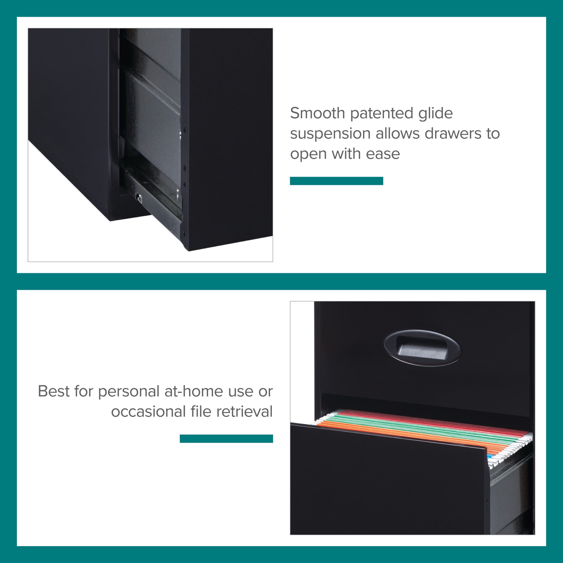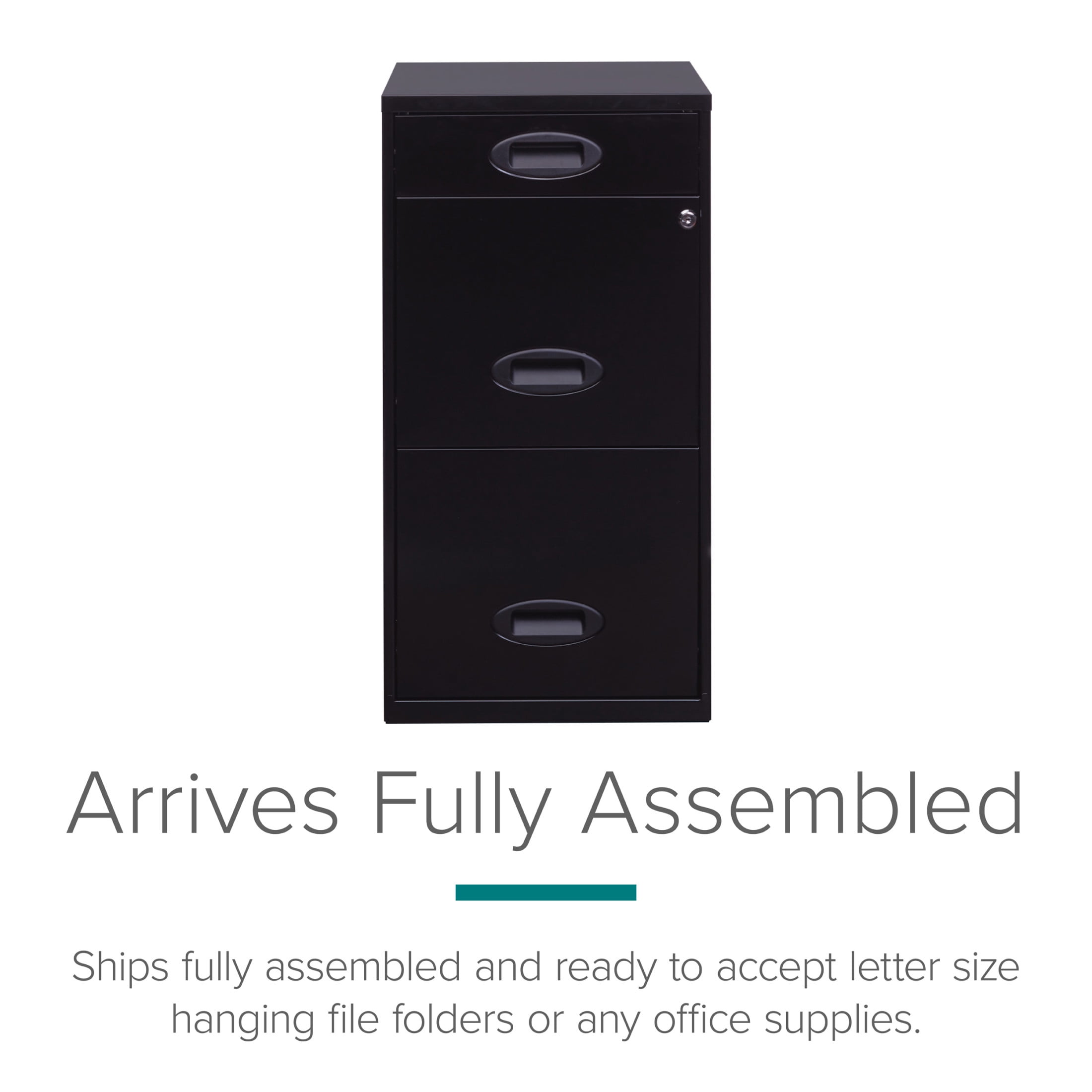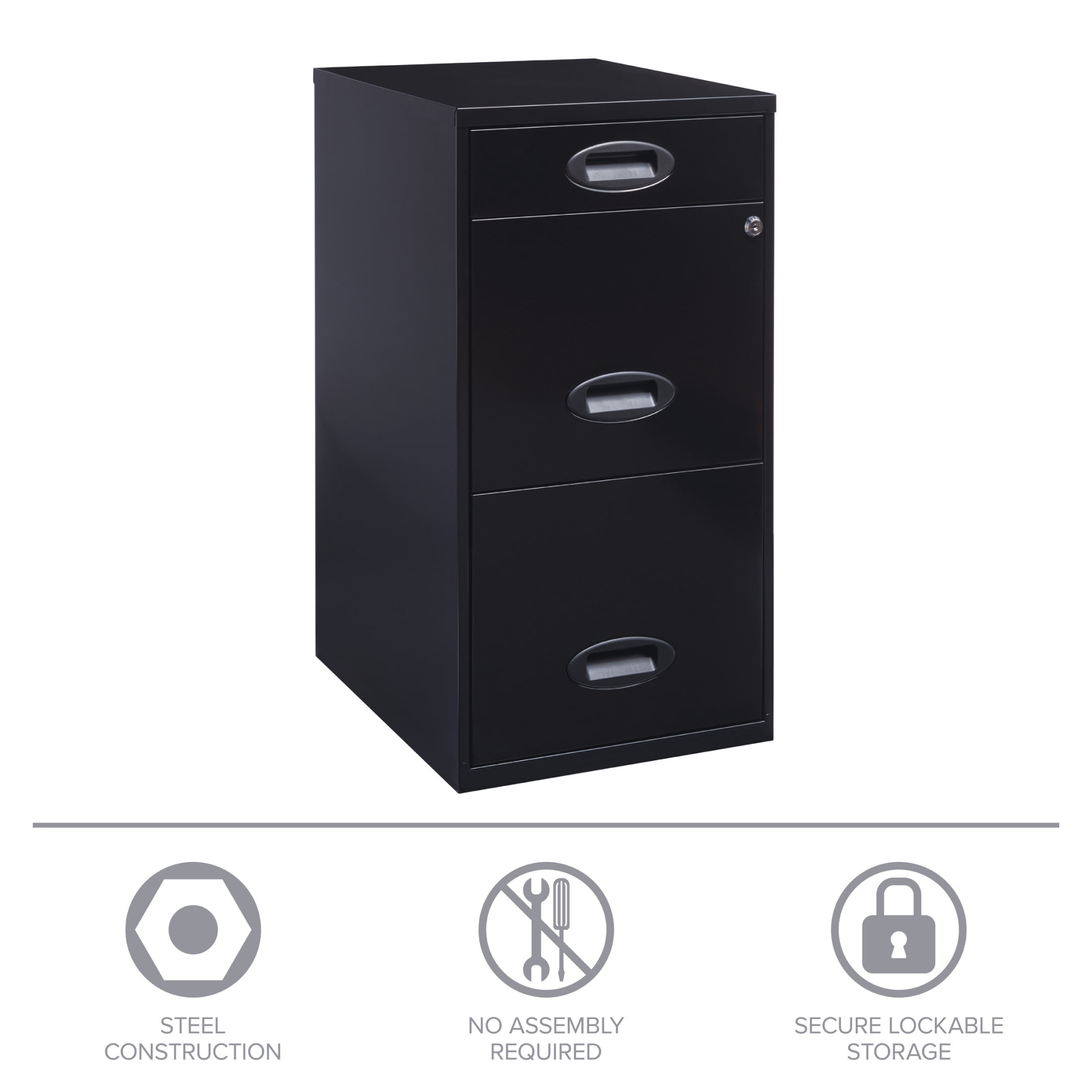 The Three Drawer Metal File Cabinet is a multi-functional storage solution perfect for files, office supplies, and accessories for your small professional office or home office. Featuring two file drawers and one storage drawer, this file cabinet features steel construction and a smart, efficient design. Our compact filing cabinet works well in small spaces and fits under most work surfaces or office desks. Each drawer features high-sides to accommodate letter-sized hanging files. The top accessory drawer is perfect for office storage and organization. Using a patented glide suspension, the drawers have a smooth open and close slide with a three-quarter drawer extension to prevent tipping. In addition, you can keep your files and possessions secure by using the built-in lock for the top two drawers. The painted steel surface is non-porous and easy to clean. Bring organization and function to your home or office with this three-drawer file cabinet. Color: Black