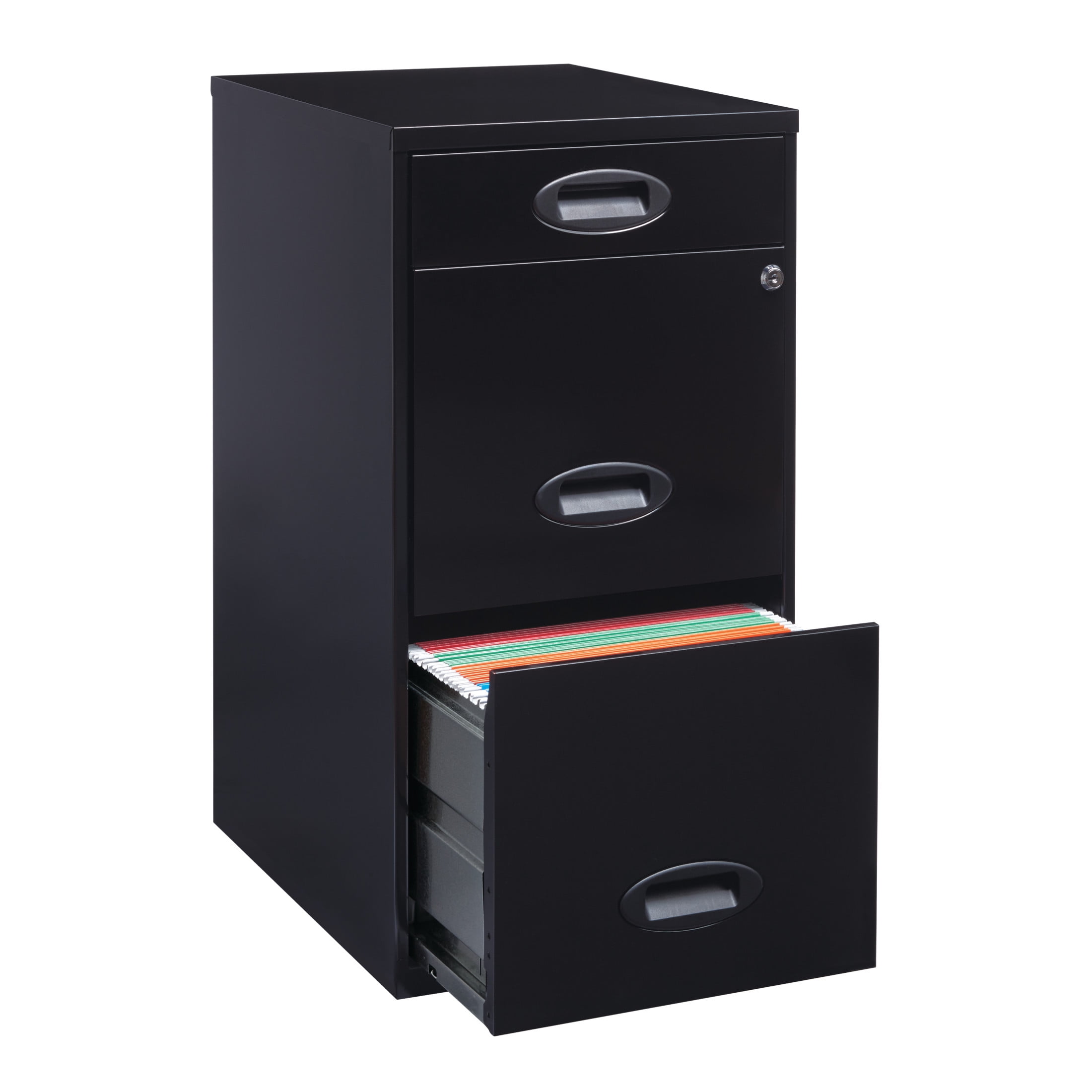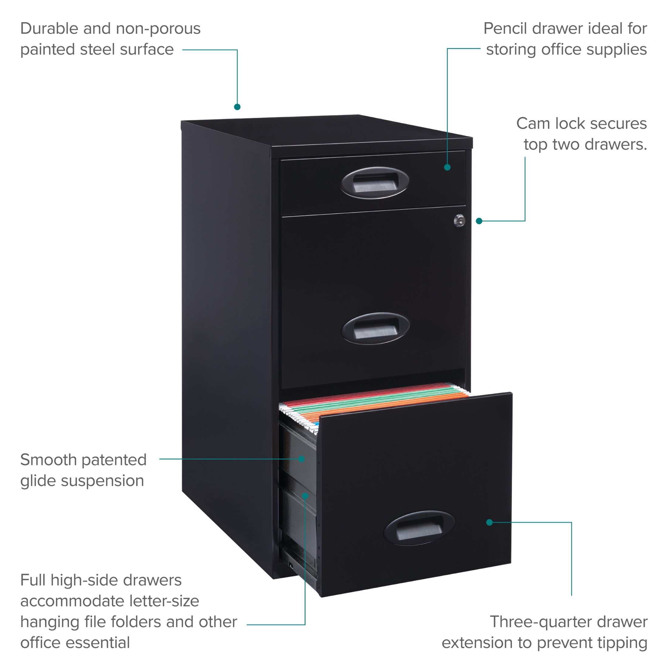Vertical file drawers accommodate letter-size hanging file folders Vertical file drawers have high-sides allowing storage for other office essentials The top pencil drawer is ideal storage and organizational solution for office supplies Smooth patented glide suspension drawer slides Cam lock secures top two drawers Tucks under most work surfaces and office desks. Painted steel surface is non-porous and easy to clean Fully assembled welded cabinet. Assembly of the handles required Space Solutions 3 Drawer Letter Width Vertical File Cabinet with Pencil Drawer, Black