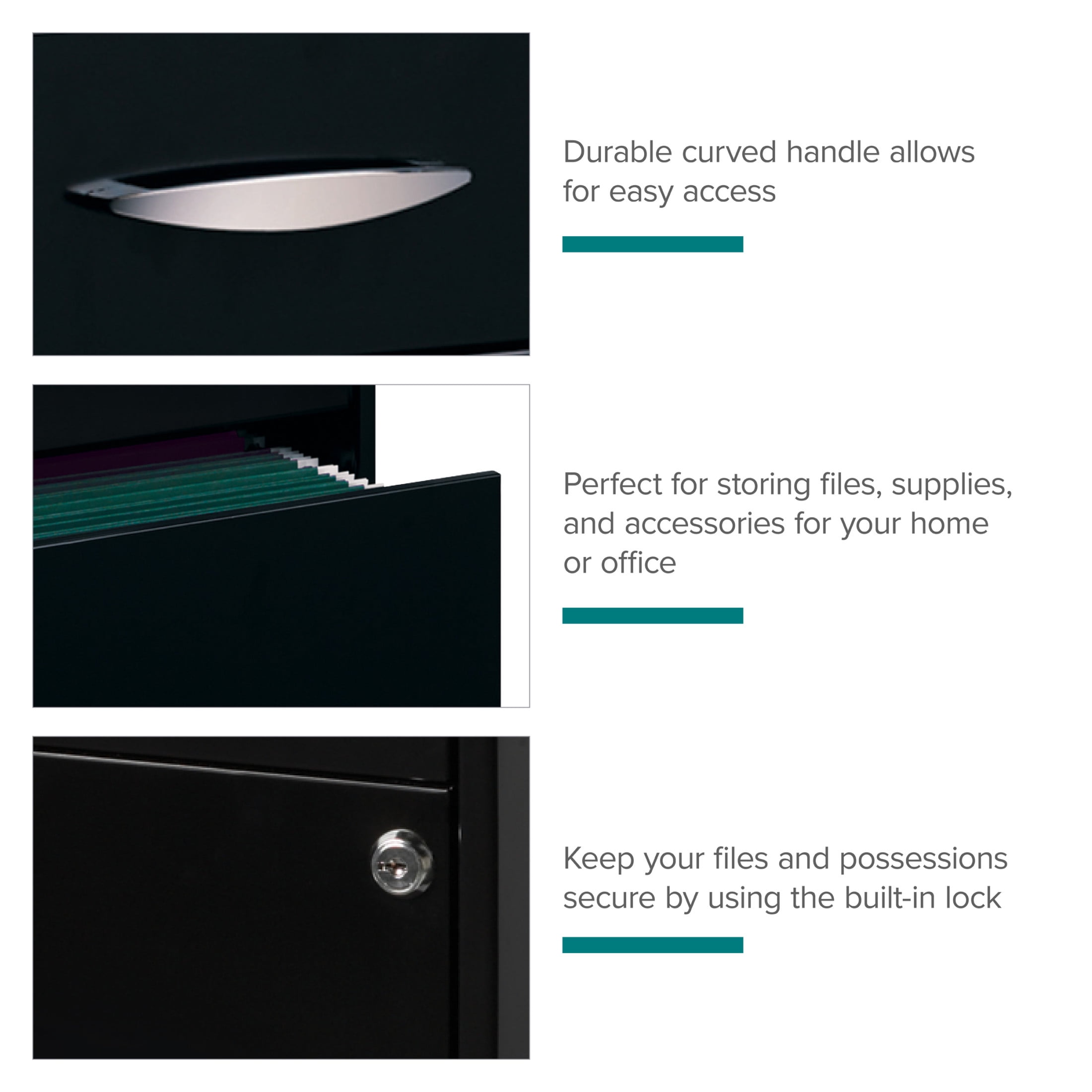 Vertical file drawers accommodate letter-size hanging file folders Vertical file drawers have high-sides allowing storage for other office essentials The top pencil drawer is ideal storage and organizational solution for office supplies Smooth patented glide suspension drawer slides Cam lock secures top two drawers Tucks under most work surfaces and office desks. Painted steel surface is non-porous and easy to clean Fully assembled welded cabinet. Assembly of the handles required Space Solutions 3 Drawer Letter Width Vertical File Cabinet with Pencil Drawer, Black