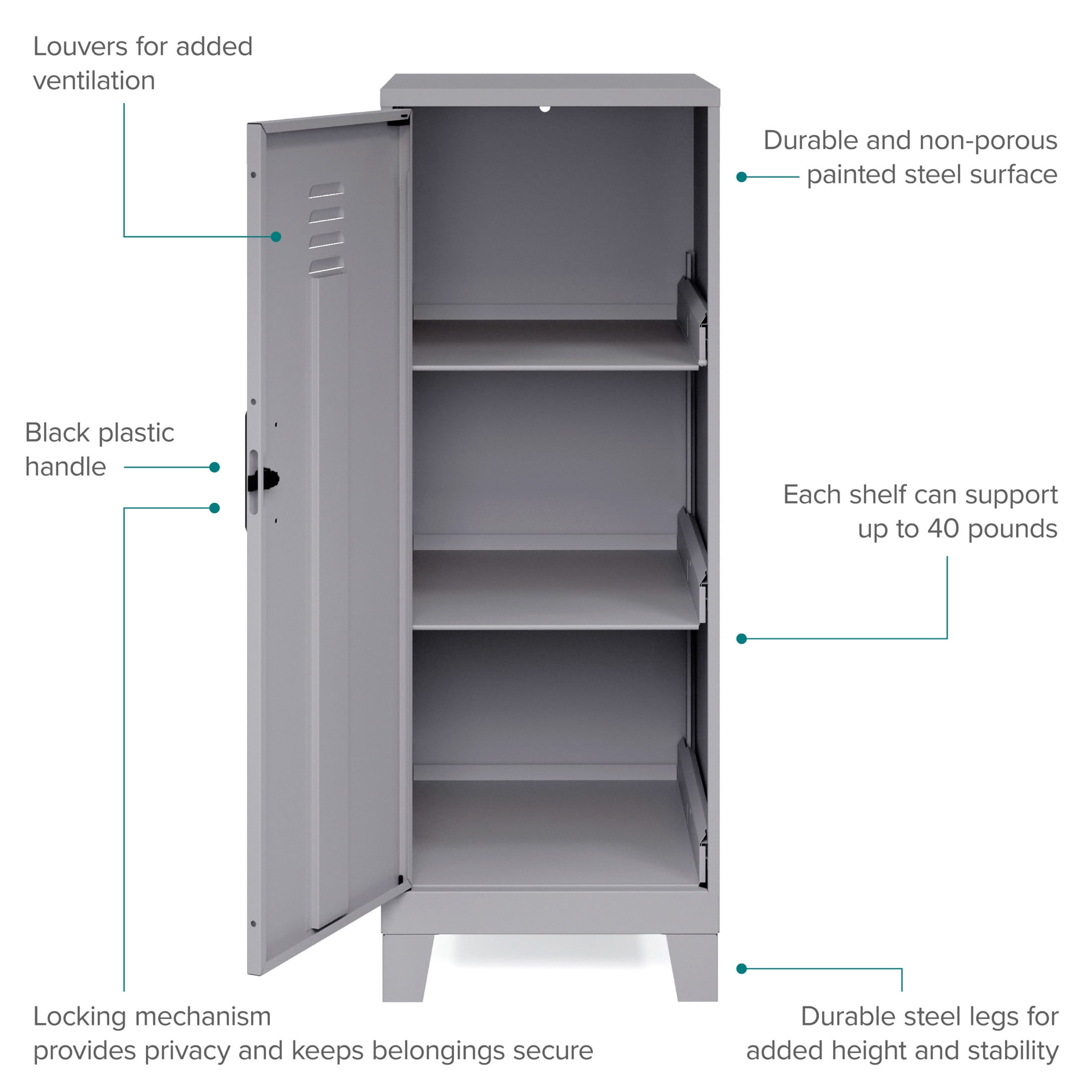 Storage locker comes with a hinged door and a locking mechanism to provide privacy and keep your belongings safe The 3 built-in shelves are perfect for stashing schoolwork, organizing work supplies, and putting away sporting equipment, toys, and games Each shelf can support up to 40 pounds to meet all your different needs Painted steel won’t warp and it is non-porous and easy to clean. Welded steel construction provides strength and support. Fully assembled welded cabinet. Assembly of the handles and optional legs required The personal locker is is GREENGUARD GOLD Certified for indoor air quality. ANSI-BIFMA rated for small office and home office safety standards Space Solutions 42.5 inch High 3 Shelf Storage Locker Cabinet, Welded Metal, Fully Assembled, Vented Door, 3 inch Riser Legs, Arctic Silver