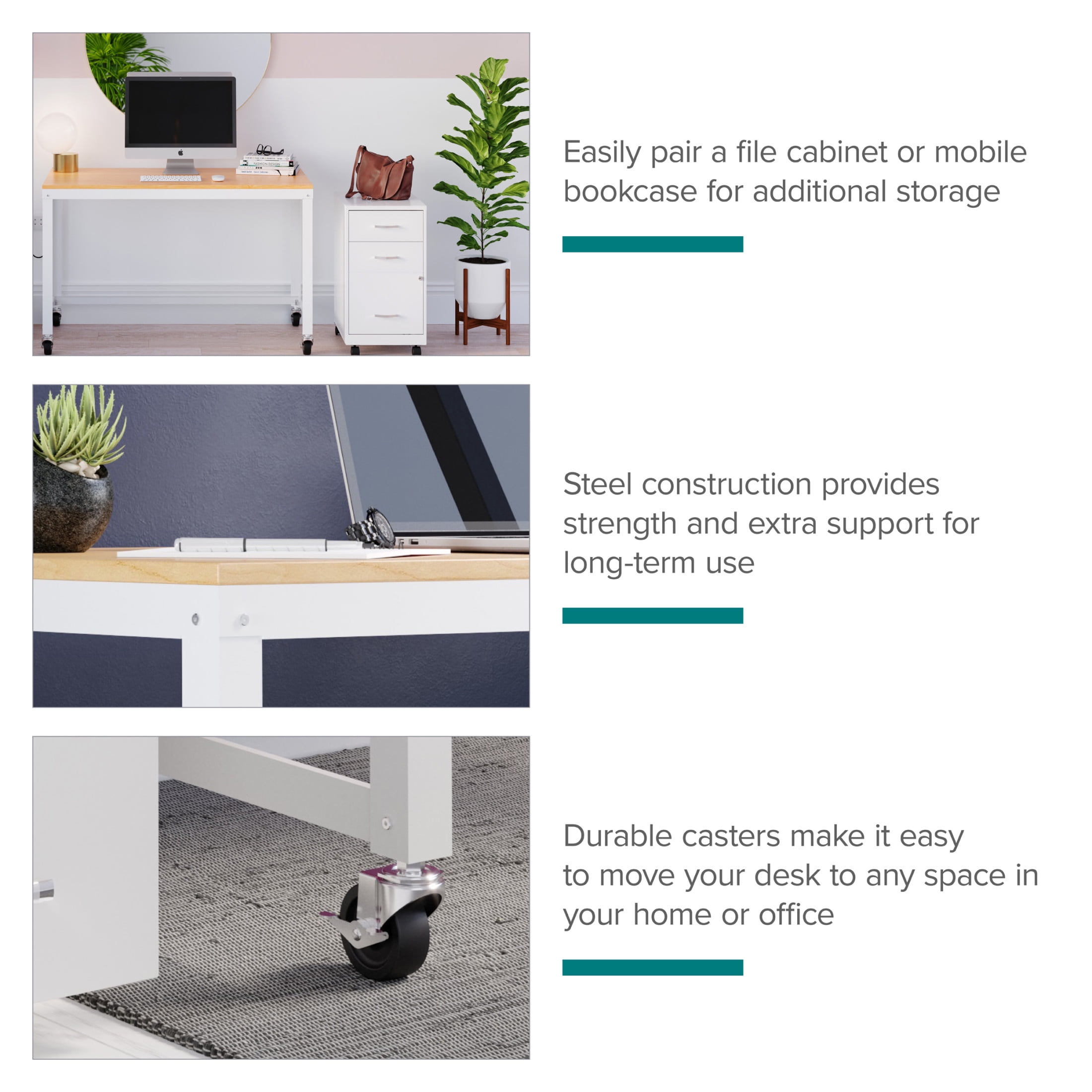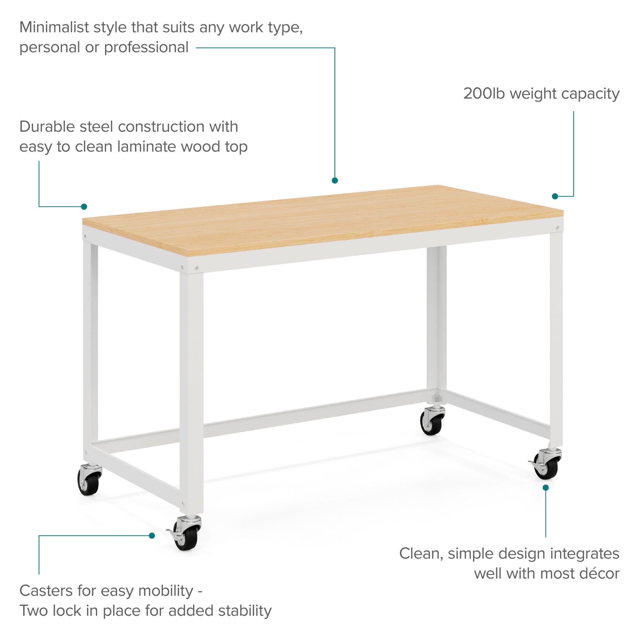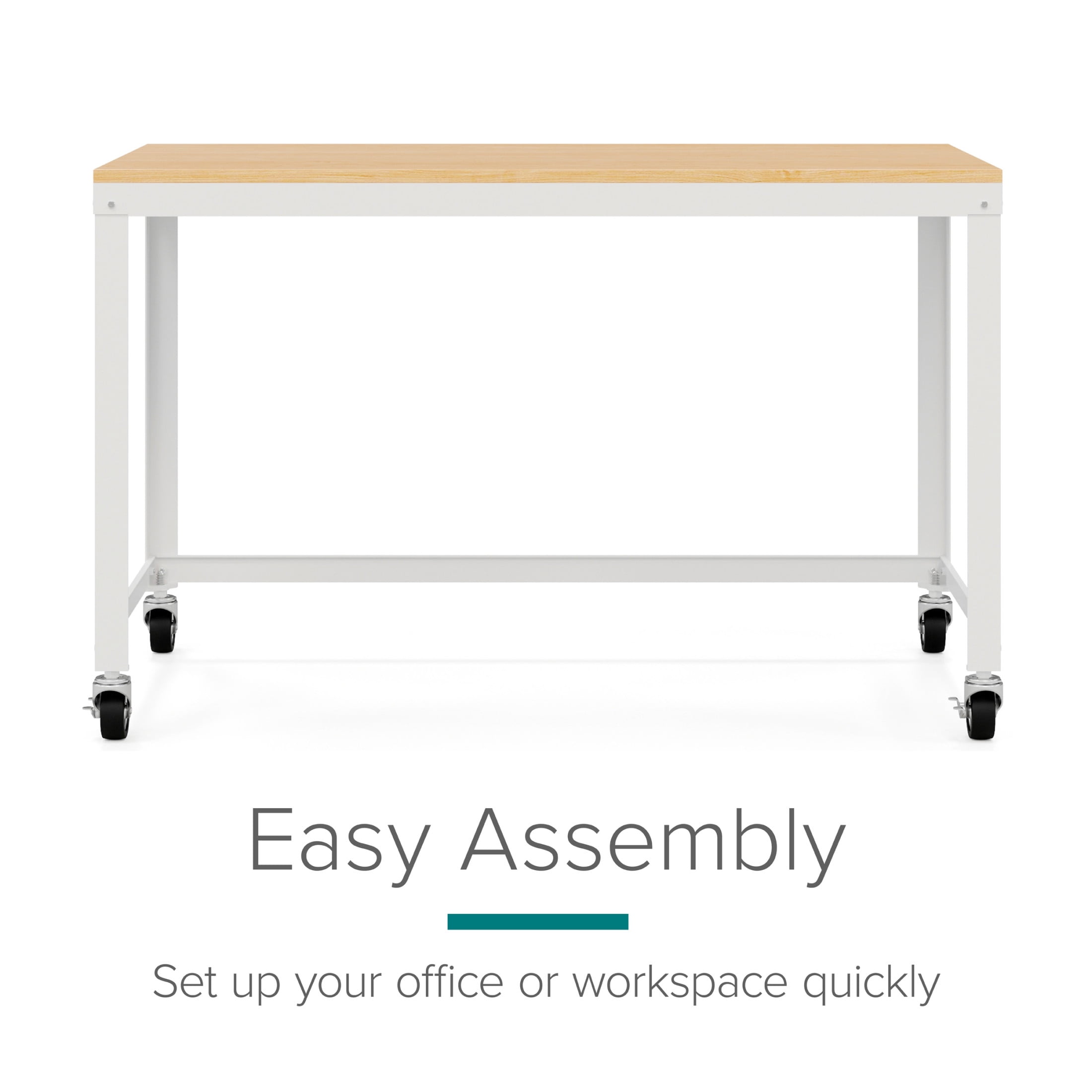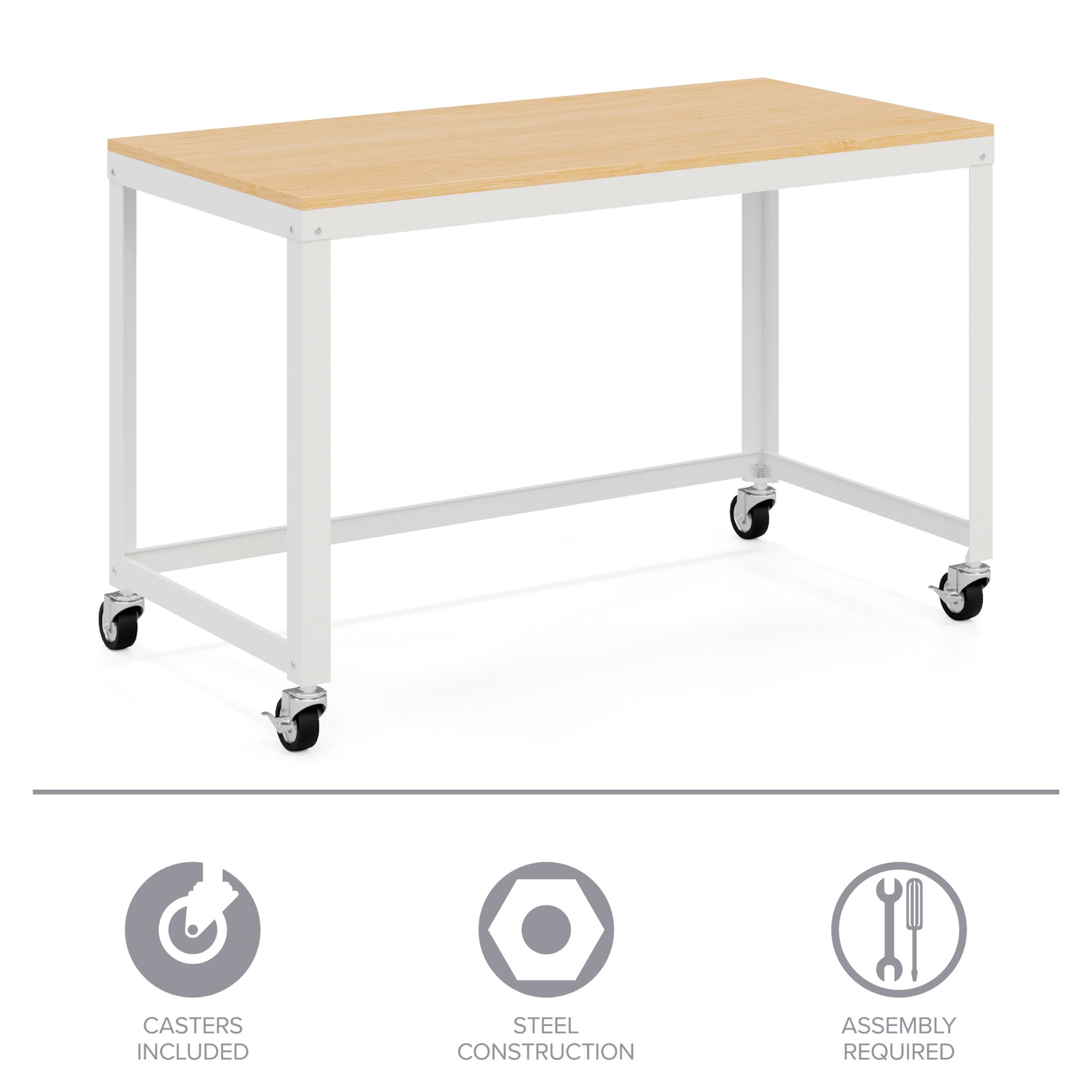 Durable steel construction with easy to clean laminate wood top Wheels for easy mobility – two lock in place for added stability Durable laminate wood and steel construction for added desktop support Clean, simple design integrates well with most décor Easy to assemble Eco-friendly. Contains up to 30% recycled material Space Solutions Ready-to-assemble 48-inch Wide Mobile Metal Desk with Laminate Top, White / Maple