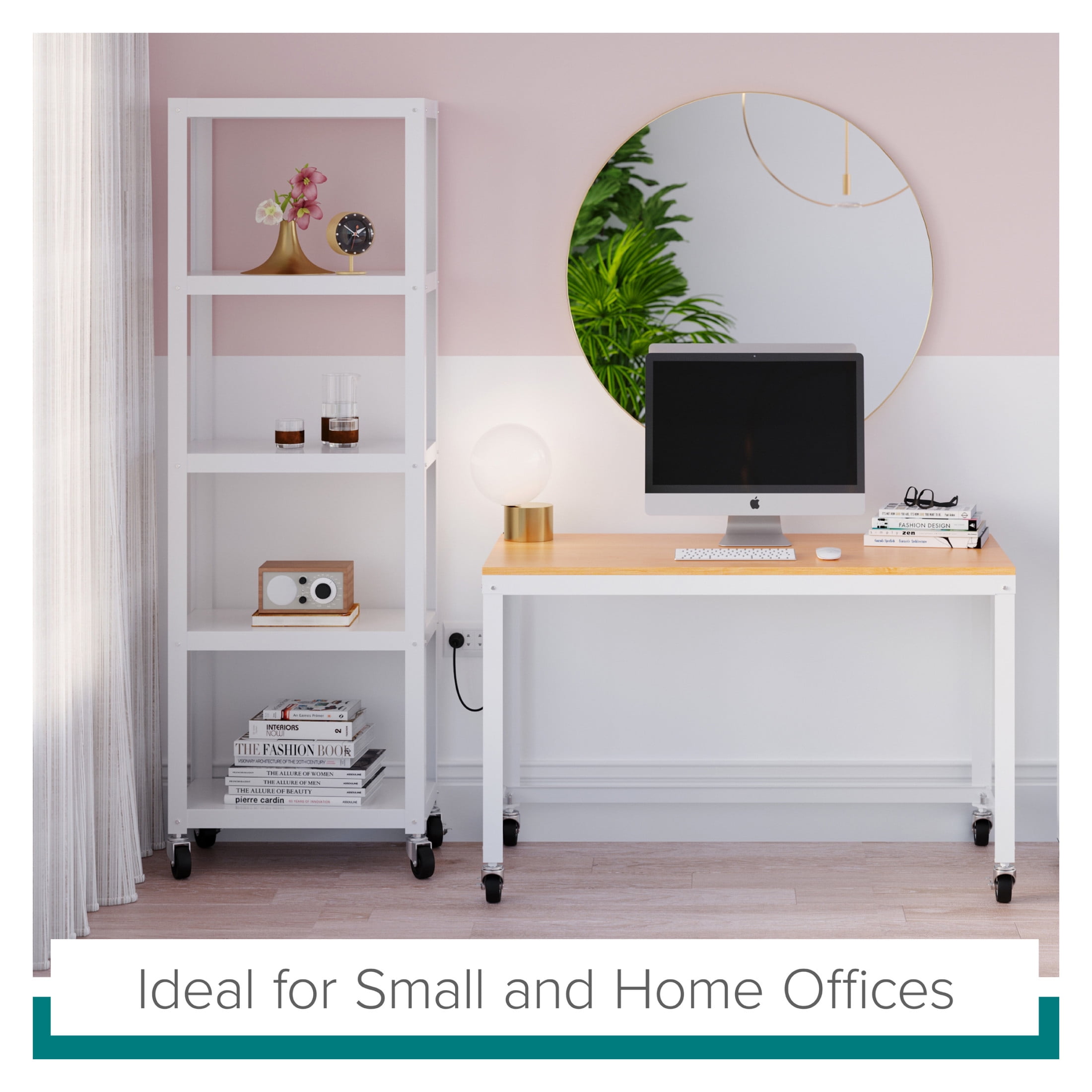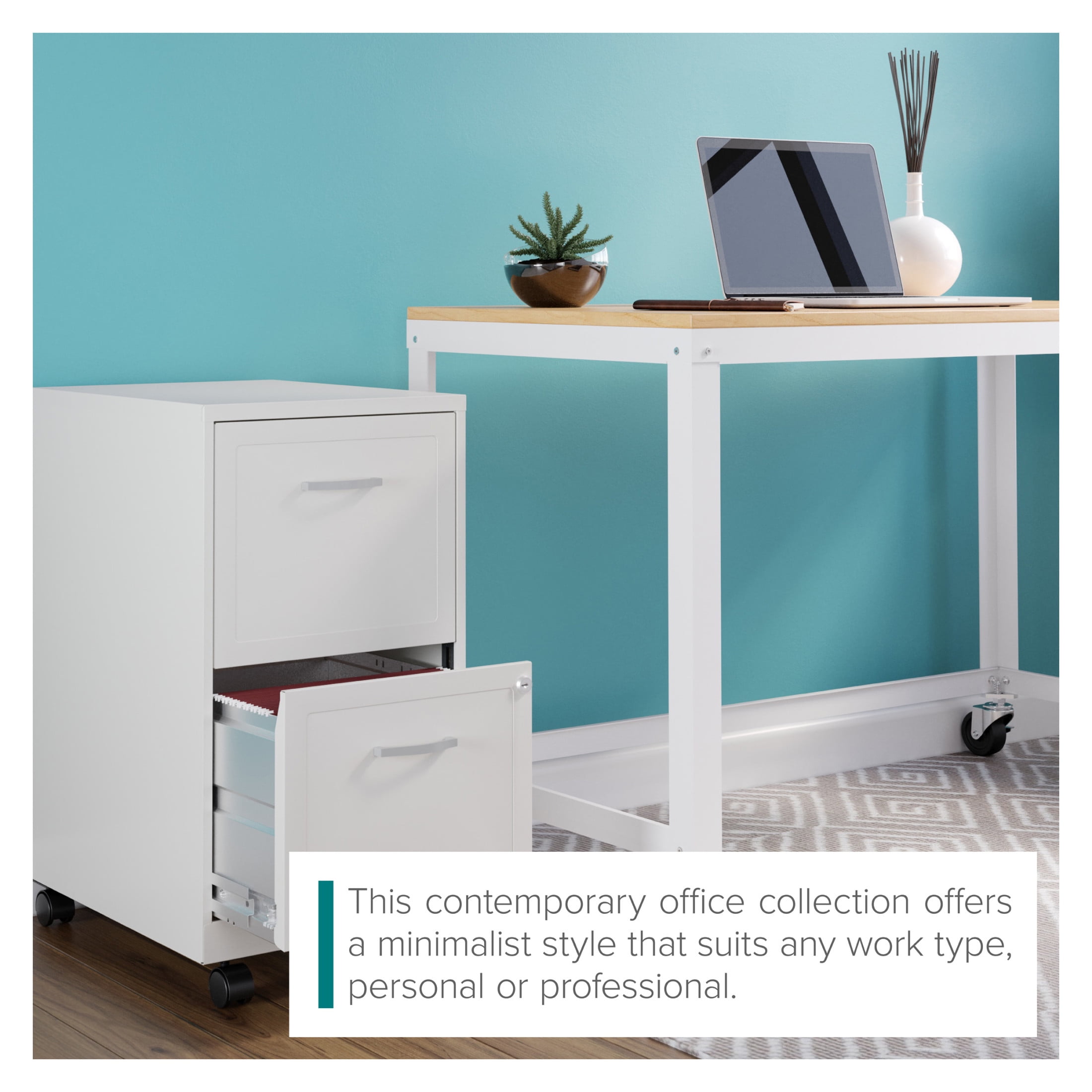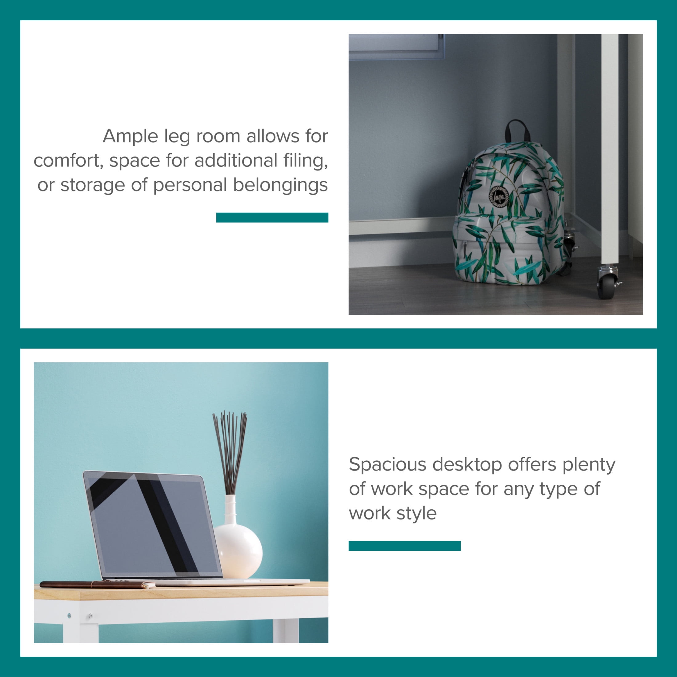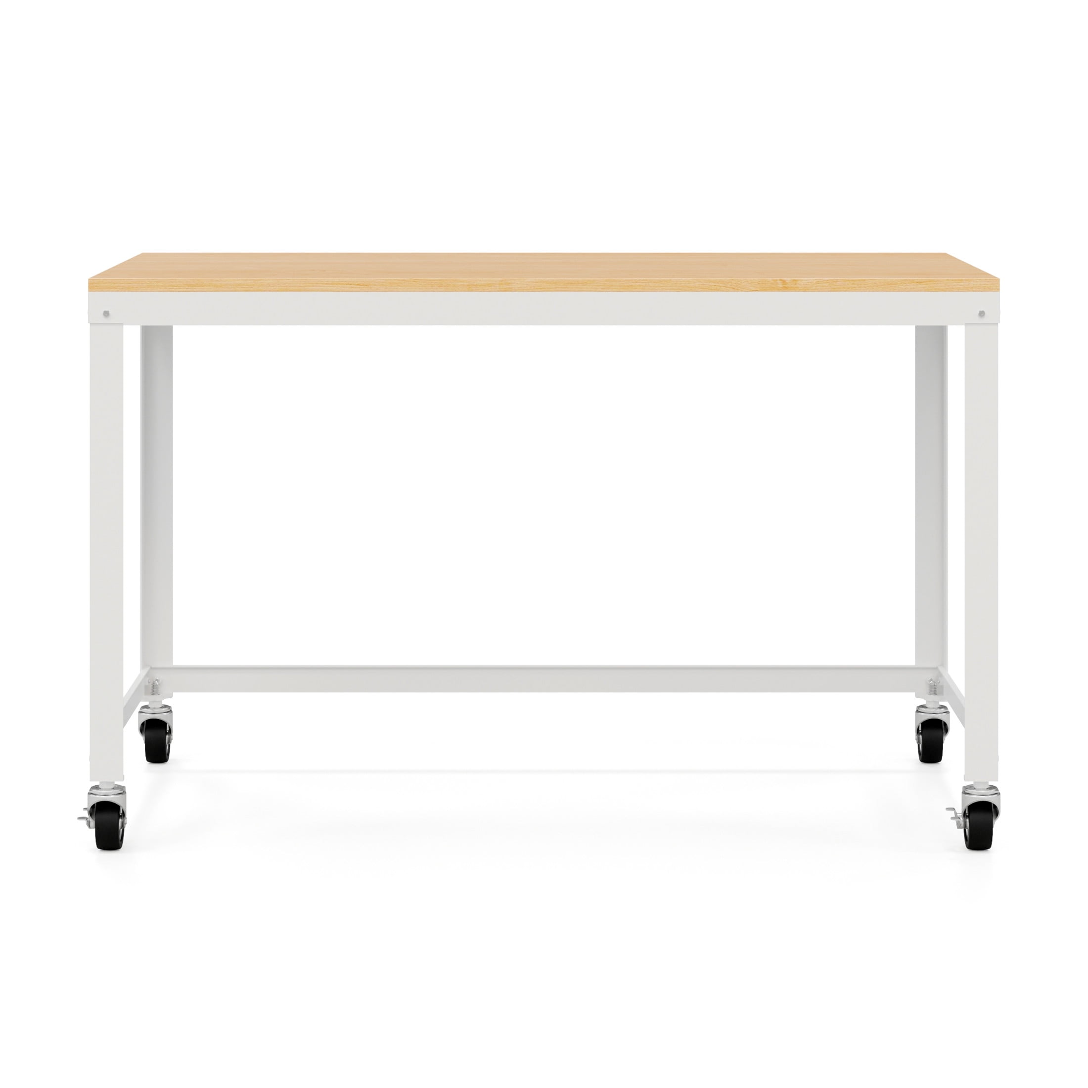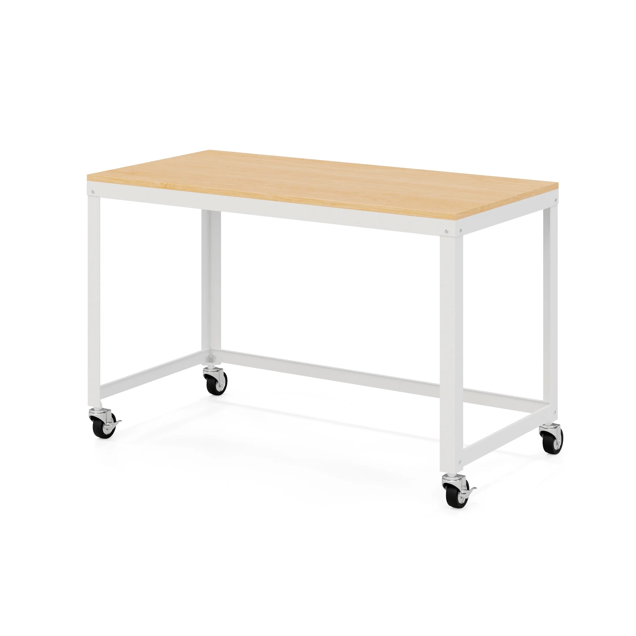 Durable steel construction with easy to clean laminate wood top Wheels for easy mobility – two lock in place for added stability Durable laminate wood and steel construction for added desktop support Clean, simple design integrates well with most décor Easy to assemble Eco-friendly. Contains up to 30% recycled material Space Solutions Ready-to-assemble 48-inch Wide Mobile Metal Desk with Laminate Top, White / Maple