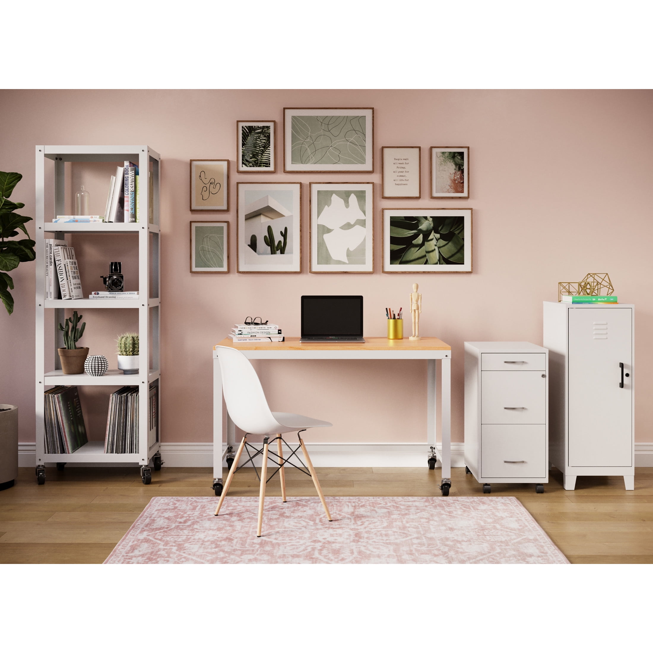 The Mobile Desk is part of our home office furniture collection. Our contemporary office collection offers a minimalist style that suits any work type, personal or professional. Our mobile desk features durable laminate wood and steel construction to provide the strength and support required for long-term use. At 48 inches wide, our mobile desk is the perfect size for your modern workplace at home or in the office. The clean, simple, and modern furniture design of this metal desk integrates well into any space and makes it easy to pair a mobile filing cabinet or bookcase for additional storage solutions. The spacious workspace provides you with ample leg room, and the wheels make it easy to move to any space in your home or office. The Mobile Desk does require assembly upon delivery. Color: White / Maple