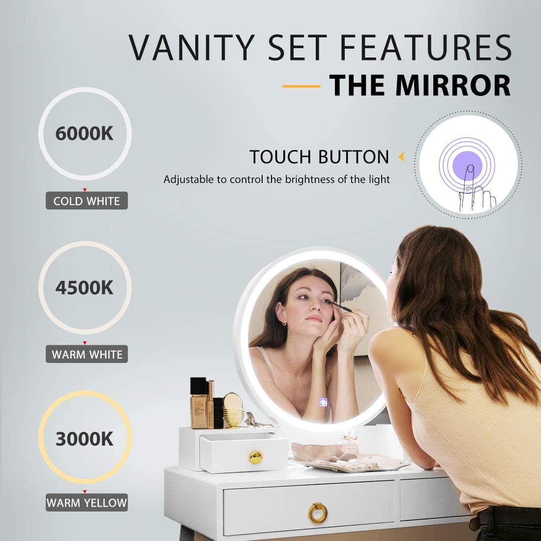 MULTIPLE LIGHTING EFFECTS: Three different LED lighting colors for any mood: Natural lighting, warm light and cold light correspond to various indoor lighting and environments; Soft lighting reduces eye strain; And bright lighting offers greater light angles for more details and a brighter room SENSITIVE TOUCH OPERATION: Different from the traditional mechanical key-type switch, we’ve designed this with a touch sensor to control the brightness of the light; This redesign reduces wear and tear, reduces maintenance costs, and has a longer service life; With a waterproof button you can safely clean this mirror when needed PREMIUM QUALITY: The MDF table is made of 100% beech wood (legs) and is sturdy, durable, and scratch-resistant; Naturally-colored legs and supports create a beautiful aesthetic; Anti-slip drawers create zero noise and plastic clips inside the drawers prevent them from falling out; The padded stool is comfortable and aesthetically-pleasing, perfect for your home; And the mirror can be detached from the table so you can use it as a desk or use the mirror independently COMPACT WITH LARGE-CAPACITY: The two small drawers above and the two large ones below are designed without partitions to provide ample space for storing your goods; You can make full use of the drawer space to place cosmetics, skin care products, jewelry, sunglasses, or other daily necessities SIMPLE YET STYLISH: Our design is simple, modern, and elegant; The white table will give your room a cleaner look and is easy to decorate as you want; This is the perfect gift for a daughter, mother, girlfriend, or friend