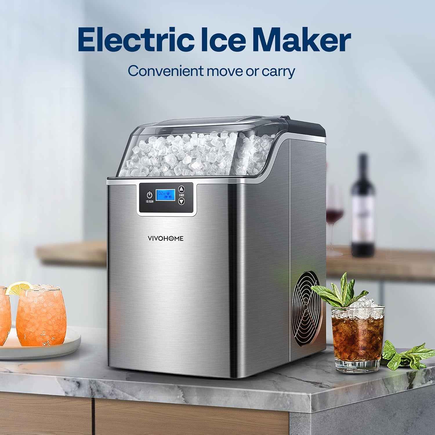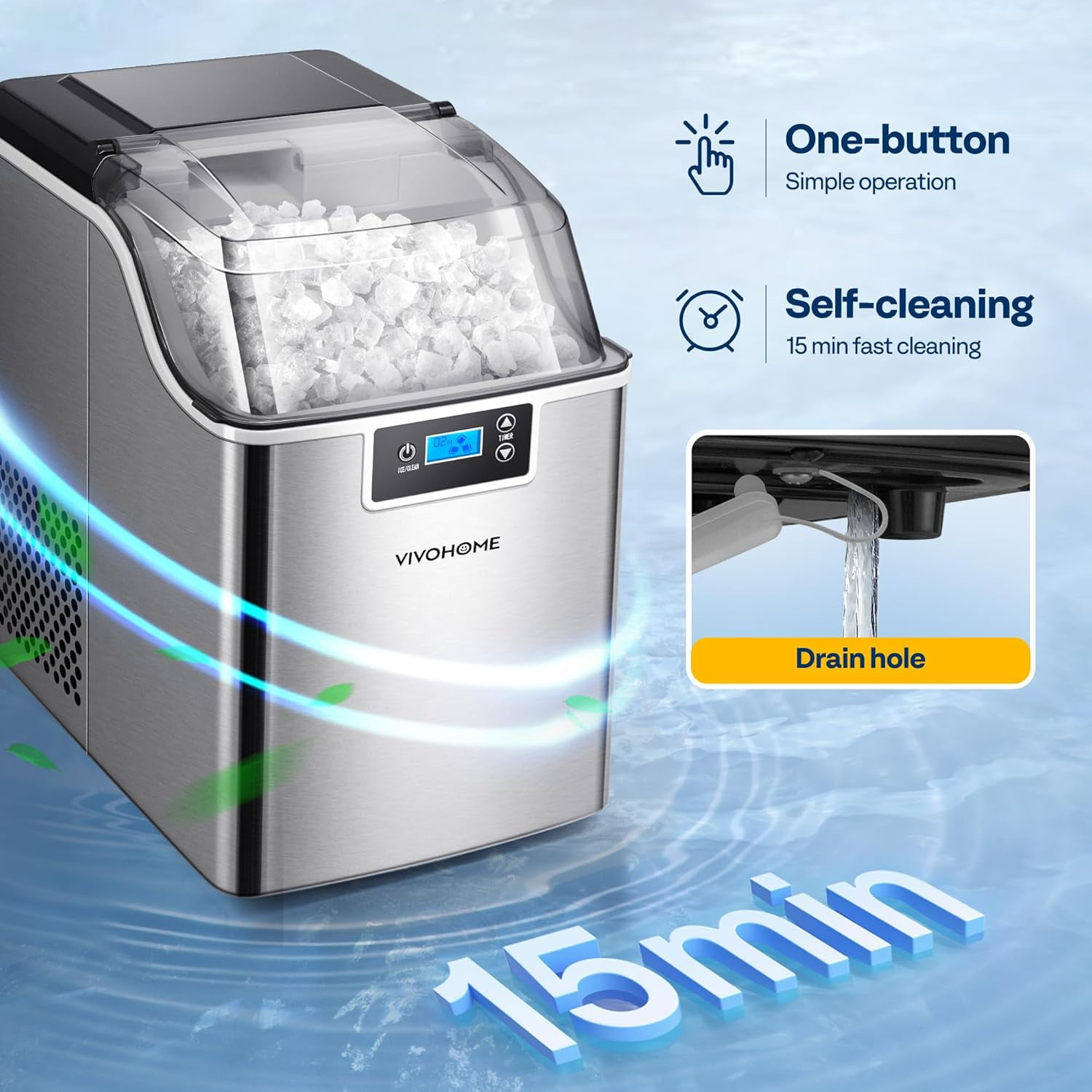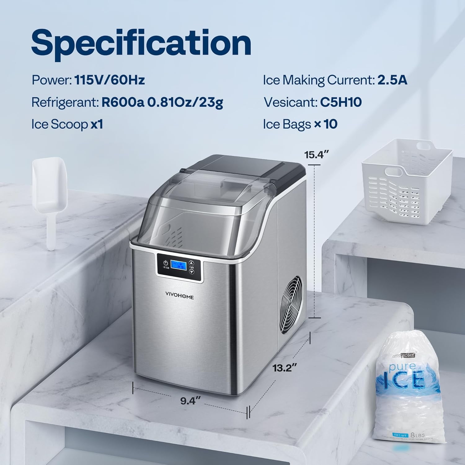 SPECSTAR Countertop Nugget Ice Maker This summer, treat your family and friends with all kinds of cool dishes and drinks! The nugget ice produced by the SPECSTAR ice machine will add a unique flavor to your cold drinks with its crunchy texture. Easy operation and fast performance, experience ice making like never before! Fast Ice-making 1 ice nugget/ 3 seconds; 44lbs /24hours Self-cleaning Function Finishes cleaning in 15 minutes, frees your hands and saves your time. Large viewing window For convenient observation of the ice state and ice-making process at any time. Low Decibel Whisper quiet when running and will not disturb your daily life. Specifications Power: 115V/60HZ Ice Making Current: 2.5A Refrigerant: R600a/23g Vesicant: C5H10 Daily Output: 44lbs/day Ice Type: Chewable ice Water Tank Capacity: 2.4L Ice Capacity: 3.7 lbs. Ice-making Cycle: 10-15 min Material: Stainless Steel Color: Silver Product Weight: 29.7 lbs. Product Dimension: 9.4 x 13.2 x 15.4 inch Package Dimension: 11.1 x 14.8 x 17.2 inch Package Content Ice maker x 1 Ice basket x 1 Ice bag x 10 Ice scoop x 1 User manual x1
