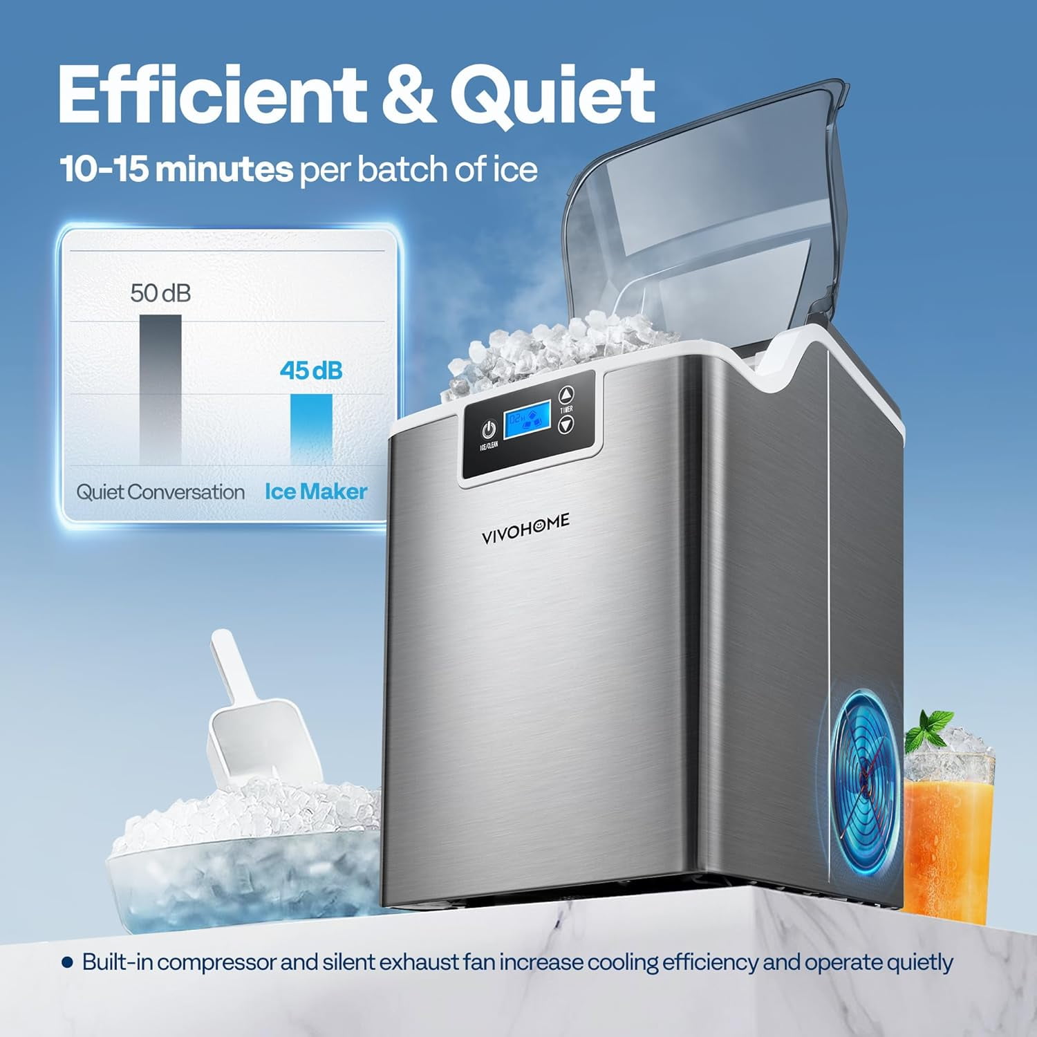 EFFICIENT AND QUIET – The powerful ice maker is equipped with the latest compressor that improved the ice-making efficiency and reduces the noise of the product when running; The machine starts to make ice shortly after pressing the Ice /CLEAN button; It produces one nugget ice every 3 seconds and can produce 44 pounds of hard ice in 24 hours when the tank is kept full CHEWABLE NUGGET ICE – The ice maker is designed to produce crunchy chewable nugget ice; Other than other ice, the nugget ice has a chewy taste and is gentler on your teeth with its soft texture; The small pieces of sonic ice are more effective at keeping your beverages cool and it is more flexible to put in different kind of containers with its small size SMOOTH OPERATION – Intelligent LCD panel of the ice maker allows you to complete any operation easily without complex; All you have to do is fill the ice maker with water, plug it in and press the appropriate button, and the machine will start working; The large see-through window provides a nice view of the ice-making process; When the water is low or the ice basket is full, the light will turn on, easy and smooth operation for sure SELF-CLEANING FUNCTION – The countertop ice maker has a self-cleaning function to free your hands; Just add water to the tank and long press the ICE/CLEAN button for 5 seconds, and the machine will start cleaning itself; You do not have to take the time and trouble to clean the ice maker yourself anymore COMPACT DESIGN – Featuring 9.4 x 13.2 x 15.4 inches, the sonic ice maker is compact in size; The package comes with 10 ice bags, 1 ice basket, and 1 ice scoop, which brings you more convenience; You can easily bring the ice maker wherever you need it with the minimum effort; Whether in the kitchen, living room, bedroom, office or party, SPECSTAR ice maker is always ready to provide you with quality nugget ice