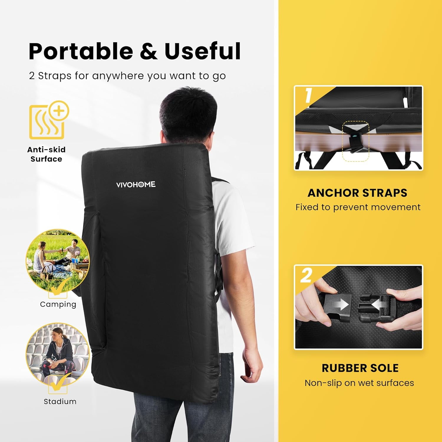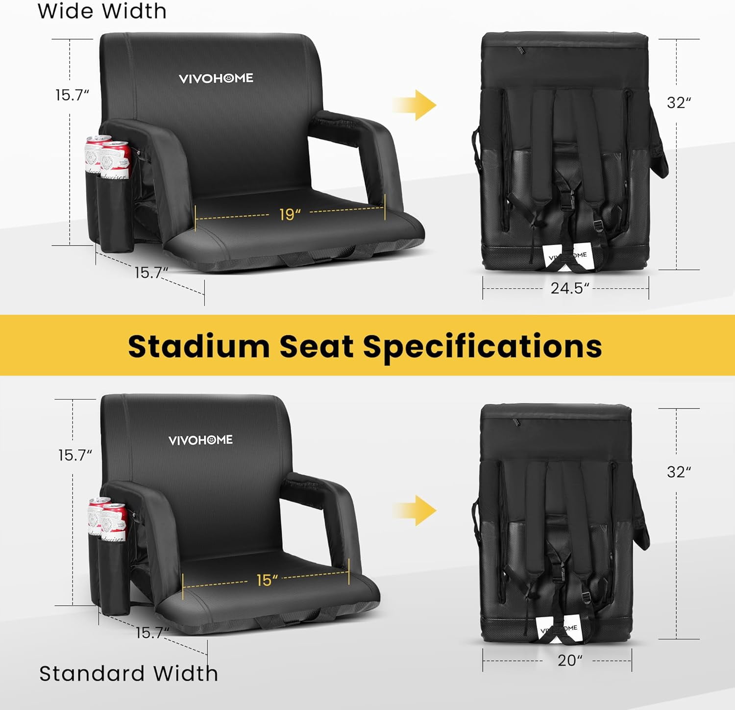 SPECSTAR Foldable Stadium Seat Chair for Bleachers Set of 1 DURABLE & LIGHTWEIGHT & FOLDABLE & PORTABLE & EXTRA POCKETS Bring the comfort of your own home with the SPECSTAR portable stadium seat. Made for traveling, this seat can be compacted into a backpack with two adjustable straps and will quickly become your go-to transportable seat. It provides you with a comfortable experience in all your outdoor activities! Convenient Storage Pockets This bleacher chair is designed with 3 kinds of pockets, one elastic side pocket for small things, 2 zipper pockets (the large one is on the back, and the small one is on the side) for valuable stuff, and 2 round side pockets for drinks. These pockets are convenient for you to store things when you are watching games or having picnics. Comfortable Design Featuring a high-density thickened sponge pad, adjustable 6 seat angles, and foldable armrests, it is comfortable for you to sit in any place. Durable Material Made of a durable lightweight steel frame and 300D polyester materials, the stadium seat is easy to carry and clean, which can keep dry in light rain and snow days. Made of high-quality steel frame construction and a 300D polyester seat cover, ensuring the long time use of this seat. Different pockets can help you to store different items, and the zippers are convenient for you to put valuable stuff. The bottom material is water-resistant and anti-skid for a sturdy fit on any bleachers, bench, or floor surface. The adjustable backpack straps make this stadium seat easy to carry, giving you a comfortable experience for different events. It is perfect for sports events, camping, boating, concerts, beach parties, picnics, extra seats at home, and so on. Product and Package Information Material: Steel + Sponge + 300D Polyester Product Size: 19” (L) x 15.7” (W) x 15.7” (H) (Unfolded), 32” (L) x 24.5” (W) (Folded) Product Weight: 7.6 lbs. 1 x Stadium Seat 1 x Instruction Note: The package includes only 1 stadium seat chair; don’t be misled by the main picture which is wrongly displayed due to a system bug.