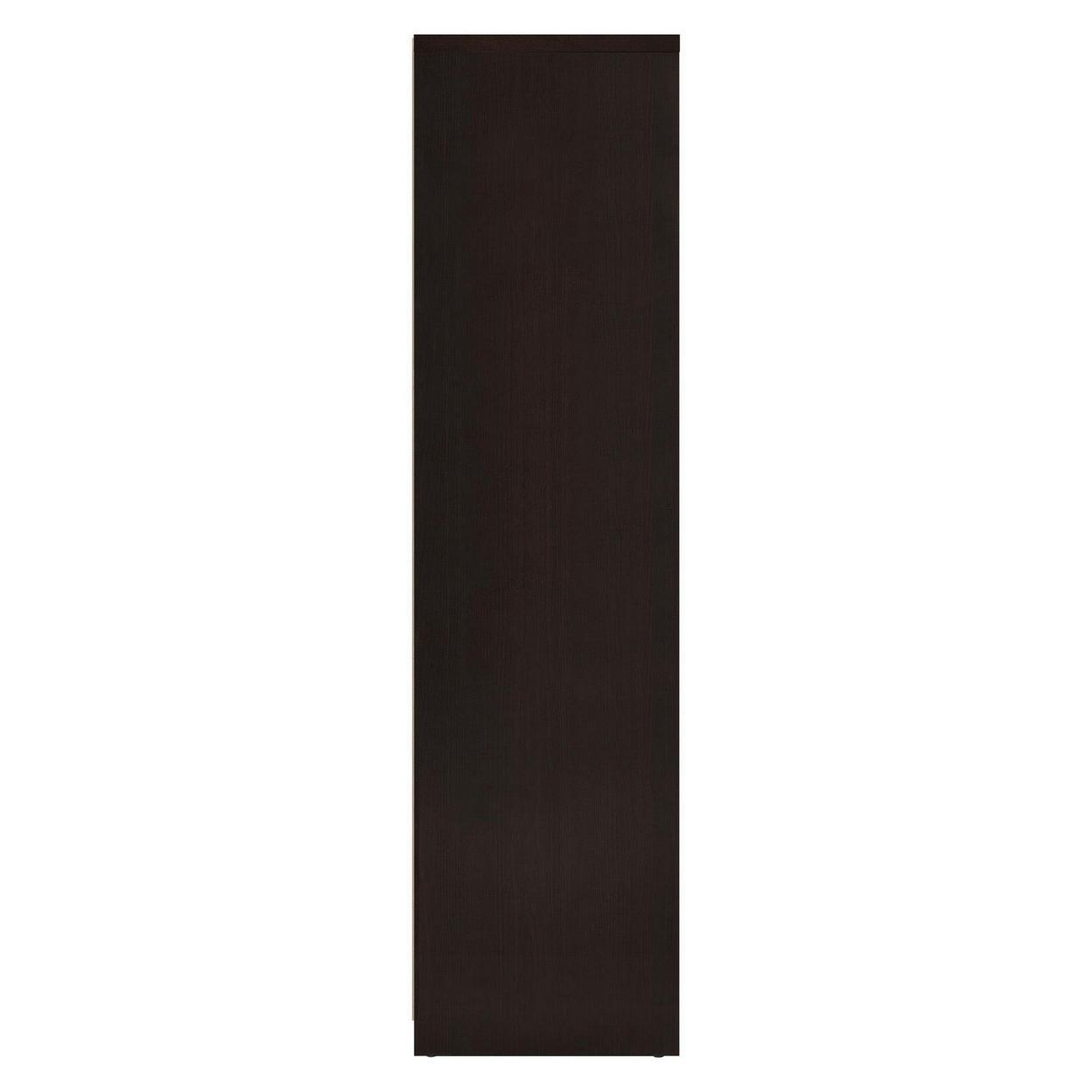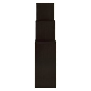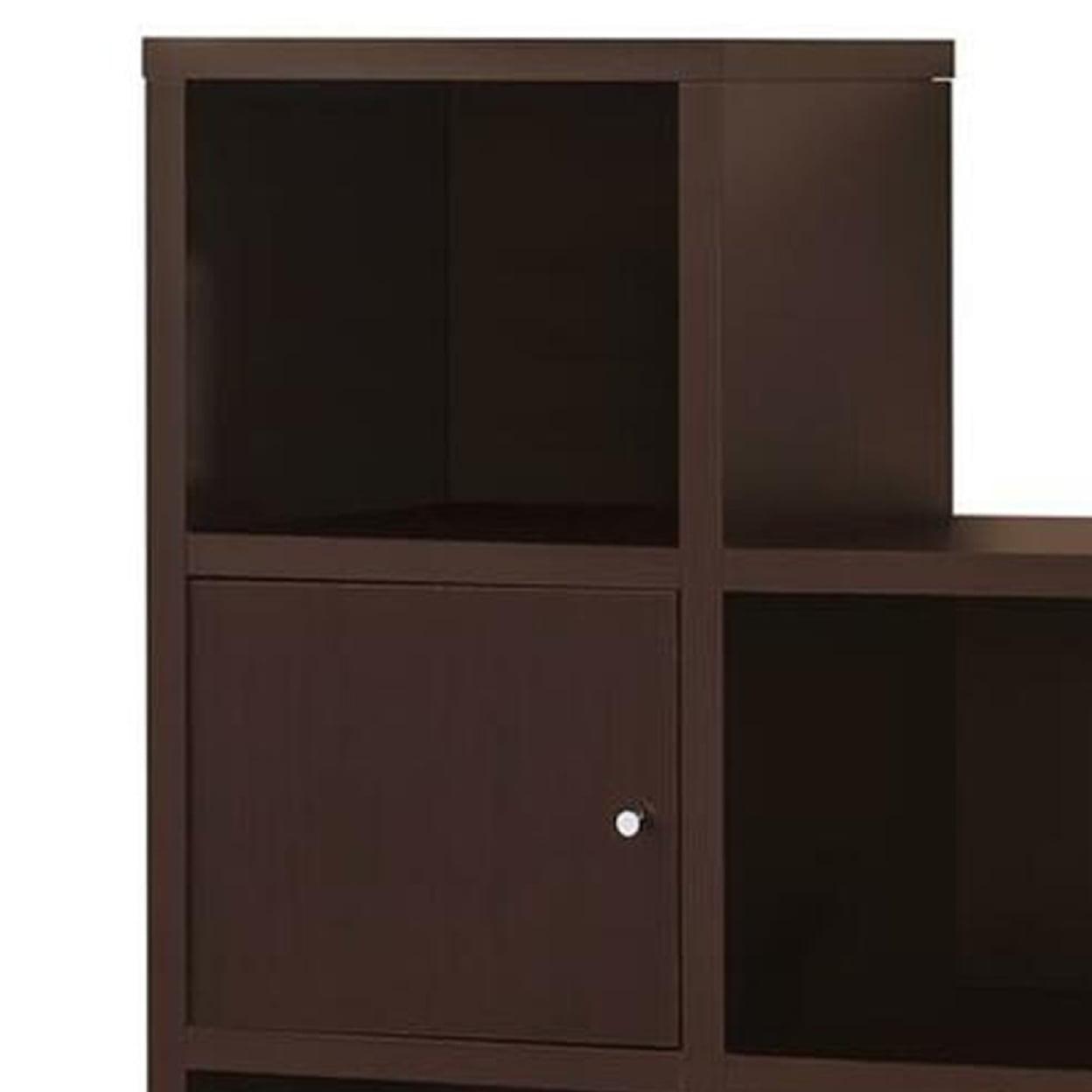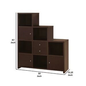 Contemporary Bookcase with Stair like Design, brown- Saltoro Sherpi All equipped with a clean line stair-like design, this bookcase offers open spaces and compartments for ample storage space. Finished in cappuccino (Brown) with metal overtones of chrome , its meant to jazz up your surroundings and give it an ultra modern look.