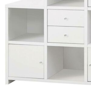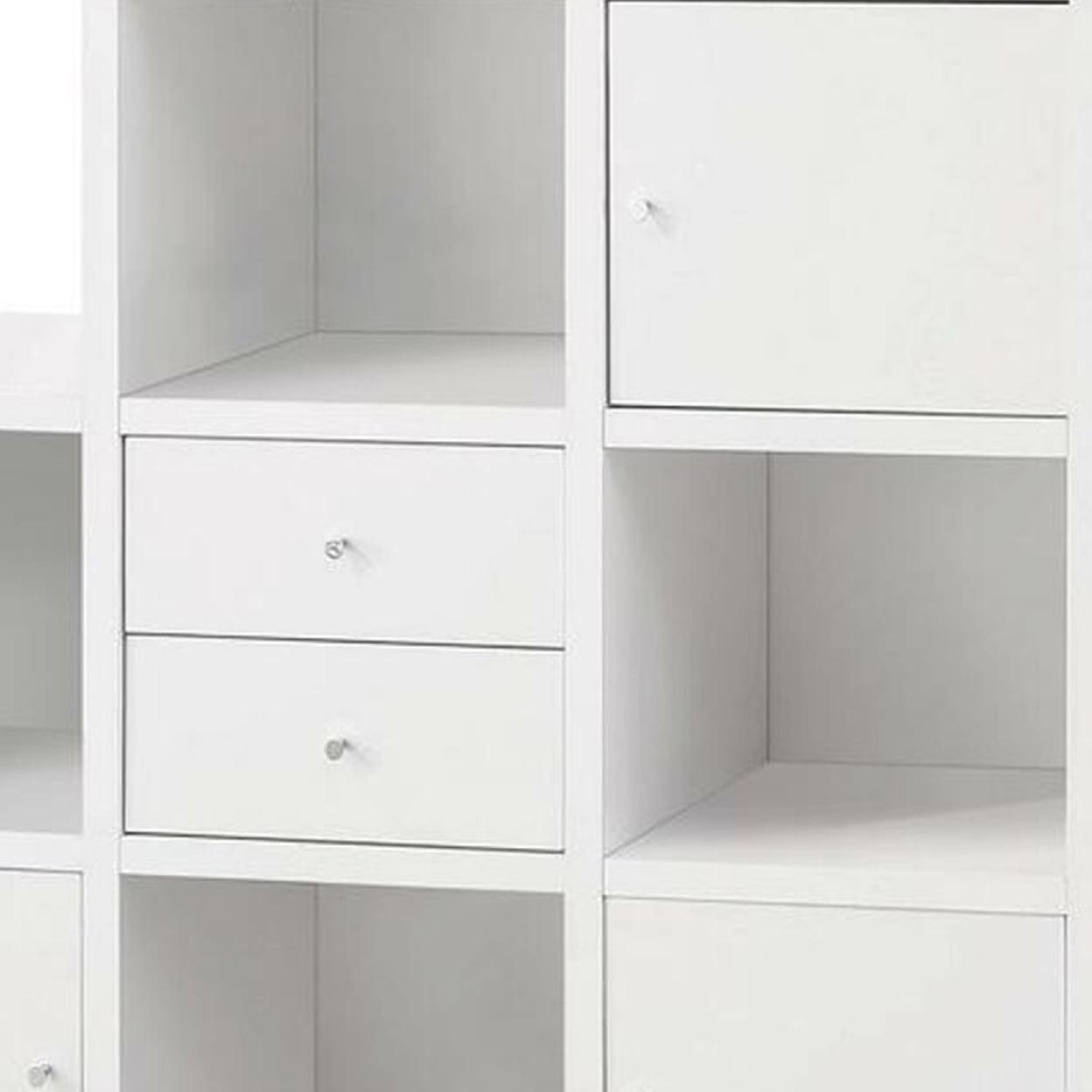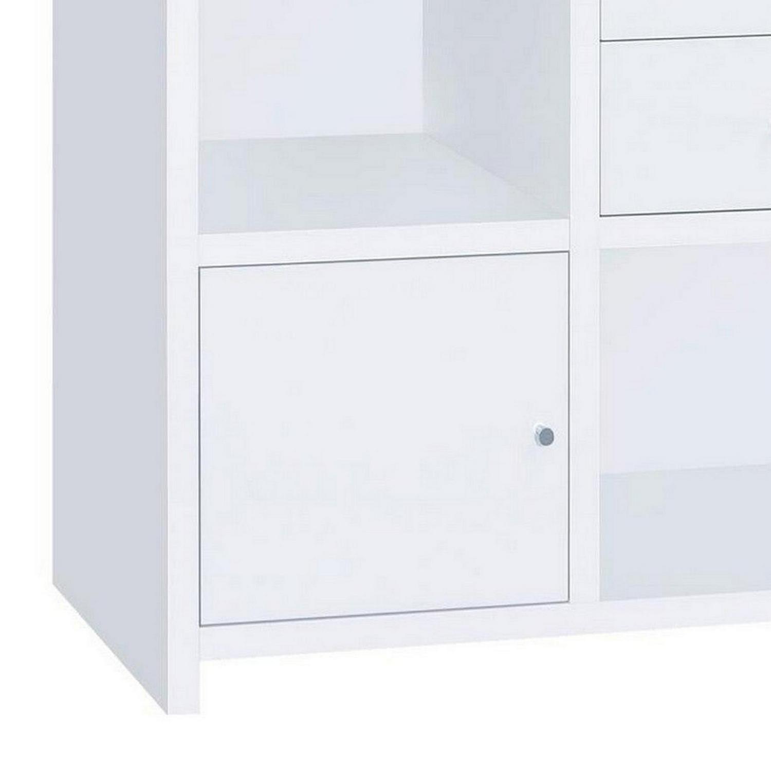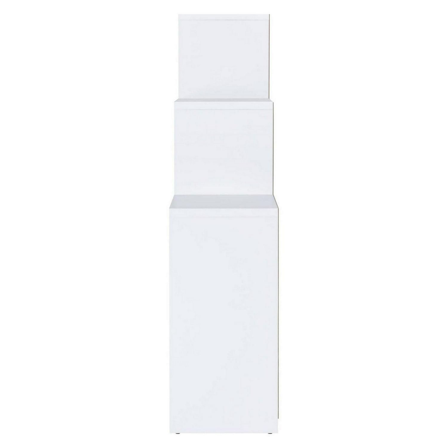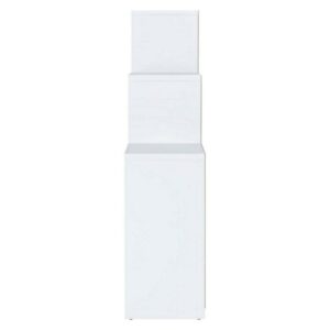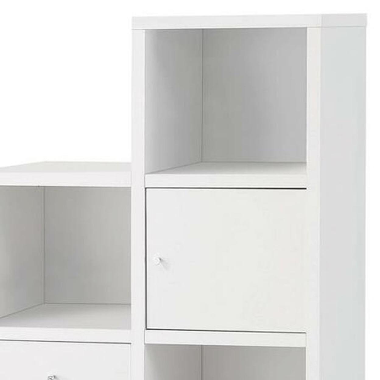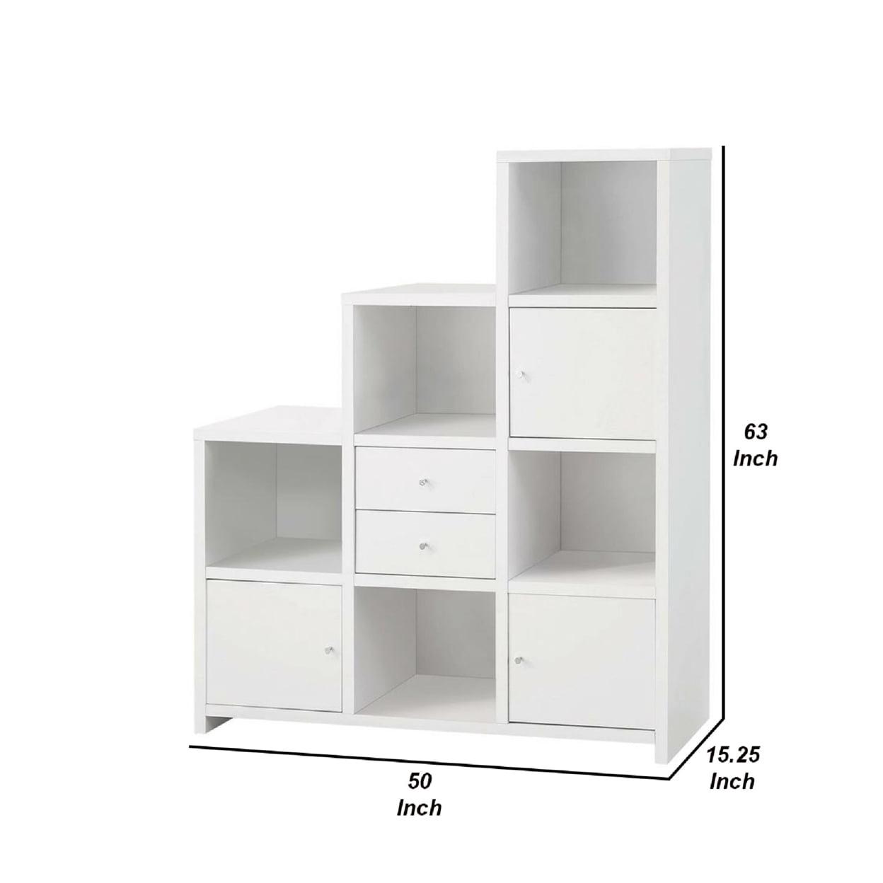 Asymmetrical Bookcase with Cube Storage Compartments, White- Saltoro Sherpi All equipped with a clean line stair-like design, this bookcase offers open spaces and compartments for ample storage space. Finished in white with metal overtones of chrome , its meant to jazz up your surroundings and give it an ultra modern look.