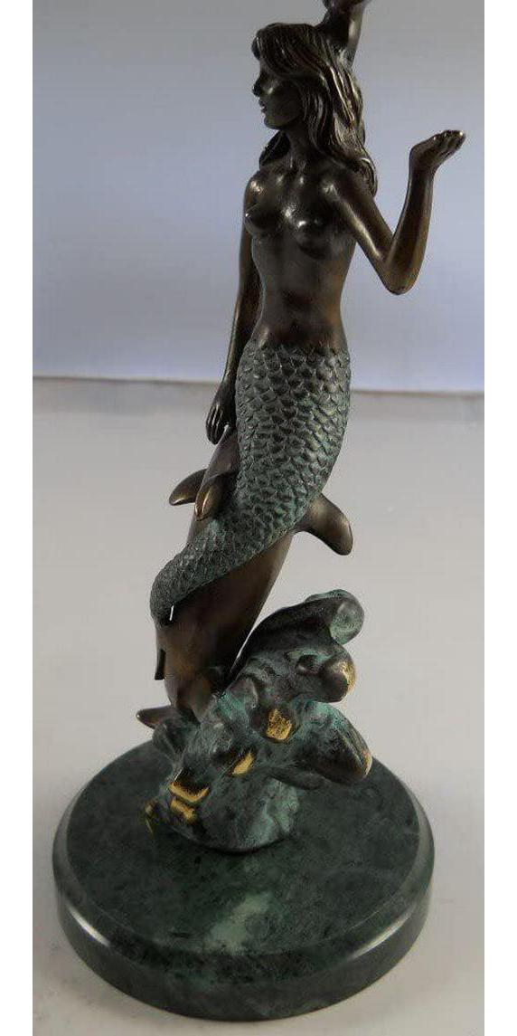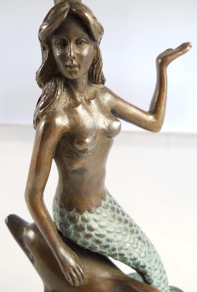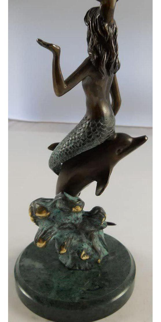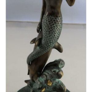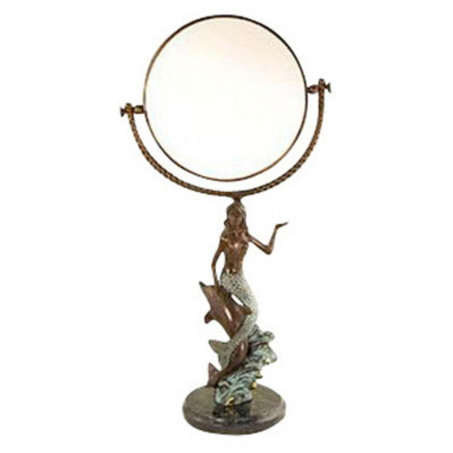 Presenting an exquisite vanity mirror that boasts a captivating mermaid and dolphin stem rising gracefully from a round marble base. This unique piece of functional art stands at a height of 18 1/2 inches, making it an elegant addition to any vanity or dressing table. The mirror itself is a 6-inch diameter masterpiece, offering the convenience of double-sided reflection. One side of the mirror features a 2X magnification, perfect for detailed makeup application or skincare routines. The mermaid and dolphin design adds a touch of whimsy and maritime charm to your daily routine. This vanity mirror is not just a practical accessory but also a delightful decorative element. Whether for your own use or as a thoughtful gift, it’s bound to impress with its aesthetic appeal and functional versatility. Elevate your daily beauty regimen with the enchanting allure of this mermaid and dolphin vanity mirror.