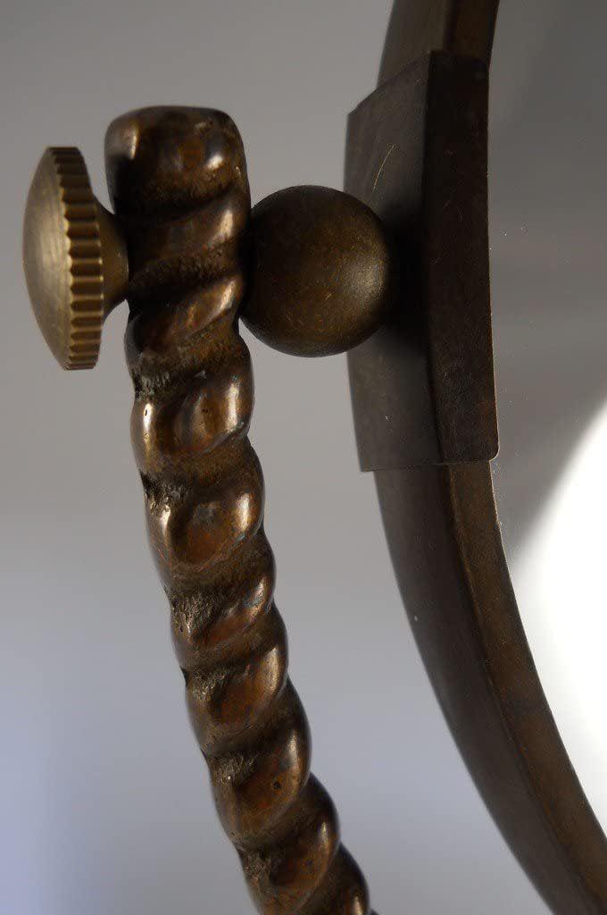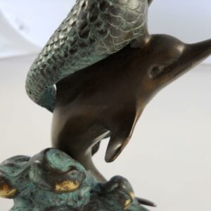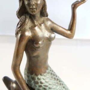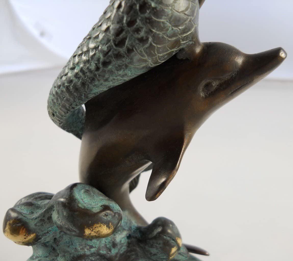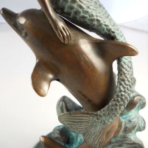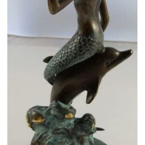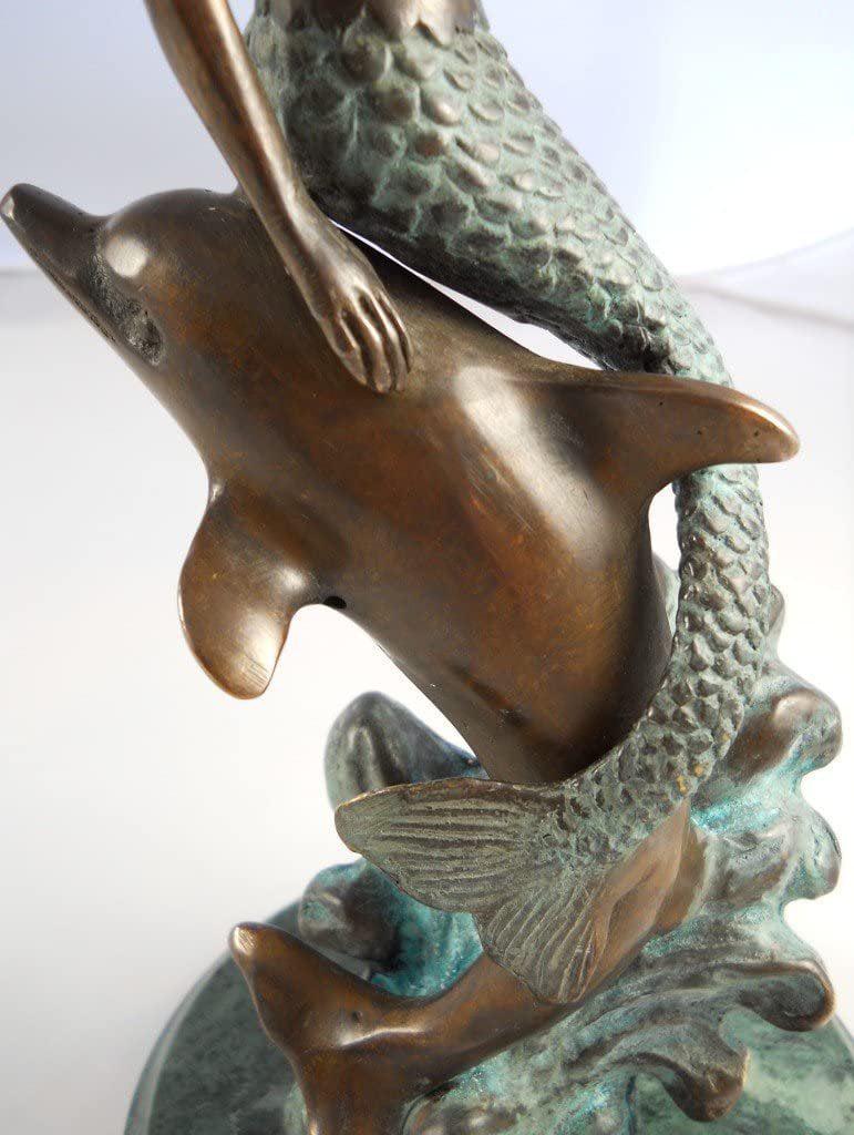 Presenting an exquisite vanity mirror that boasts a captivating mermaid and dolphin stem rising gracefully from a round marble base. This unique piece of functional art stands at a height of 18 1/2 inches, making it an elegant addition to any vanity or dressing table. The mirror itself is a 6-inch diameter masterpiece, offering the convenience of double-sided reflection. One side of the mirror features a 2X magnification, perfect for detailed makeup application or skincare routines. The mermaid and dolphin design adds a touch of whimsy and maritime charm to your daily routine. This vanity mirror is not just a practical accessory but also a delightful decorative element. Whether for your own use or as a thoughtful gift, it’s bound to impress with its aesthetic appeal and functional versatility. Elevate your daily beauty regimen with the enchanting allure of this mermaid and dolphin vanity mirror.