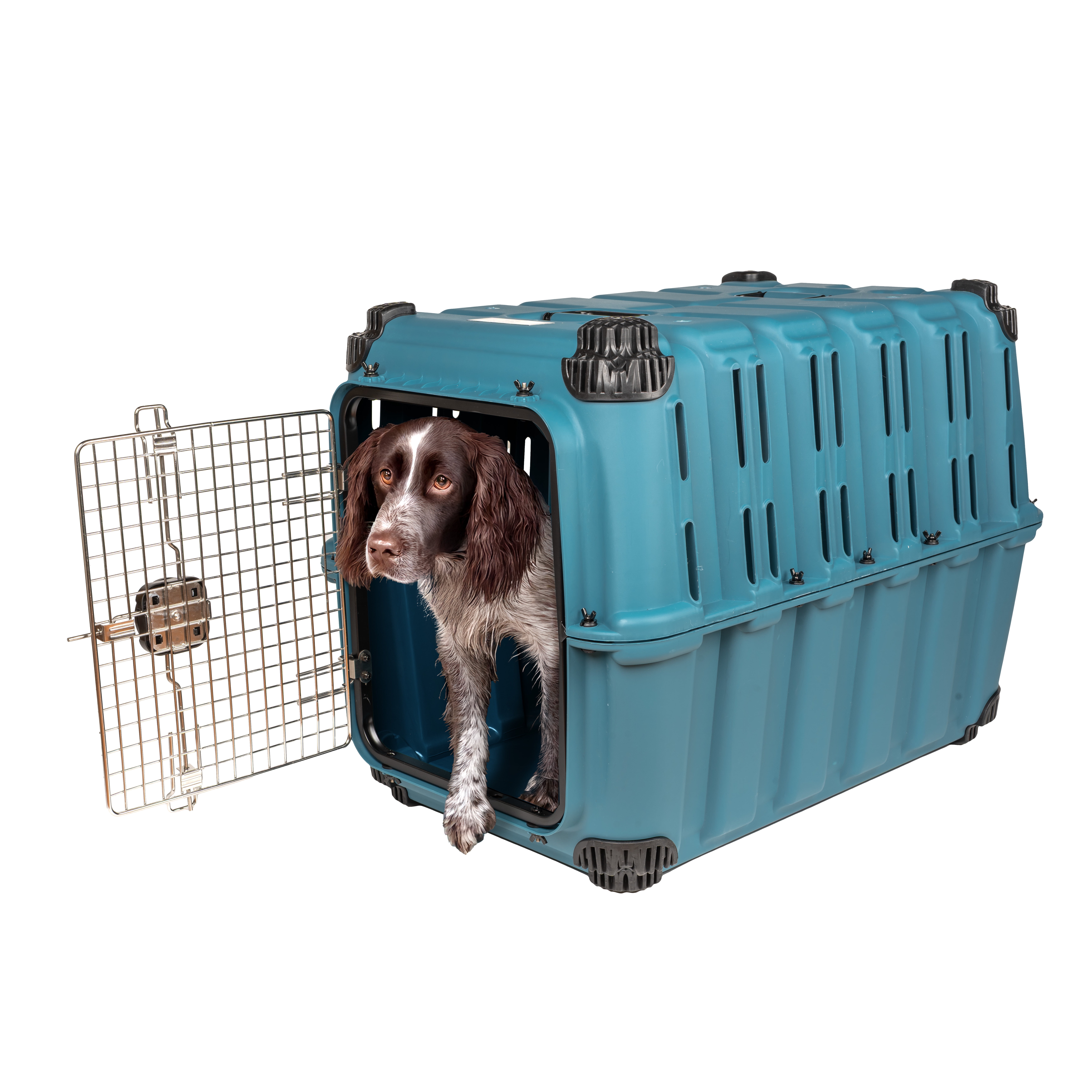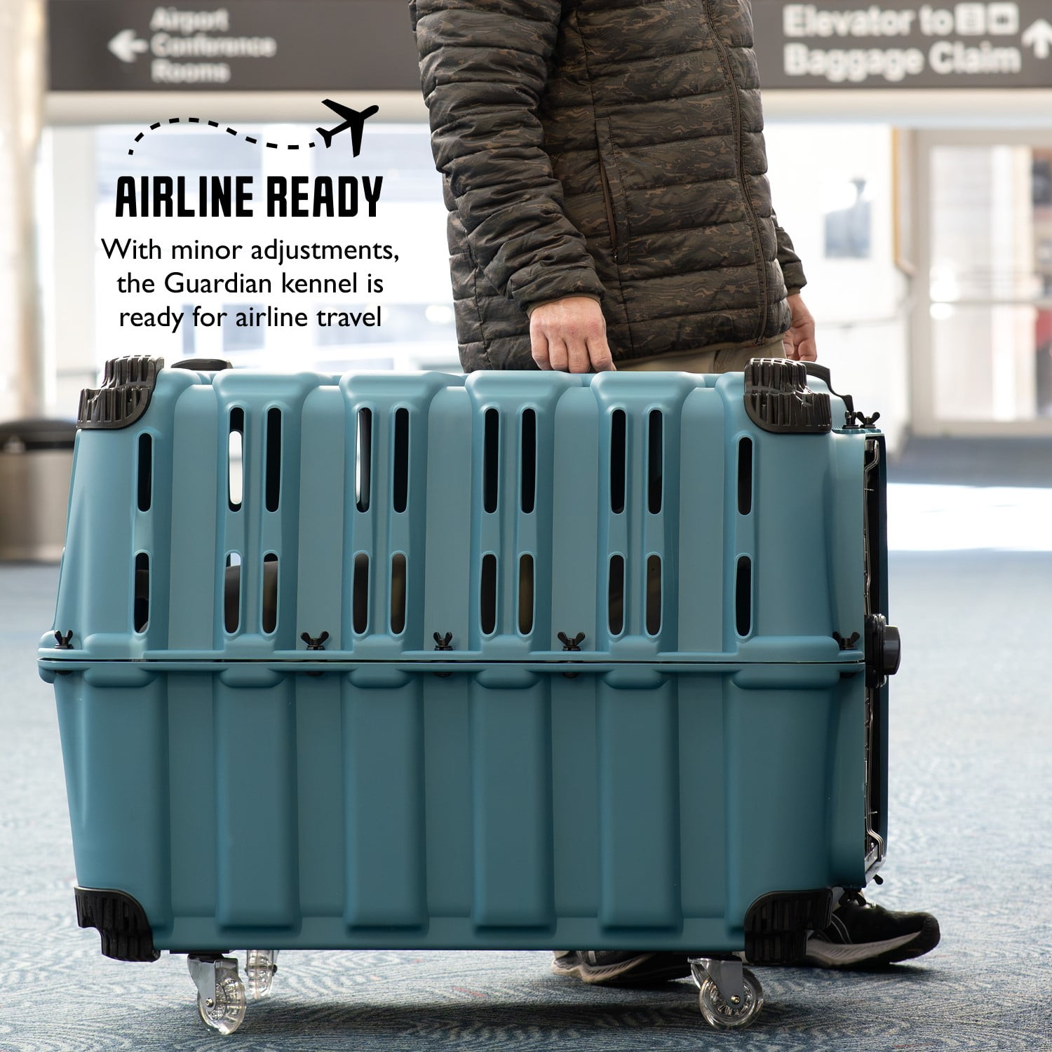 Sport Pet Designs, Dog Kennels, Guardian Heavy-Duty Plastic Dog Kennel, Blue, Large Assembled Kennel Dimensions: 36.9″L x 24″W x 26.4H, 30.6 pounds Shock-Resistant Durability: The Sport Pet Guardian Kennel ensures your pet’s safety during travel with its robust, shock-resistant construction, built to withstand unexpected jolts and bumps. Easy Access: Effortlessly enter and exit with the full clearance steel frame door that enhances security and grants seamless accessibility for your pet. Stability and Protection: Padded corners and a 3-bolt pin latch not only add stability but also safeguard your pet and the kennel’s surroundings, creating a secure and cozy space for your pet’s relaxation. On-the-Go Convenience: The kennel features detachable wheels and integrated water & food dishes, making travel a breeze while keeping your pet nourished and comfortable. Customizable Experience: Tailor your pet’s journey with optional accessories like our Guardian Roll Cage (sold separately), accommodating your unique needs and adventures. Unforgettable Adventures: The Sport Pet Guardian Kennel is your pet’s ideal companion, ensuring safety and comfort for all your travel and adventure plans.