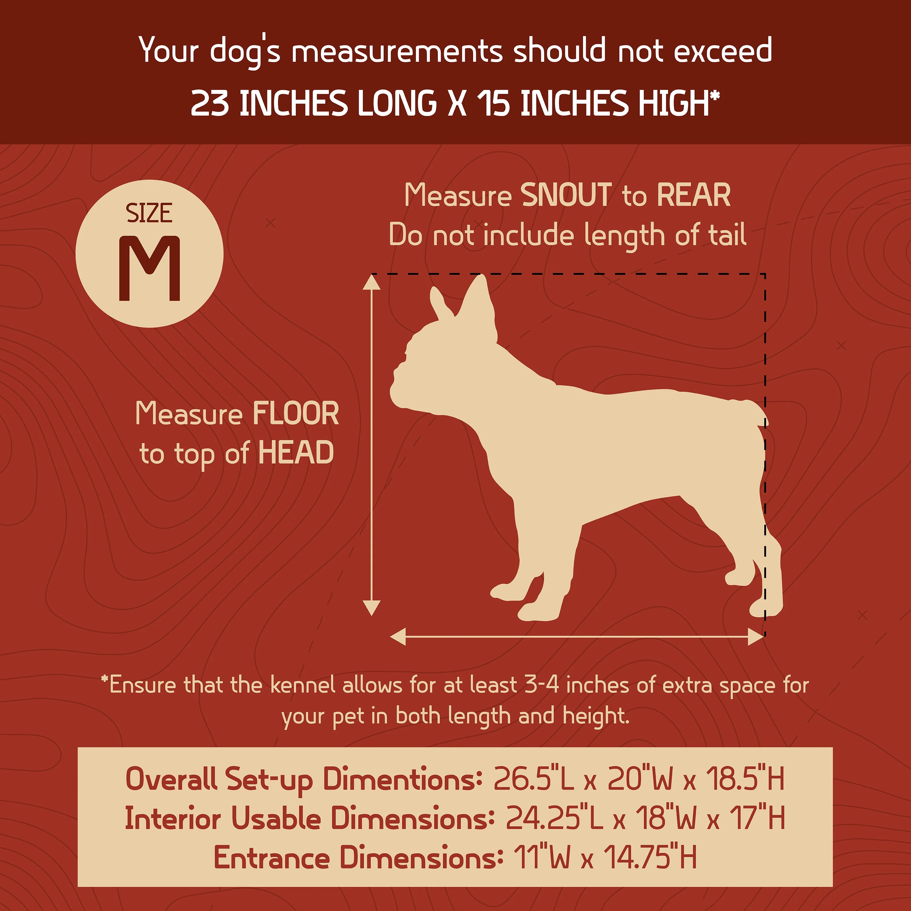 See size chart photo and video to help determine correct size and features Age range description: All Life Stages For kennel trained pets only. Tie down holes for bungees as required by airlines. Wheels snap on and off as needed. Durable construction makes for easy assembly IATA airline approved. 2 dishes, 4 live animal stickers, metal bolts and nuts included For dogs up to 30 lbs. Set-up size: Without Wheels – 26.5” L x 20” W x 18.5” H & With Wheels – 26.5” L x 20” W x 20.75” H inches; 11 lbs. Your dog’s measurements should be under 24″ L x 17″ H for the Medium kennel