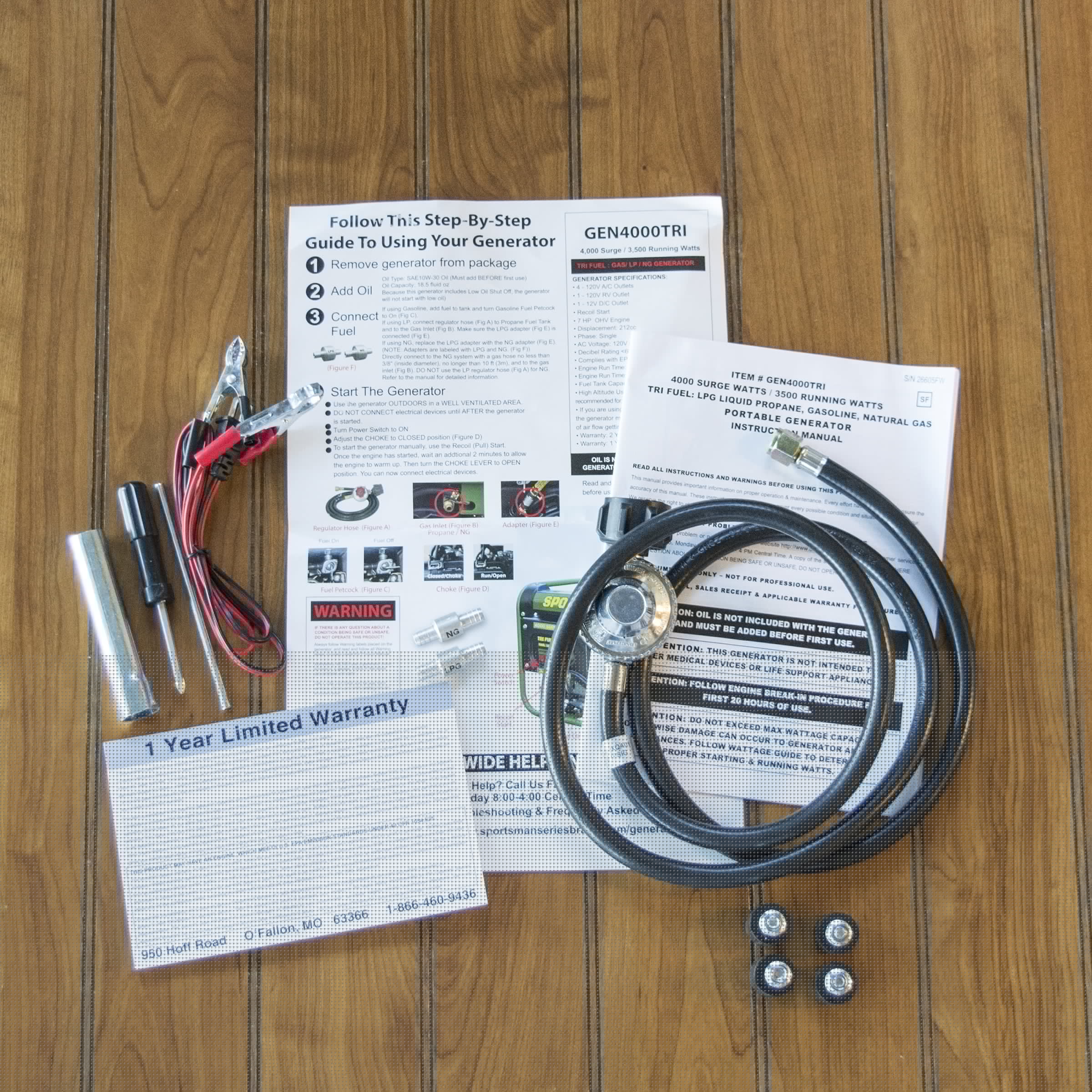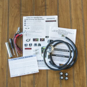 – Comes with separate adapters for LPG and natural gas, a DC connector wires for charging 12 Volt automotive-type batteries, a spark plug wrench, a screwdriver, and a 5 ft. regulator hose kit