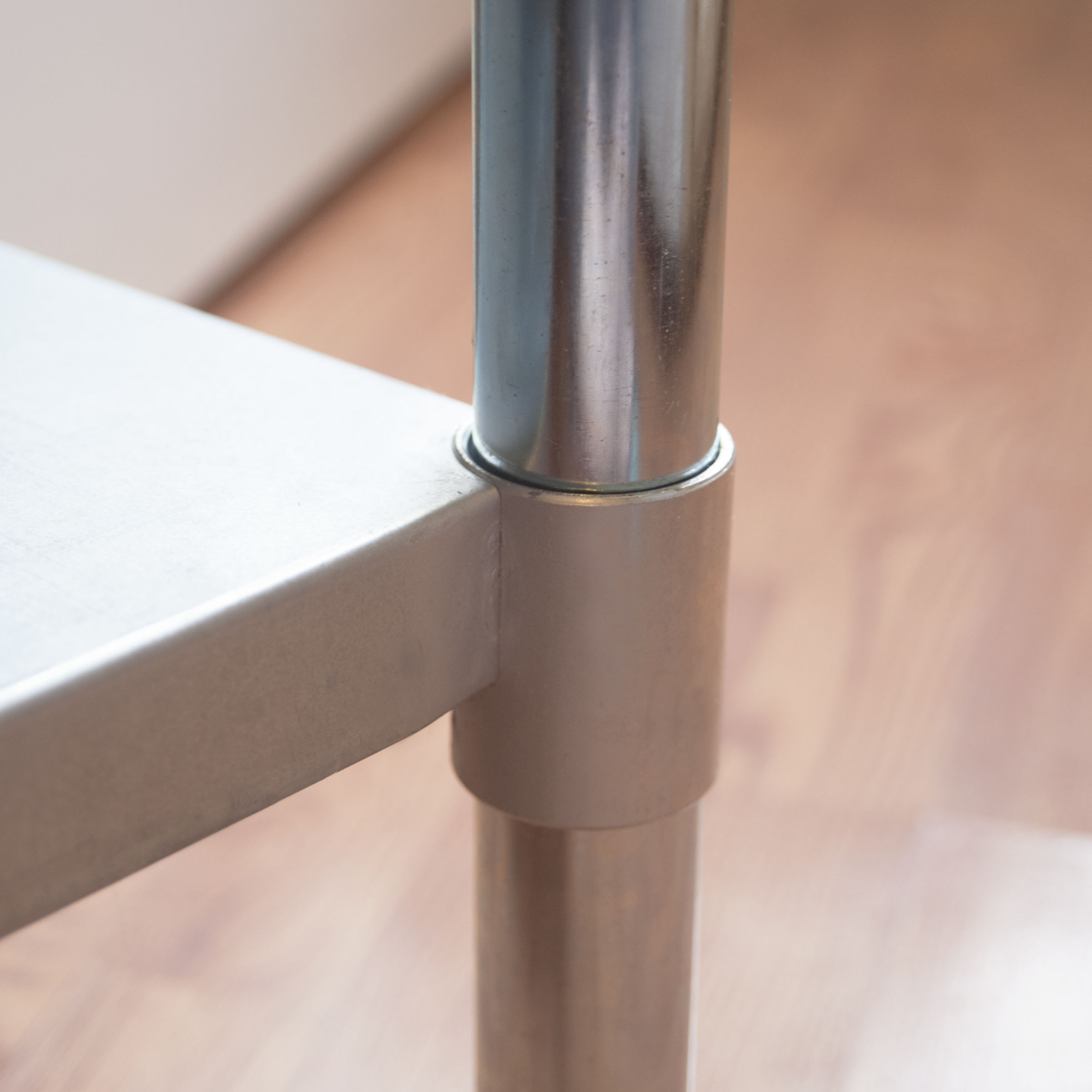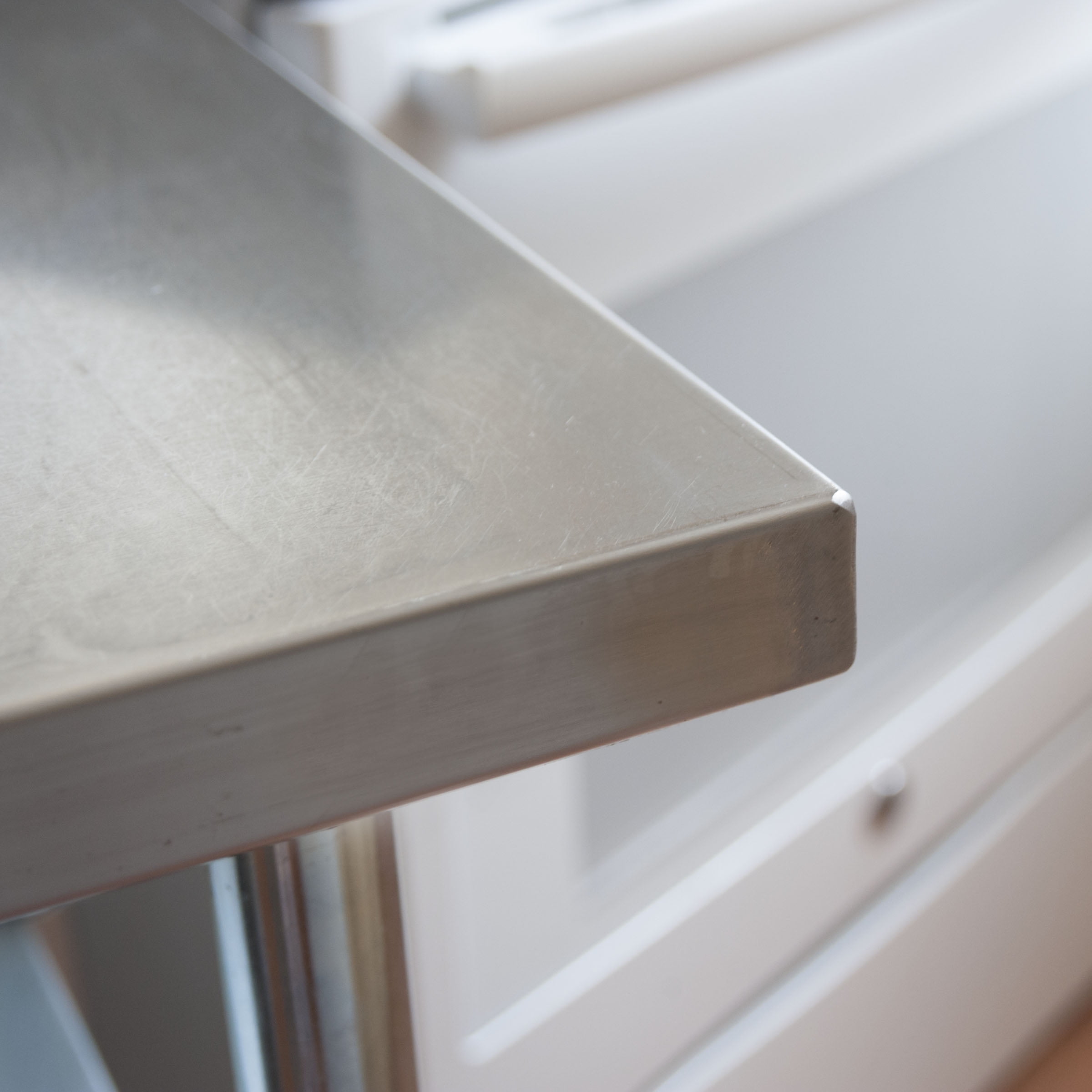 Constructed from 18 gauge 403 stainless steel for durability and easy cleaning Heavy duty 16 gauge welded steel supports Four 3 inch swivel casters glide easily over tile, concrete, or hardwood, 2 locking casters Adjustable chrome plated shelf for storing appliances and supplies Max weight capacity 330 lbs, measures 24 in. W x 36 in. L x 35 in. H Assembles in minutes Caster adjust to provide a level work surface NSF Approved