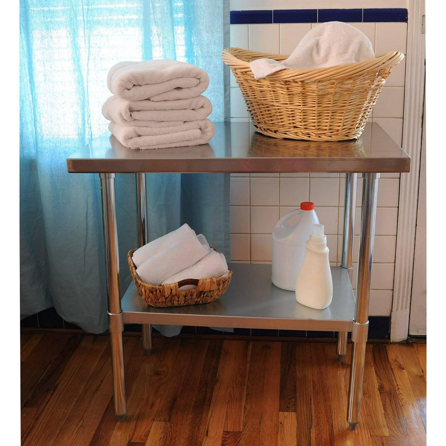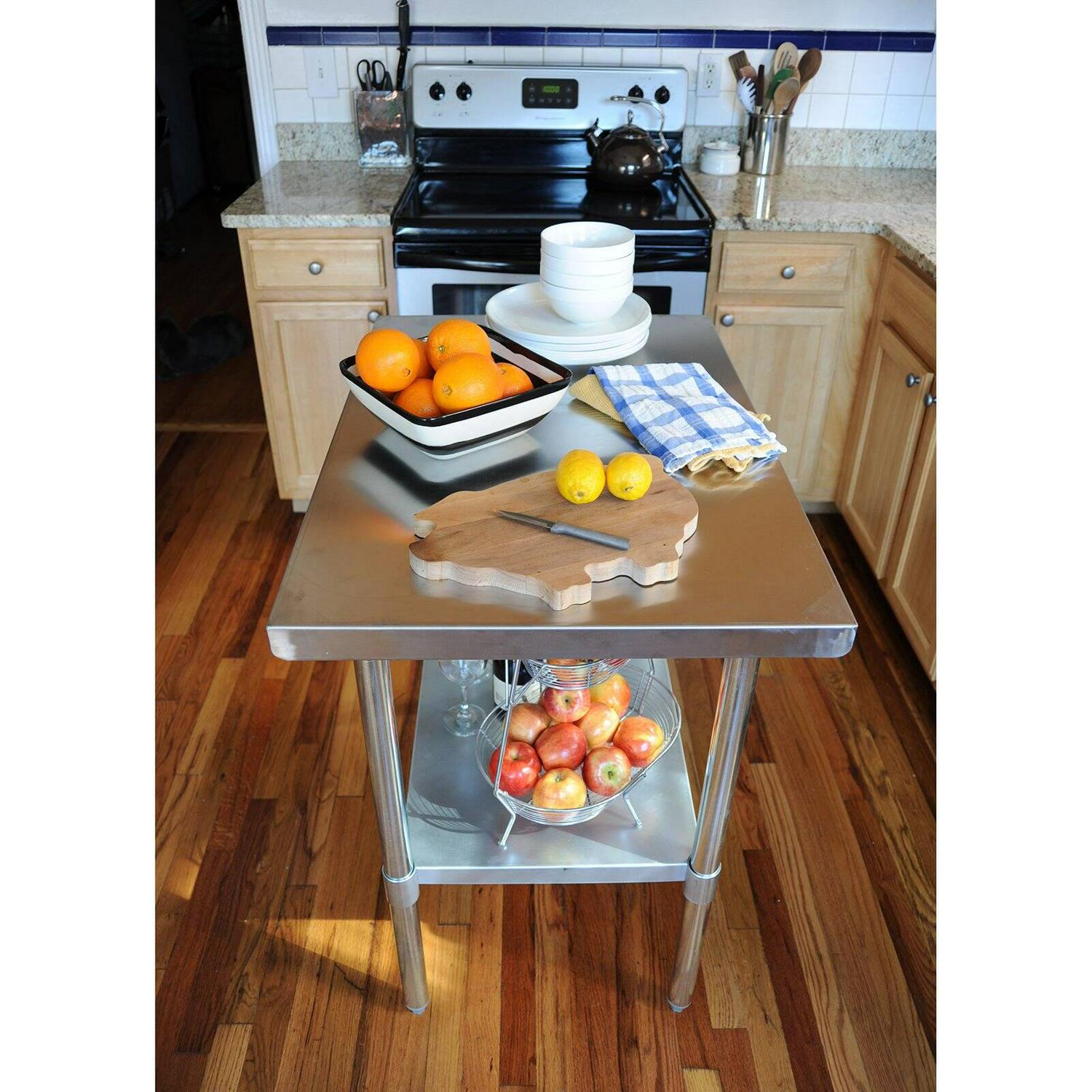 The 35 in. H is ideal for cooking and working without making your back ache. Adjustable solid chrome plated steel shelf fits under the table and provides additional storage space for supplies. Curved edges help prevent injuries from accidental bumping and injury. Attractive contemporary design fits into any decor. Max weight capacity 330 lbs.