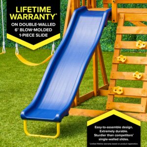 – 6 ft double walled blow-molded slide comes with lifetime warranty (competition uses multi piece, plastic sheet as slide)