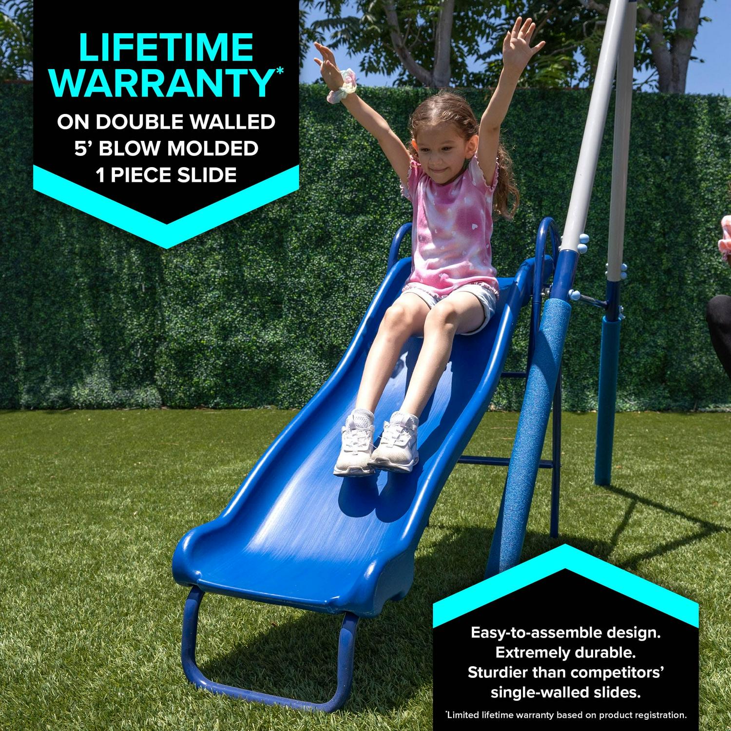 – Large and durable 5-ft double walled blow-molded slide (competitors use single wall slide), comes with lifetime warranty