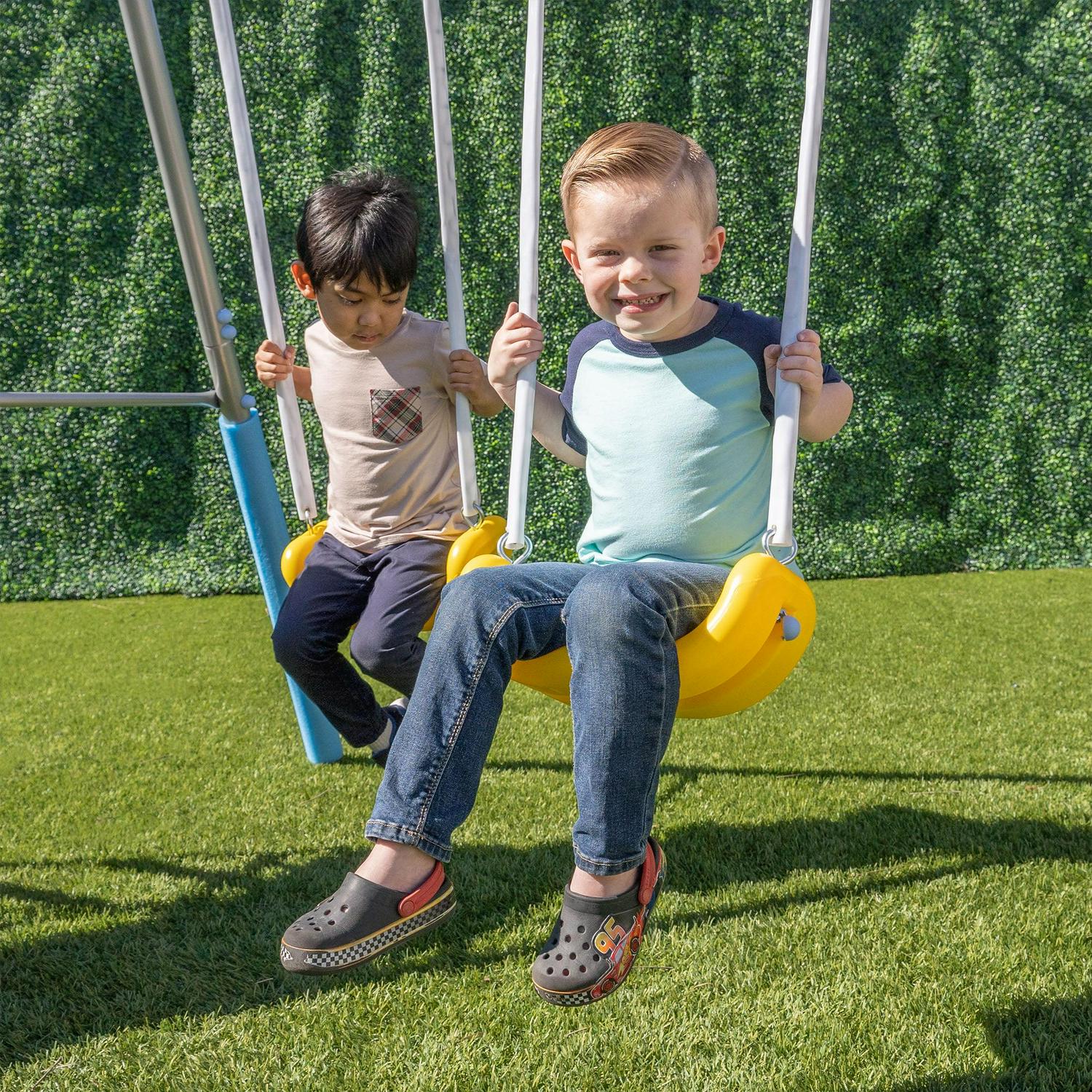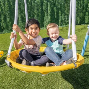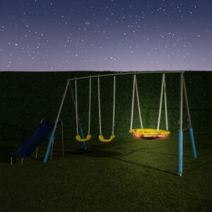 Sportspower, the Most popular brand in the market, presents the Comet Metal Swing Set! The 2-person saucer swing lights up and transports them into a different galaxy as they swing! This Sportspower swing set also includes 2 (two) blow molded swings and a 5-ft wavy double-wall blow molded slide for endless hours of fun. The swing set frame is constructed of corrosion-resistant powder-coated metal. The frame legs also include foam padding for extra safety when playing. The LED saucer swing lights up the night making it perfect for evening time play. All Sportspower products meet or exceed all ASTM safety standards, so kids and parents can both enjoy the Sportpower Comet Metal Swing Set with peace of mind.