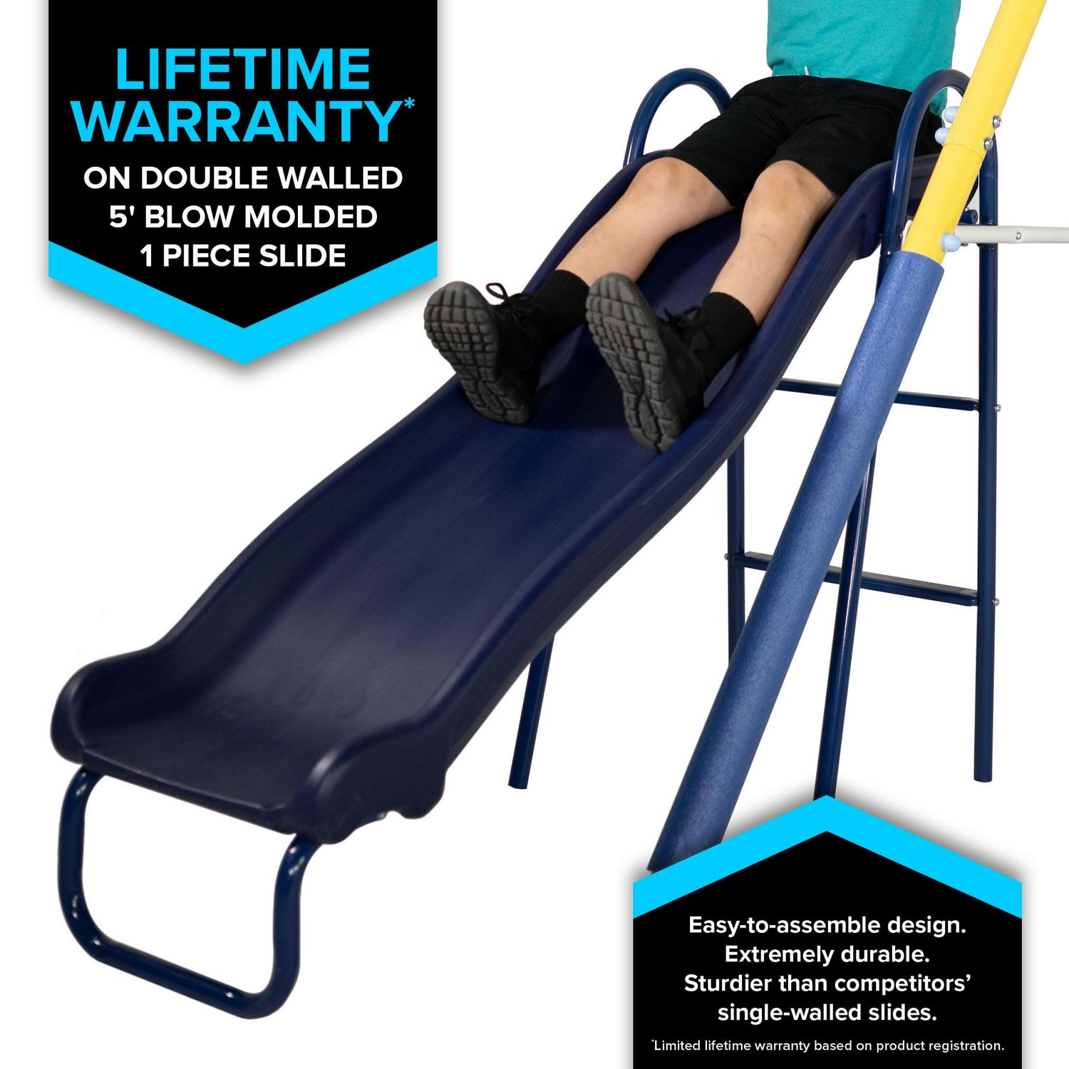 - Large and durable 5-foot one-piece blow-molded slide for easy assembly
