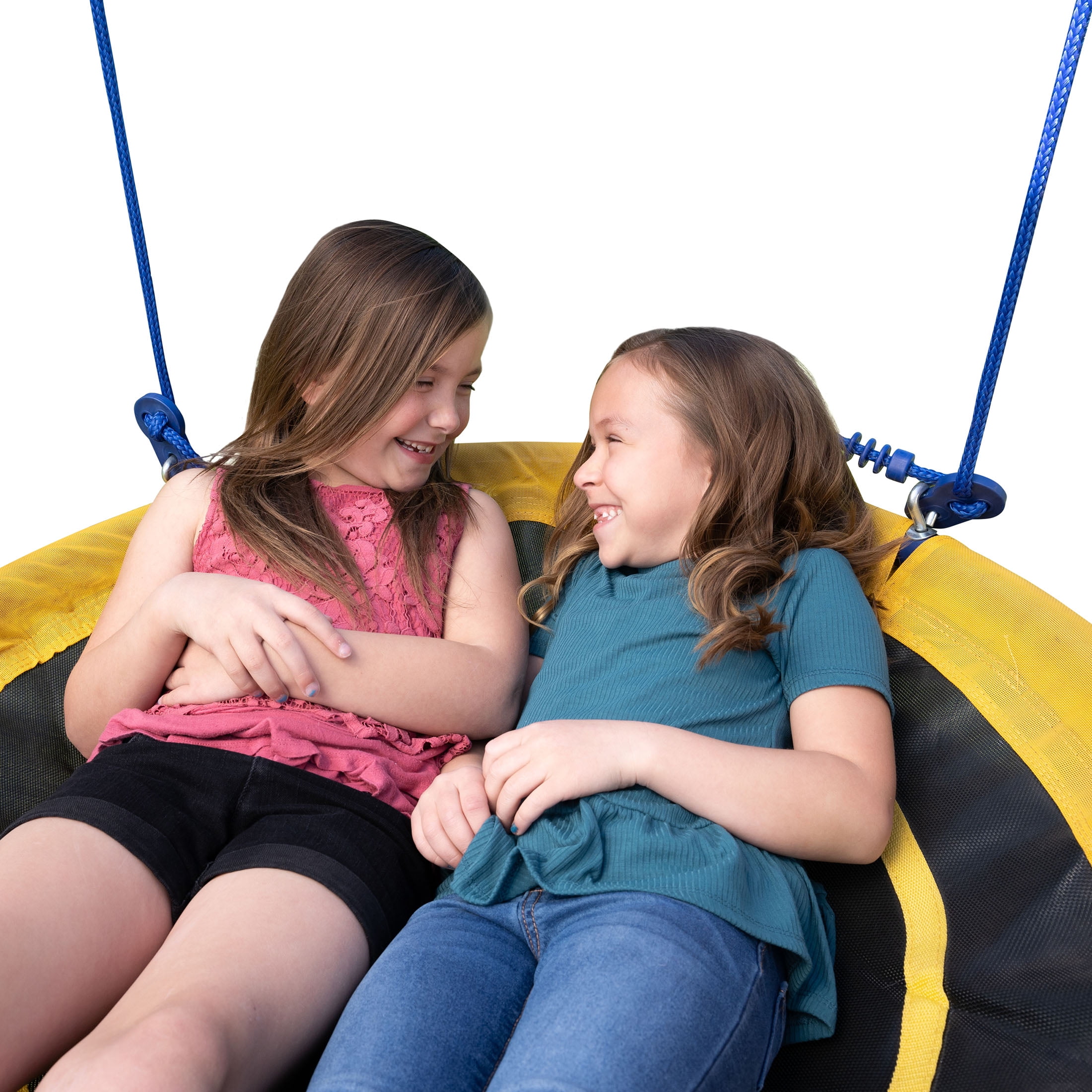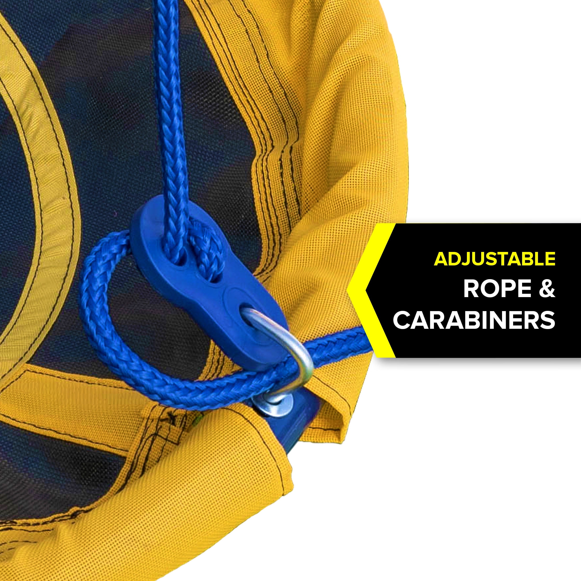 Sturdy adjustable rope and carabiners included to secure saucer swing UV resistant rope and mesh Powder coated steel frame Reinforced inner netting for extra protection Includes 2 heavy-duty straps for hanging Meets or exceeds all ASTM safety standards