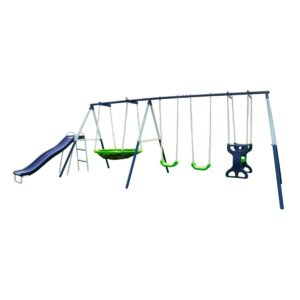Sportspower Outdoor Rosemead Metal Swing Set with Roman Glider, Saucer, and 6′ Double Wall Slide with Lifetime Warranty