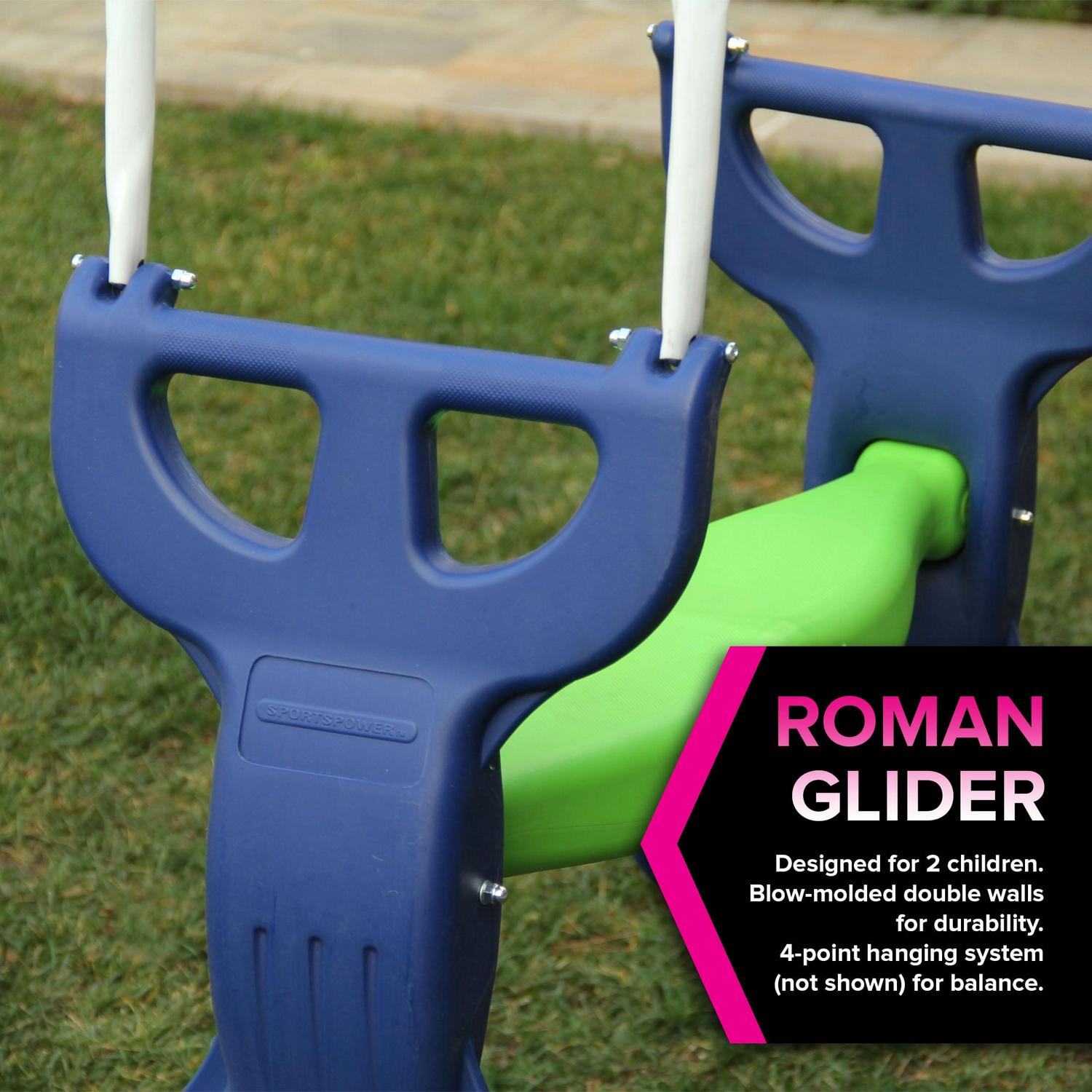 – Large 2-person blow-molded Roman glider constructed with an extra thick hanger and handles for better grip