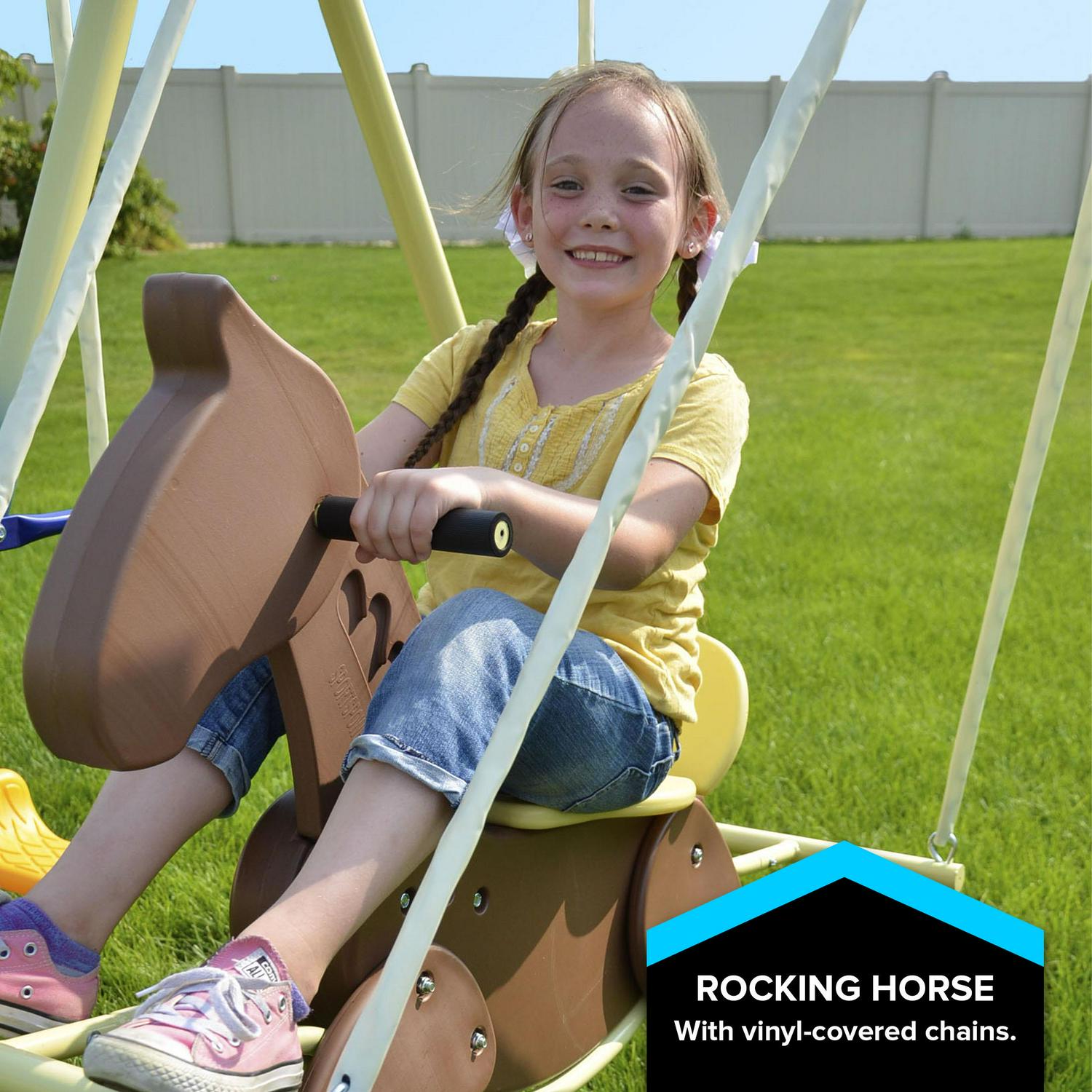 The Sportspower Super 8 Fun Metal Swing Set provides hours of active fun for your family. With 2 swings, a rocking horse and more, this action-packed swing set will undoubtedly become a warm-weather favorite. Your family can get exercise and fun simultaneously with the Super 8 Fun Metal Swing Set. The Super 8 was featured on Safe Smart Living’s Top 10 Picks List for Best Swing Sets.