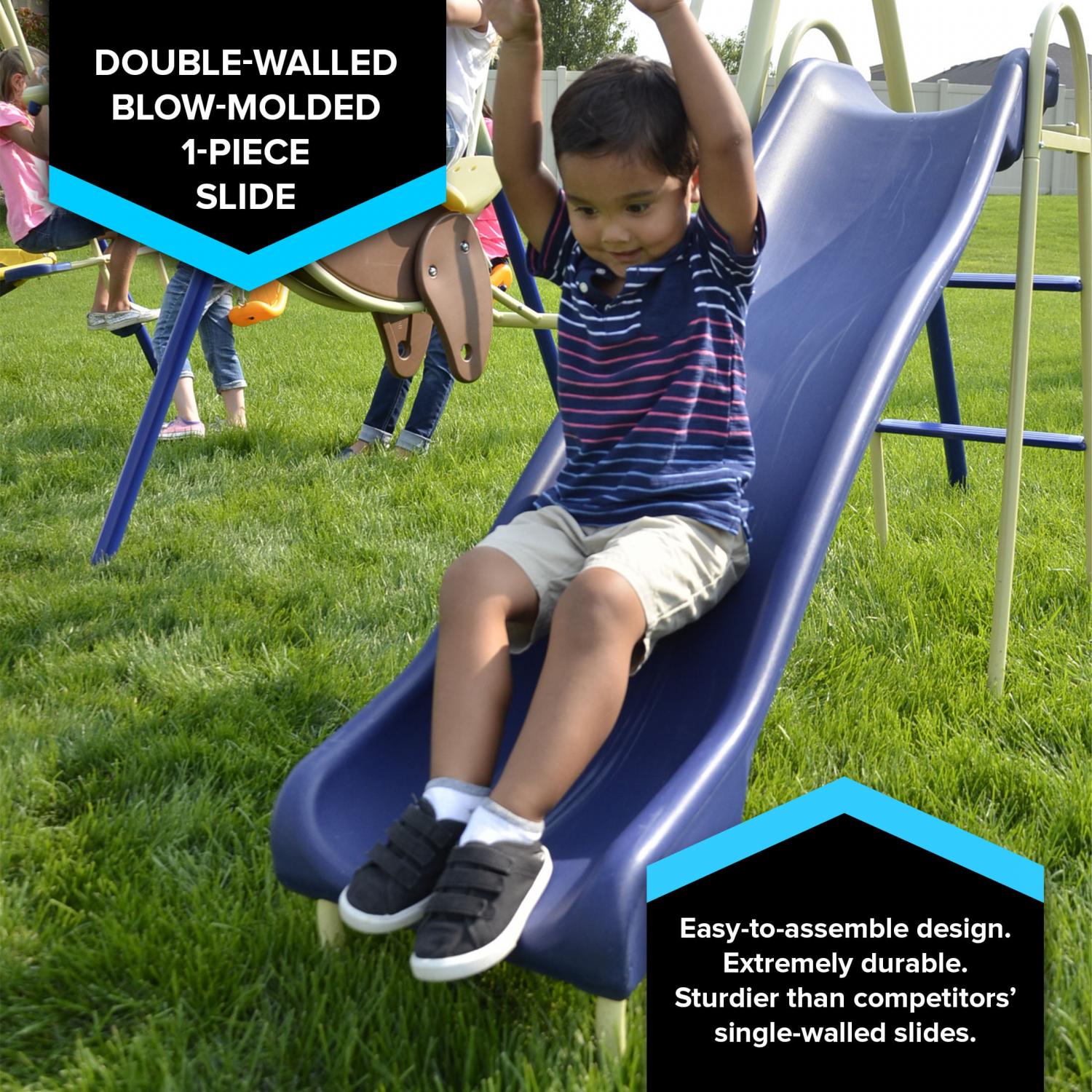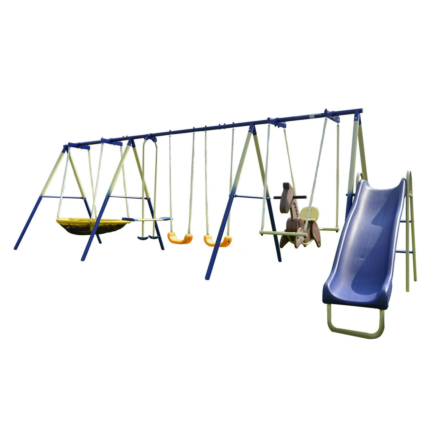 Sportspower Outdoor Super 8 Fun Metal Swing Set with 6ft Heavy Duty Slide, Saucer Swing, and Rocking Horse