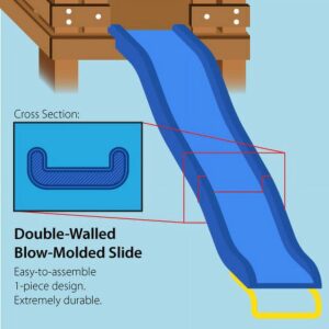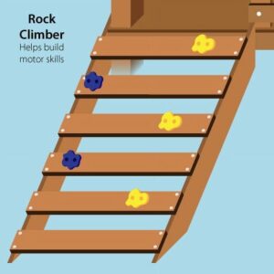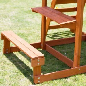 The Sunnyslope Wooden Swing Set by Sportspower brings smiles and hours of fun for your children in the comfort of your own backyard! With many climbing, swinging and sliding play features, your kids will find something they will love. Imported from a sustainable forest from Northern Europe, this swing set s sturdy large wooden construction is crafted with Northern Europe Scandinavian fir that is denser and safer than competitor swing sets made from China Cedar. With two sling seats and a blow-molded trapeze bar, your kids can start swinging into action right away. They can also zoom down the 6-foot blow-molded slide and use the durable grips to quickly race back up the rock climbing wall. The excitement does not stop there – kids can also play on the picnic bench or in the sandbox below the fort (sand not included) for even more possibilities for fun! Bring the Sunnyslope Wooden Swing Set home and watch your kids’ imaginations grow!