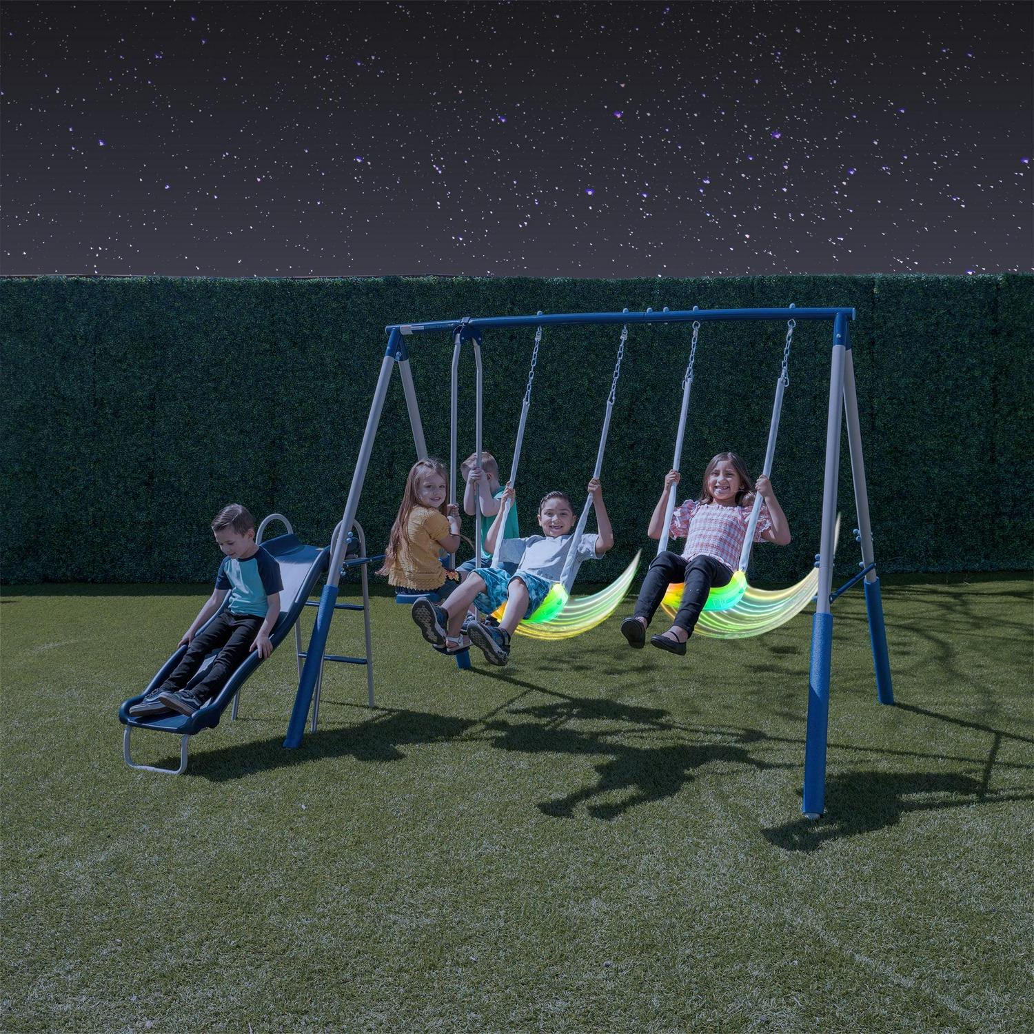 Your child s day will instantly brighten up with the Sportspower Super Lights Metal Swing Set. The 2-LED blow-molded swings light up and transport them into a different galaxy as they swing. The swing set also includes a 2-person glider swing and a durable blow-molded slide for countless hours of play time. All chain swings are adjustable to accommodate the heights of growing kids and are covered with vinyl to protect hands. The frame legs have foam padding for additional safety while being used. The powder coated metal frame helps to prevent corrosion. The 2-LED swings light up the night making this swing set perfect for evening time play. All Sportspower products meet or exceed all ASTM safety standards, so kids and parents can both enjoy the Super Lights Metal Swing Set with peace of mind.