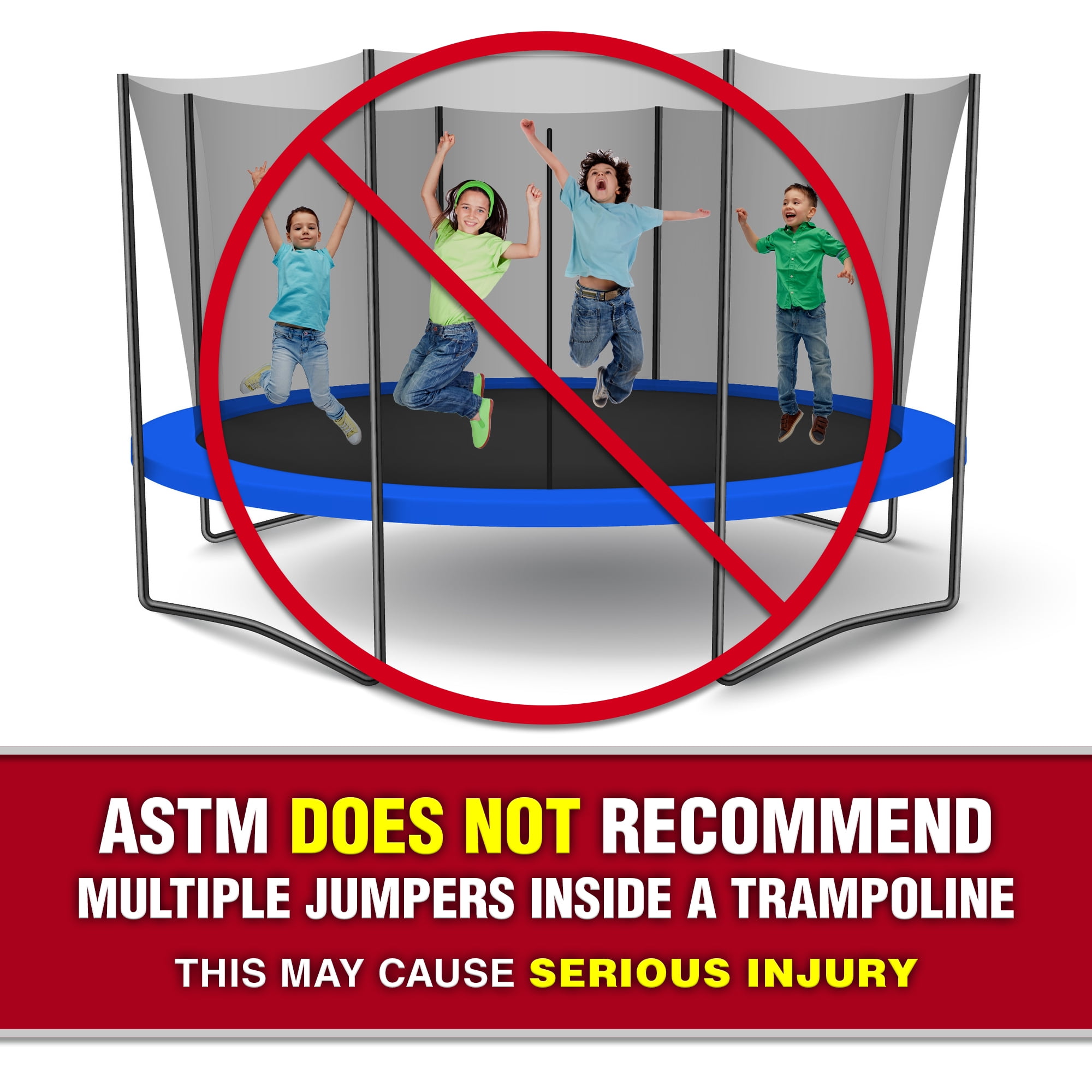 UV-resistant jump mat withstands over 5,000 hours of UV testing Foam padded spring covers and frame poles for safety UV-resistant polyethylene safety enclosure net with zippered entrance keeps children safely inside the trampoline Rust-resistant, galvanized steel frame