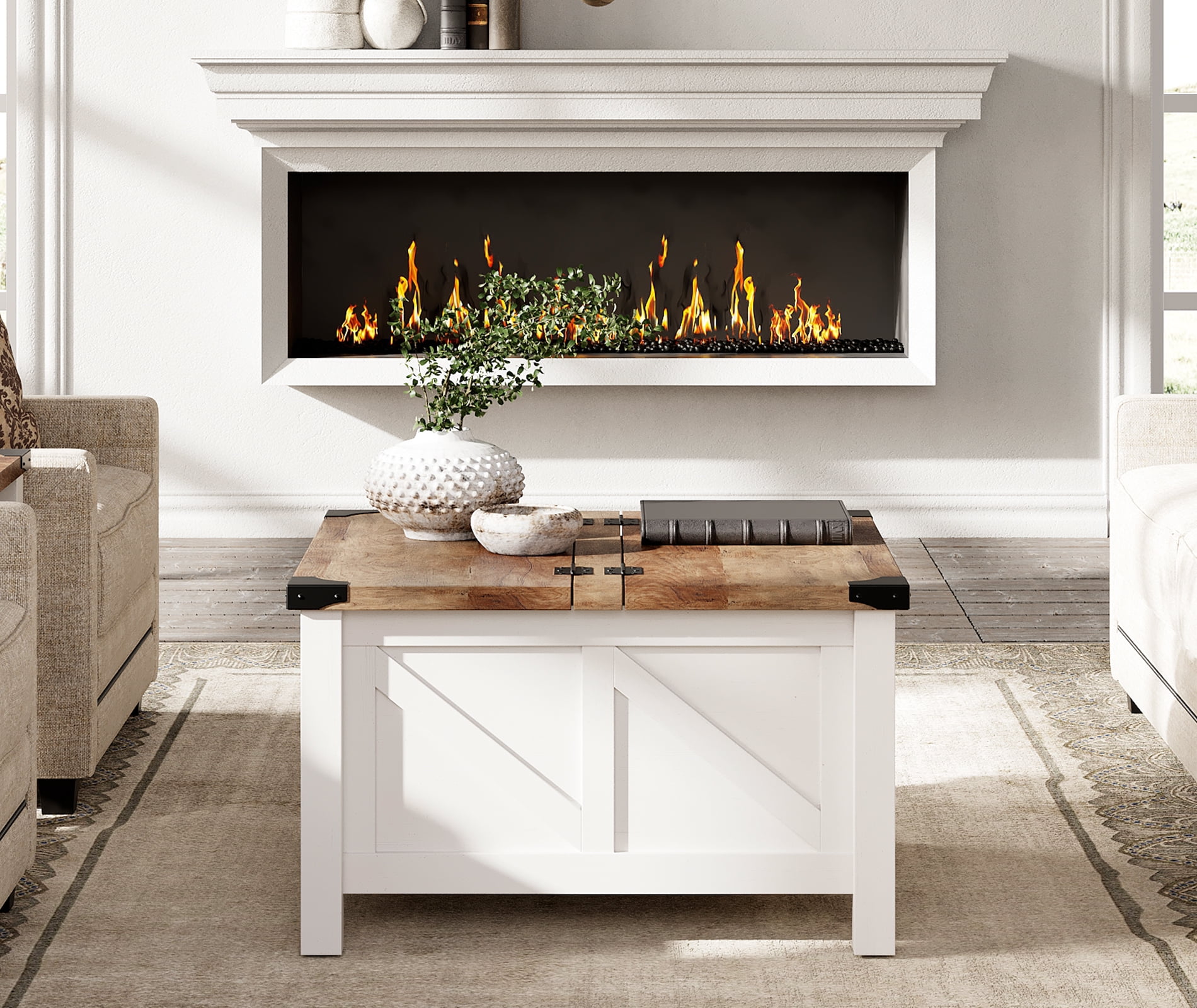 【CLAMSHELL DESKTOP】Unlike other coffee tables, this storage coffee table adopts a clamshell design, the top board can be turned 90 degrees freely, and the use of gas struts to cushion the drop, to ensure safety and strengthen the protection of the table. 【LARGE STORAGE SPACES】The large square coffee table comes with a hidden storage cabinet of 272L space for organizing and storing your daily necessities. Spacious table top (60 “Lx30 “W) for all your daily needs. 【STURDY & QUALITY ASSURANCE】Wood coffee table is made of thickened materials, durable, strong and easy to clean.The maximum total weight is 140 LBS. The top board can bear up to 60LBS and the bottom 80LBS. 【EASY TO ASSEMBLE】A clear instruction is included, which has straight forward illustrations and descriptions. Each screw and pin has its own code and boards are clearly labeled to help you easily understand the process of assembling this rustic coffee table