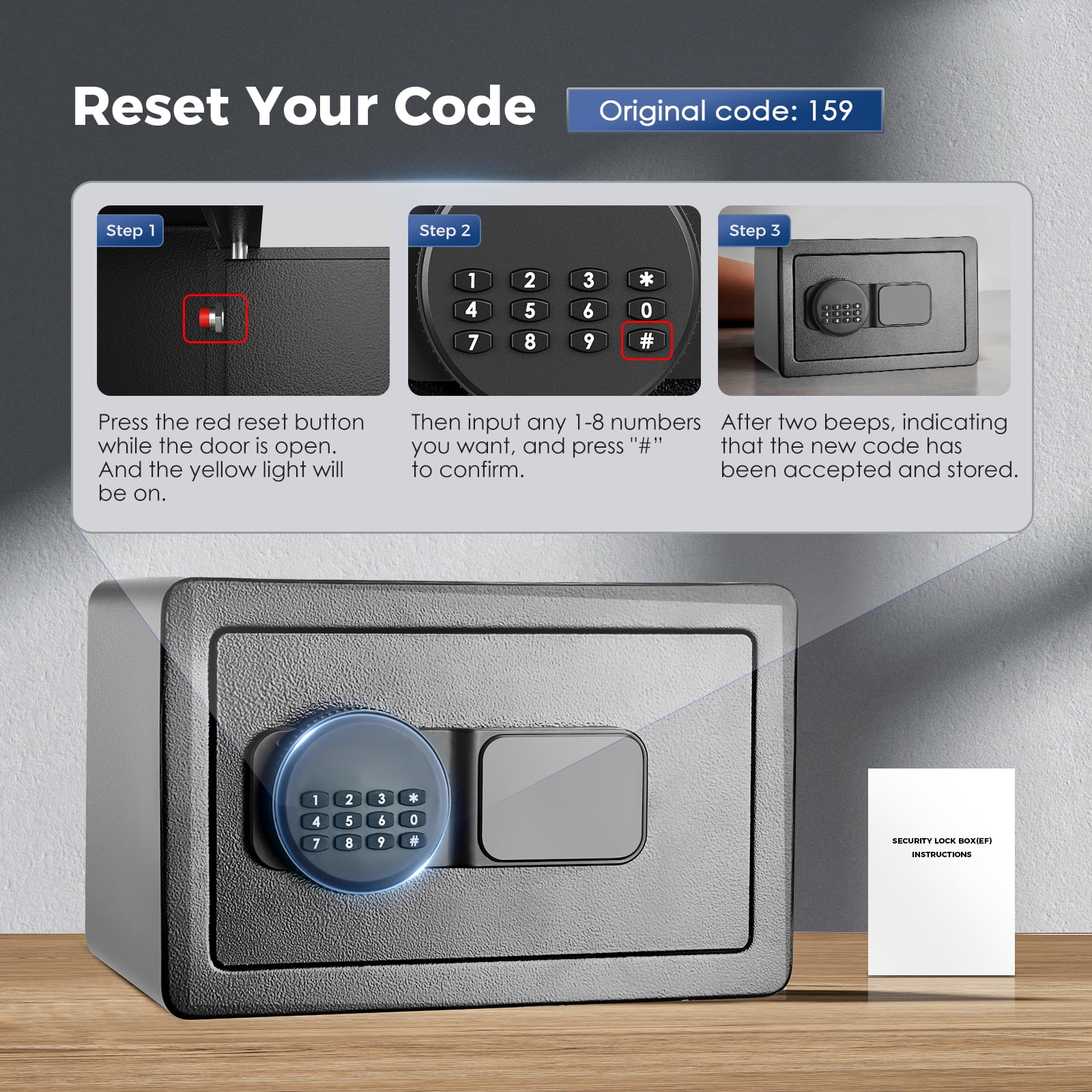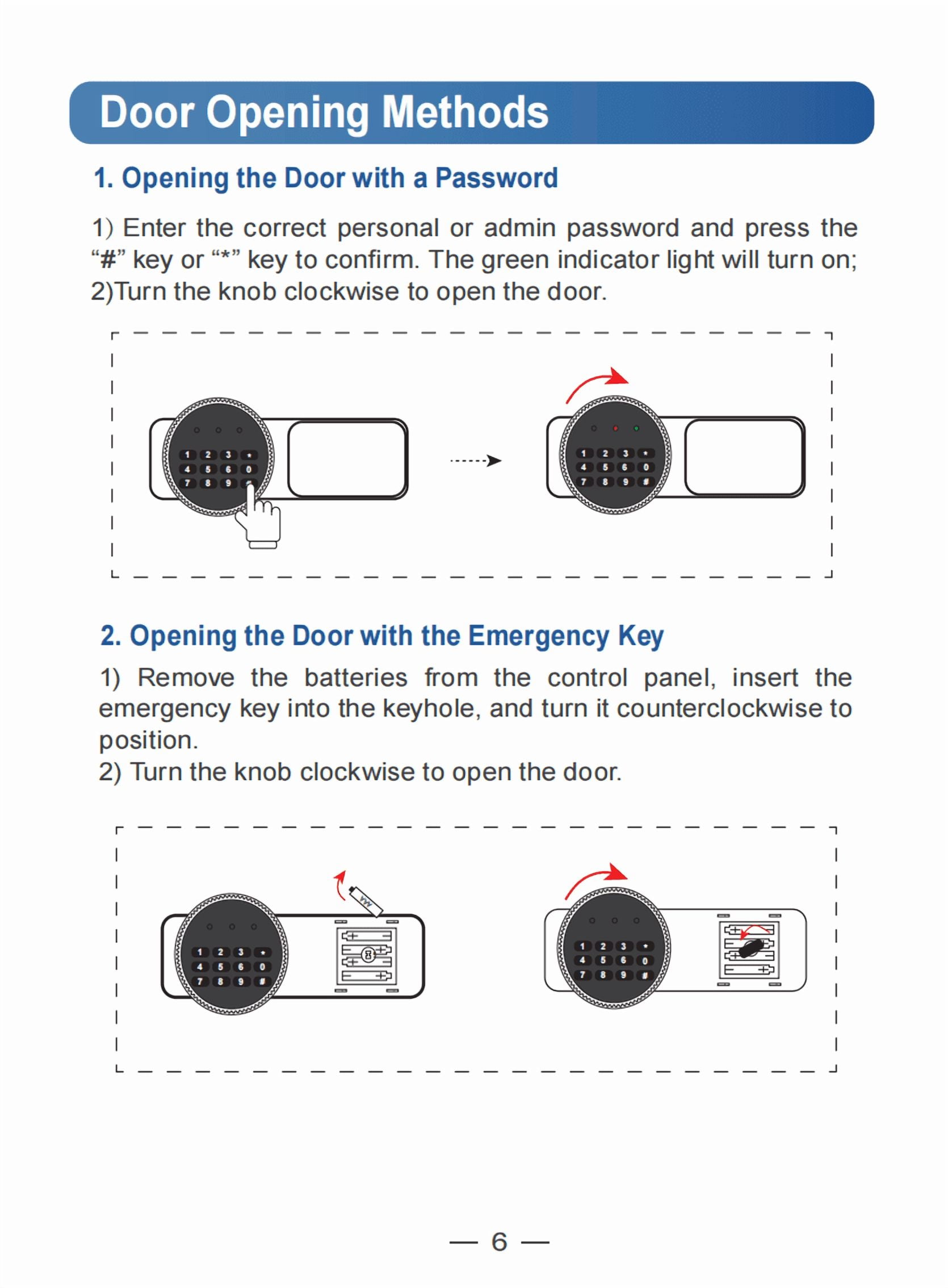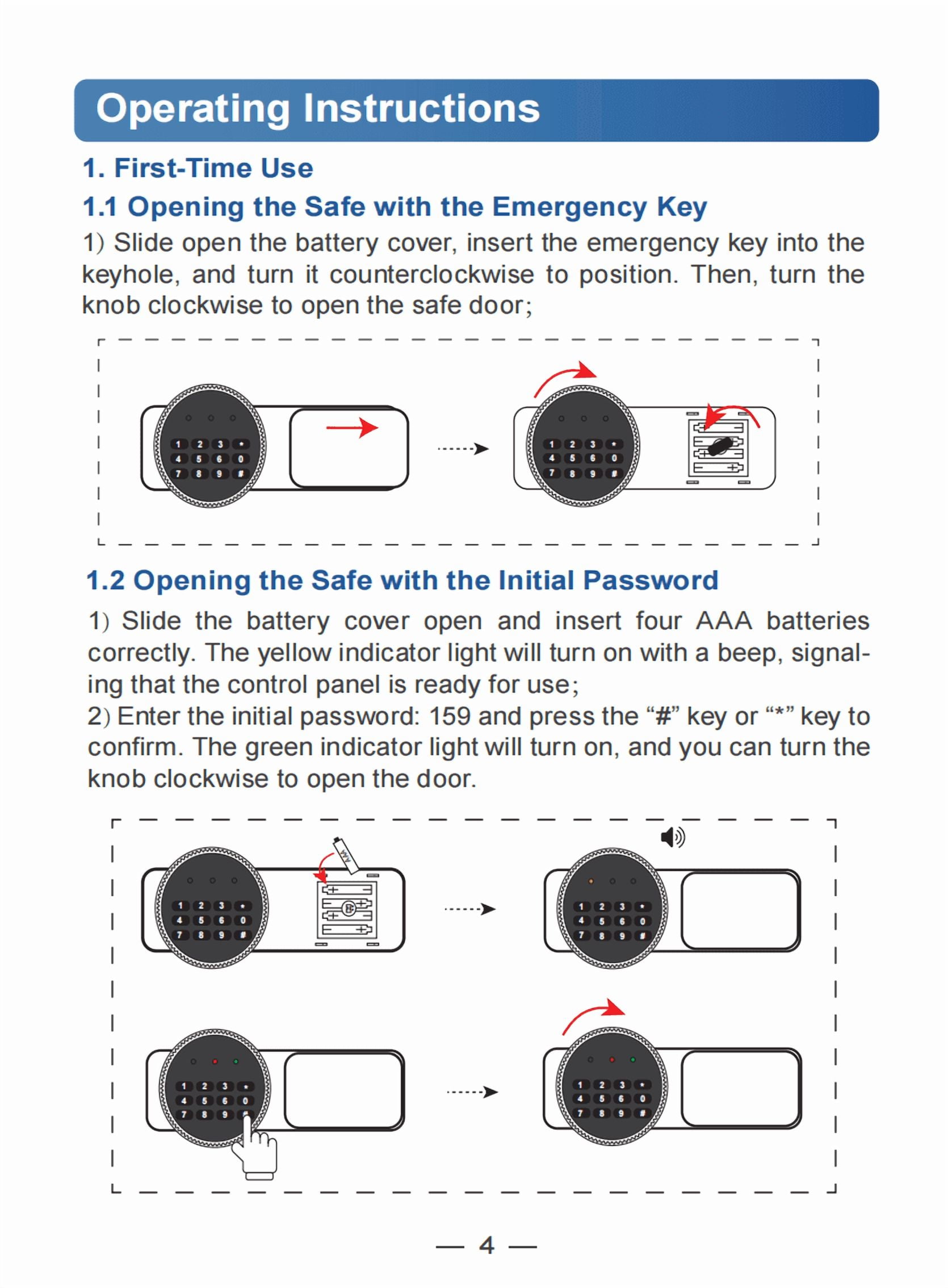 ① password + rotary button, ② emergency key + rotary button. You can set a 3-digit combination for your safe. If you forget the password or the battery is dead, you can use the hidden emergency key to open the sentry safe fireproof waterproof box. (please keep the emergency key out of the safe). The default password is “159”.