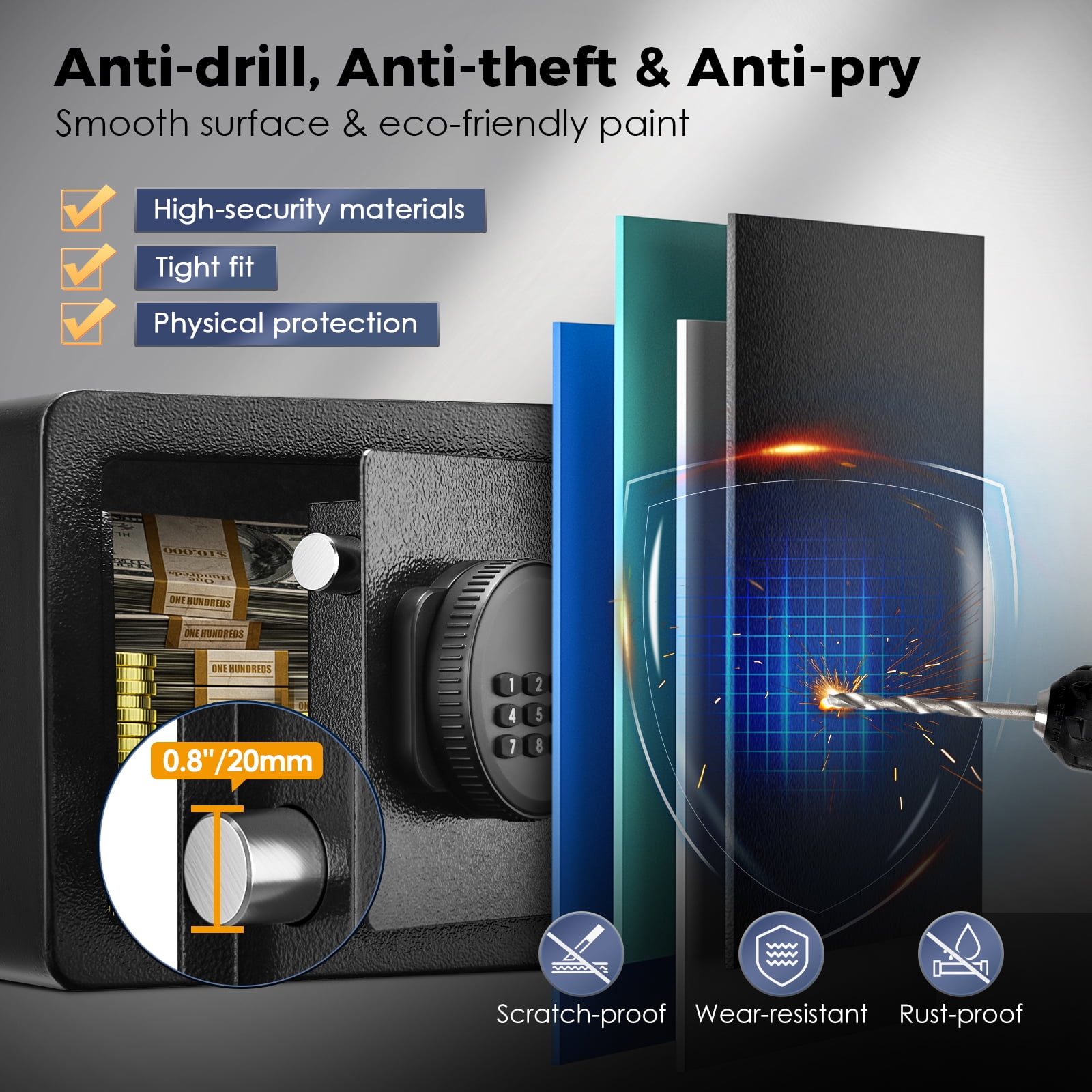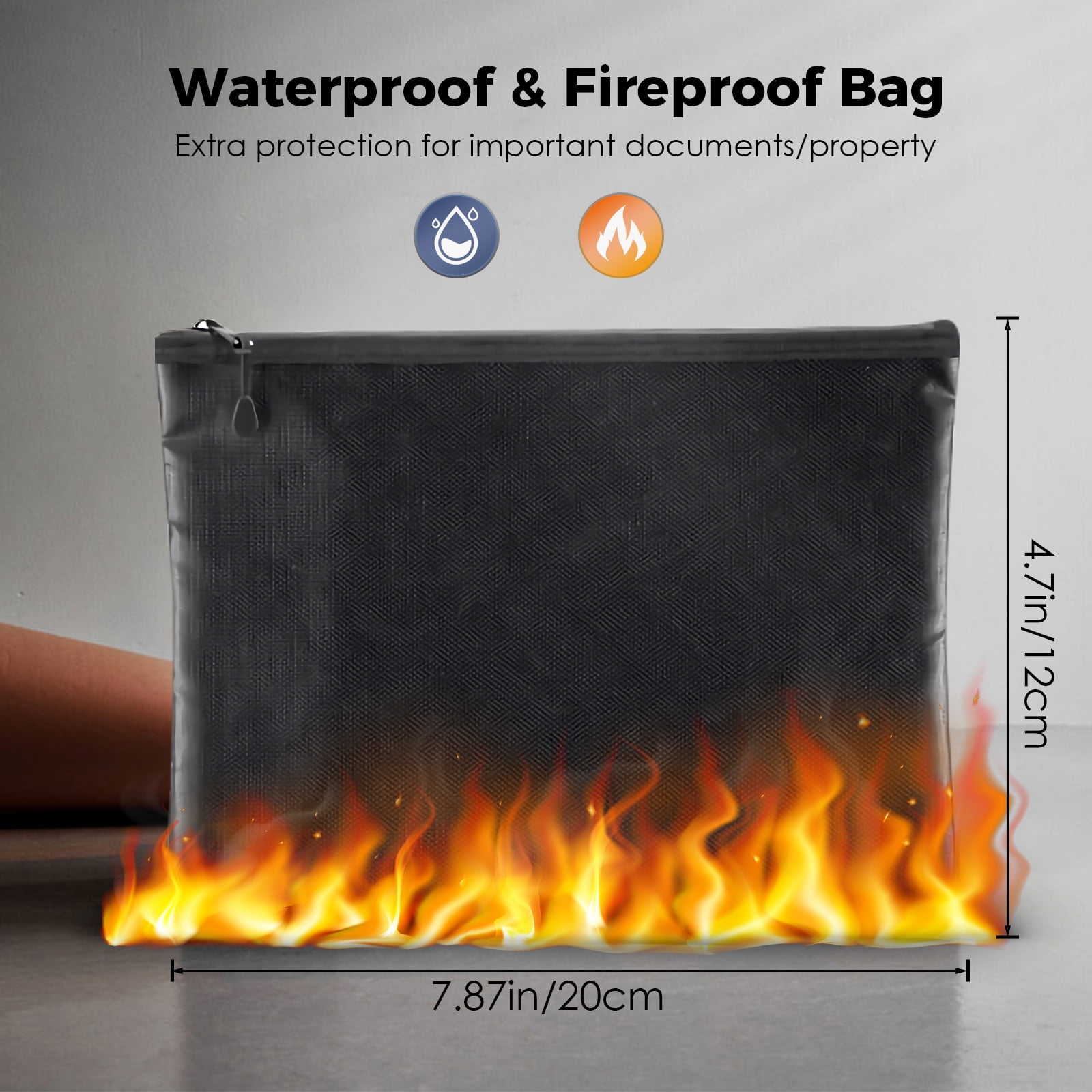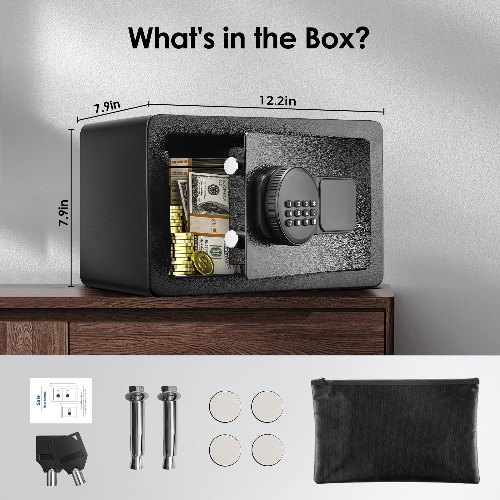 Our safe box is designed with 2*18mm solid locking bolts, built-in hinges, anti-collision, and anti-pry micro slits, with excellent anti-prying and anti-theft performance. External dimensions of our safes: 12.2″*7.9″*7.9″. With an additional fireproof and waterproof money pocket (9.36×13.65 inches), the combination safe and fireproof bag will protect your valuables from fire, hurricanes, and earthquakes.